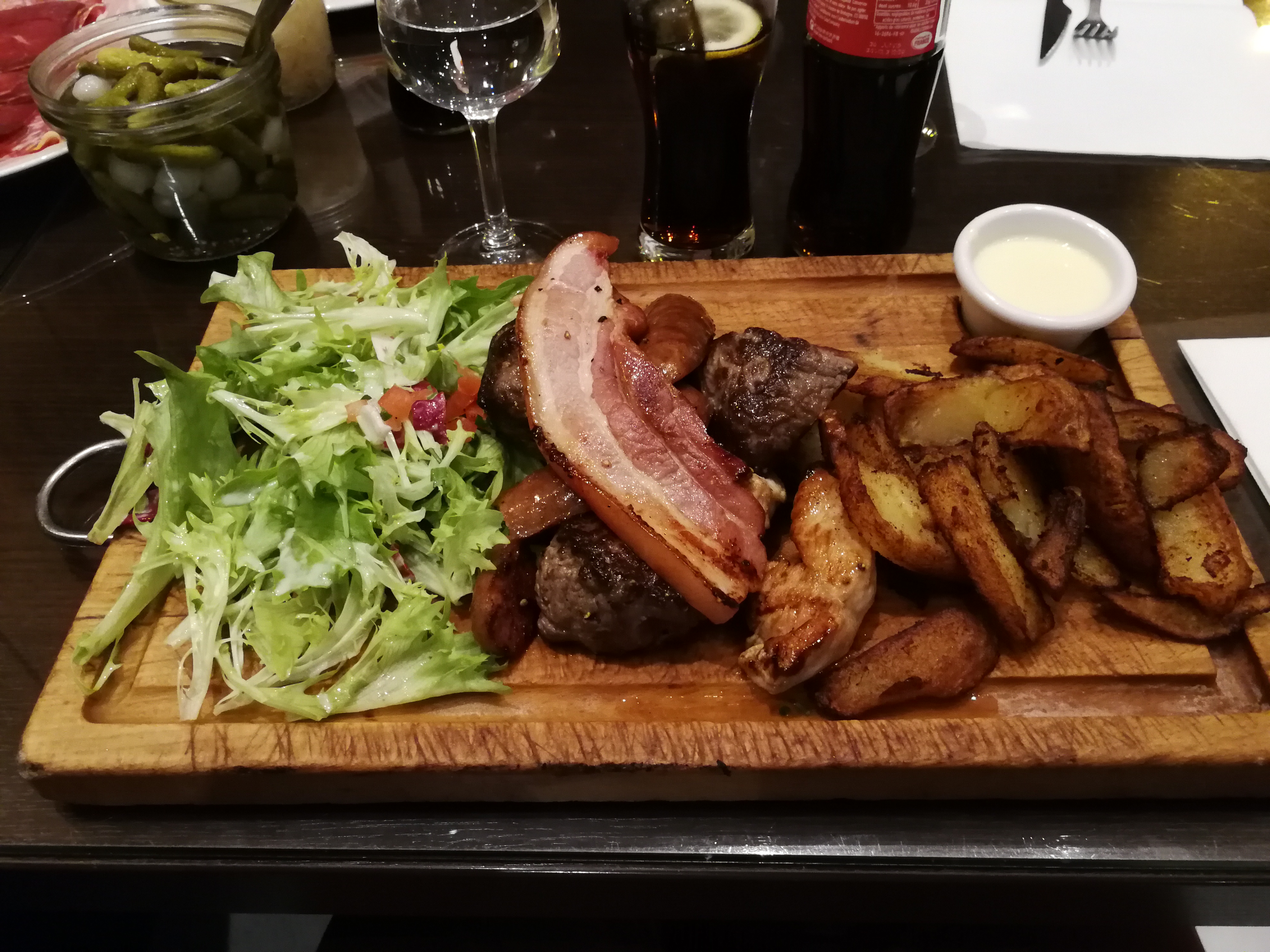Avec un collègue , nous avons pris une potence ...copieux du point de viande , le gratin par contre était insignifiant : un peu de pommes de terre qui se désagrégeaient , du poivron le tout dans une sauce plus proche de l'eau que ...de la sauce. bref....pas de la grande cuisine....