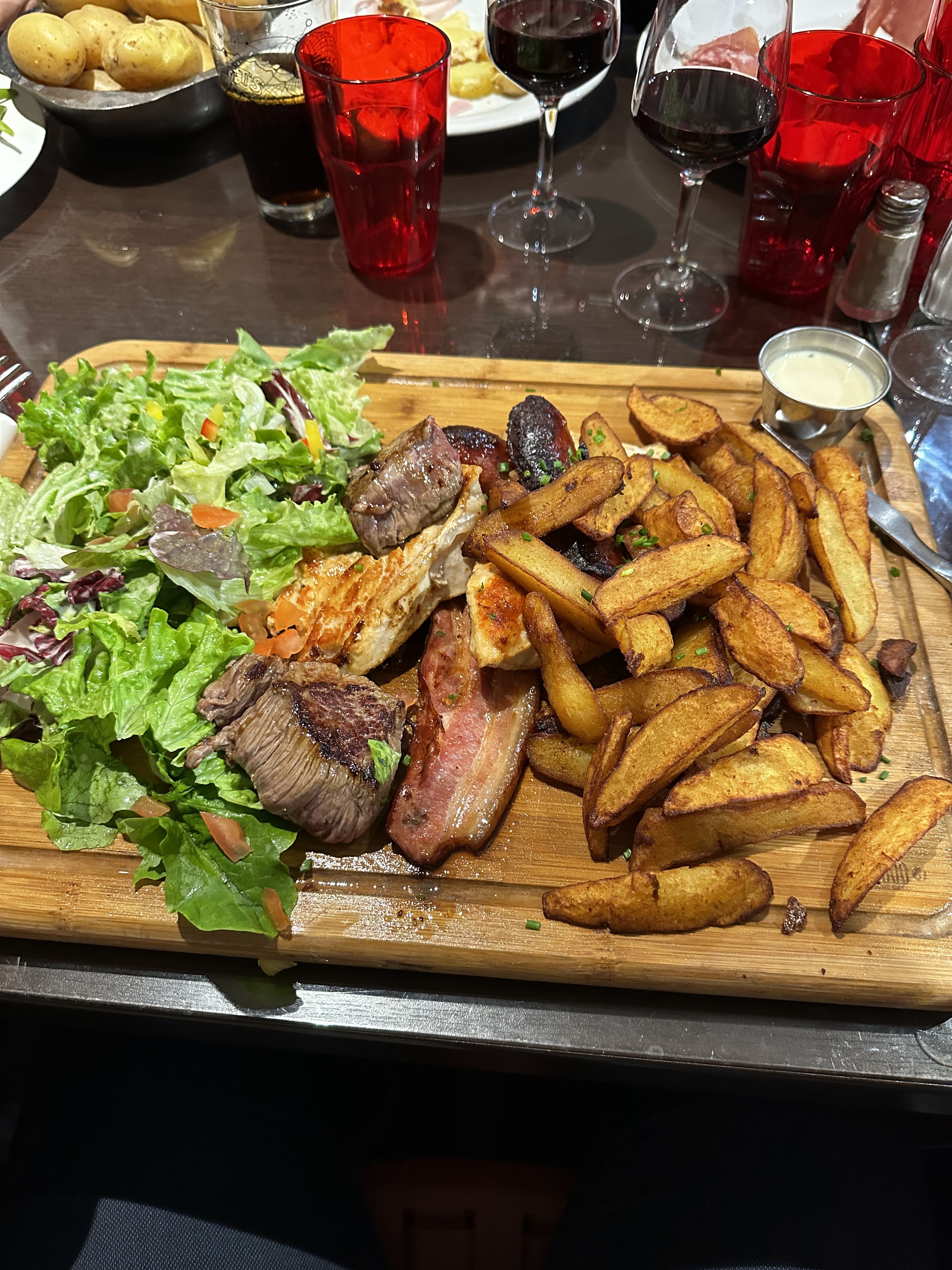 Particulièrement déçues , au vu des bons commentaires nous avons réservé en étant assurées d’un bon niveau. Arrivées à 18:45 pour 19:00 la porte a été ouverte sans bonjour sans nous regarder sans aucun signe puis refermée ! Il faisait 3* le 6 mars , on ne nous a même pas laissé entrer dans la 1ere salle . On est entrées à 19:03 et nous n’avons pas été accueillies, on a eu le sentiment de déranger… Accueil clients à revoir : bonjour, bonsoir , bienvenue ? Plutôt bien placées , salle à gauche en rentrant mais très froide , on a gardé les manteaux. Ensuite le service est express, à peine assises il fallait commander donc il est revenu 3 fois en 5 minutes. Bruyant, extrêmement bruyant avec un bruit de fond permanent et désagréable. 2 pierrades mais à la question quel vin rouge nous conseillez-vous ? Réponse : je ne bois pas . On est sorties à 20:15 pressées d’aller dans un lieu agréable et chaleureux trouvé 30 m plus haut. Viande de bœuf de la pierrade = semelle 0/5 ( pas de précision sur la viande , quelle partie?, origine ? Légumes : oignons, poivrons, champignons 1/5 Salade verte très bonne 5/5 Frites moyennes 2/5 Vin Arbin mondeuse 4/5 Rapport qualité prix 1/5