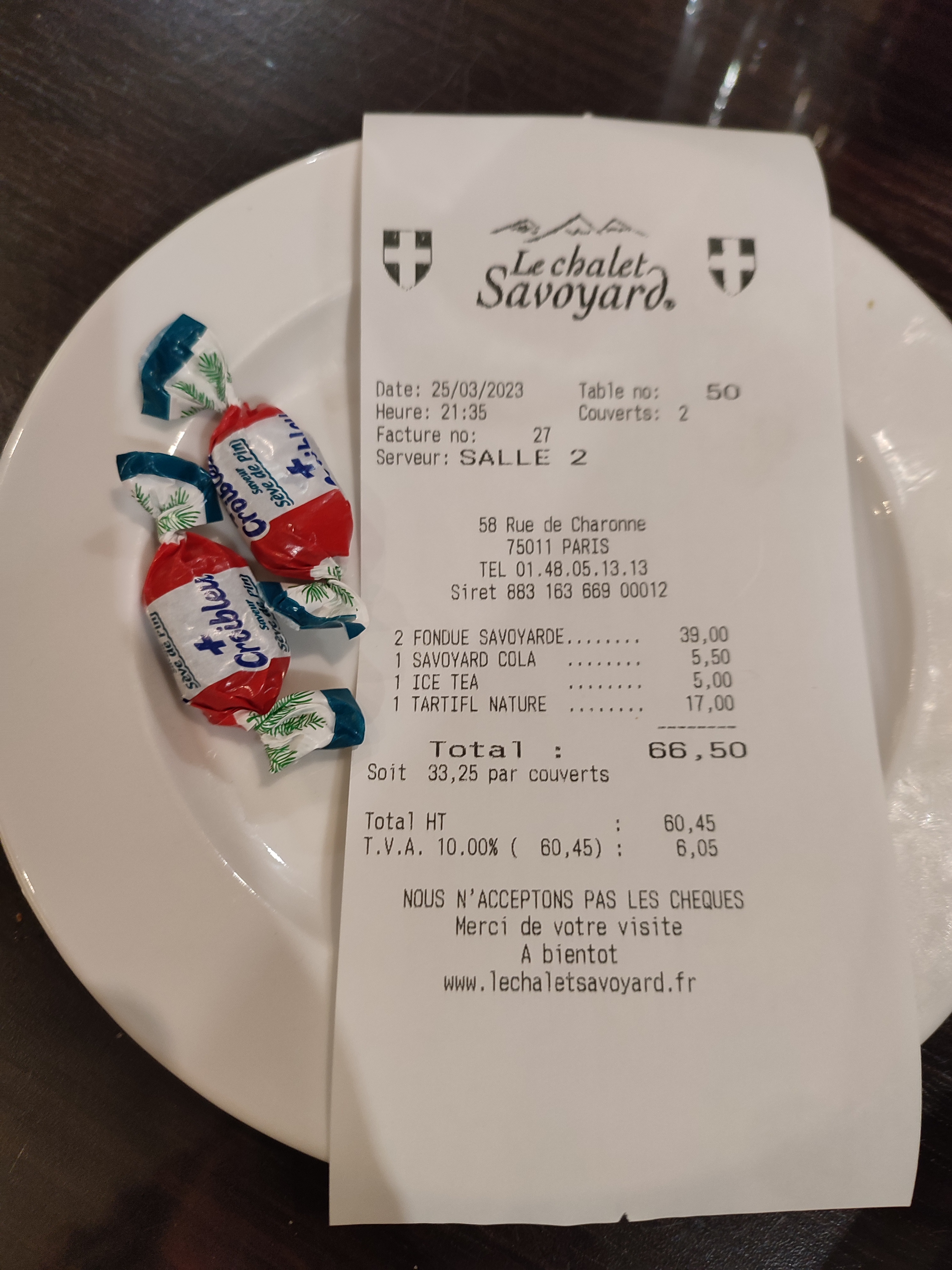 Nous sommes venu manger avec mon conjoint aujourd’hui, accueil sympathique et serveurs aux petits soins. Nous n’avons pas forcément apprécié manger aussi près des autres clients. Nous avons dégusté une fondue savoyarde, l’assiette de charcuterie était payante ( 13 euros ), sinon pomme de terre, pain et cornichon inclus donc cela reste raisonnable pour une restaurant parisien. Je n’ai pas forcément apprécié la fondue, jugée trop salée et trop écoeurante ( au bout de 4 bouts de pain je n’en pouvais plus, j’ai mal au ventre depuis ). J’ai déjà goûté des fondues de meilleure qualité et pour un prix plus bas dans la région parisienne, je ne reviendrais pas. Je vous conseillerais plutôt la raclette qui avait l’air d’être vraiment délicieuse et surtout à volonté !