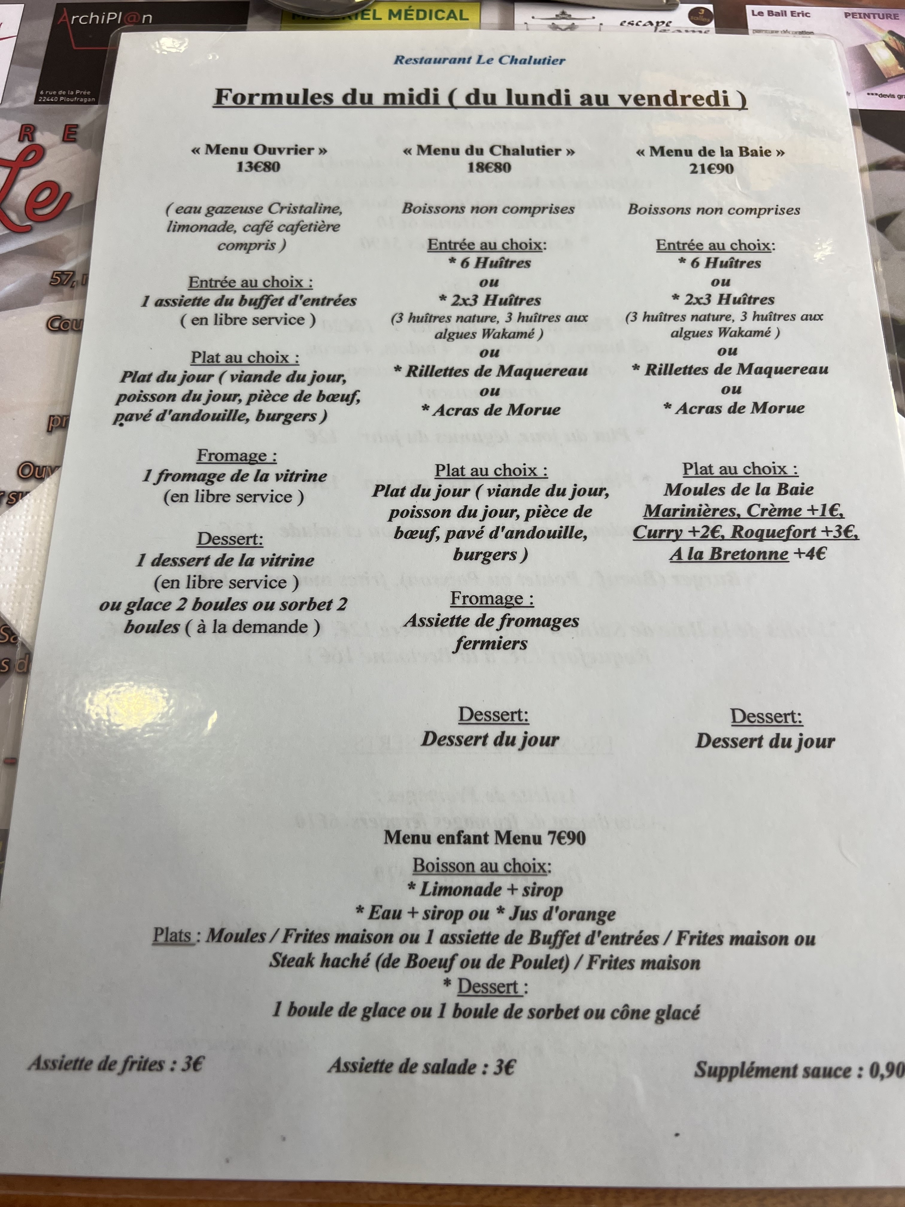 Très agréable déjeuner ce midi au Chalutier. Le patron et son fils sont en cuisine, Madame et un jeune femme sont en salle, et ça dépote :). Excellente ambiance, il y a de grandes tables que l'on partage en fonction de l'affluence (forte aujourd'hui). La terrine de maquereau maison est un régal, le pavé d'andouille, un délice. Le port est en face et la magnifique baie de Saint-Brieuc à côté. Il fait mauvais à l'extérieur mais tout va bien à l'intérieur !