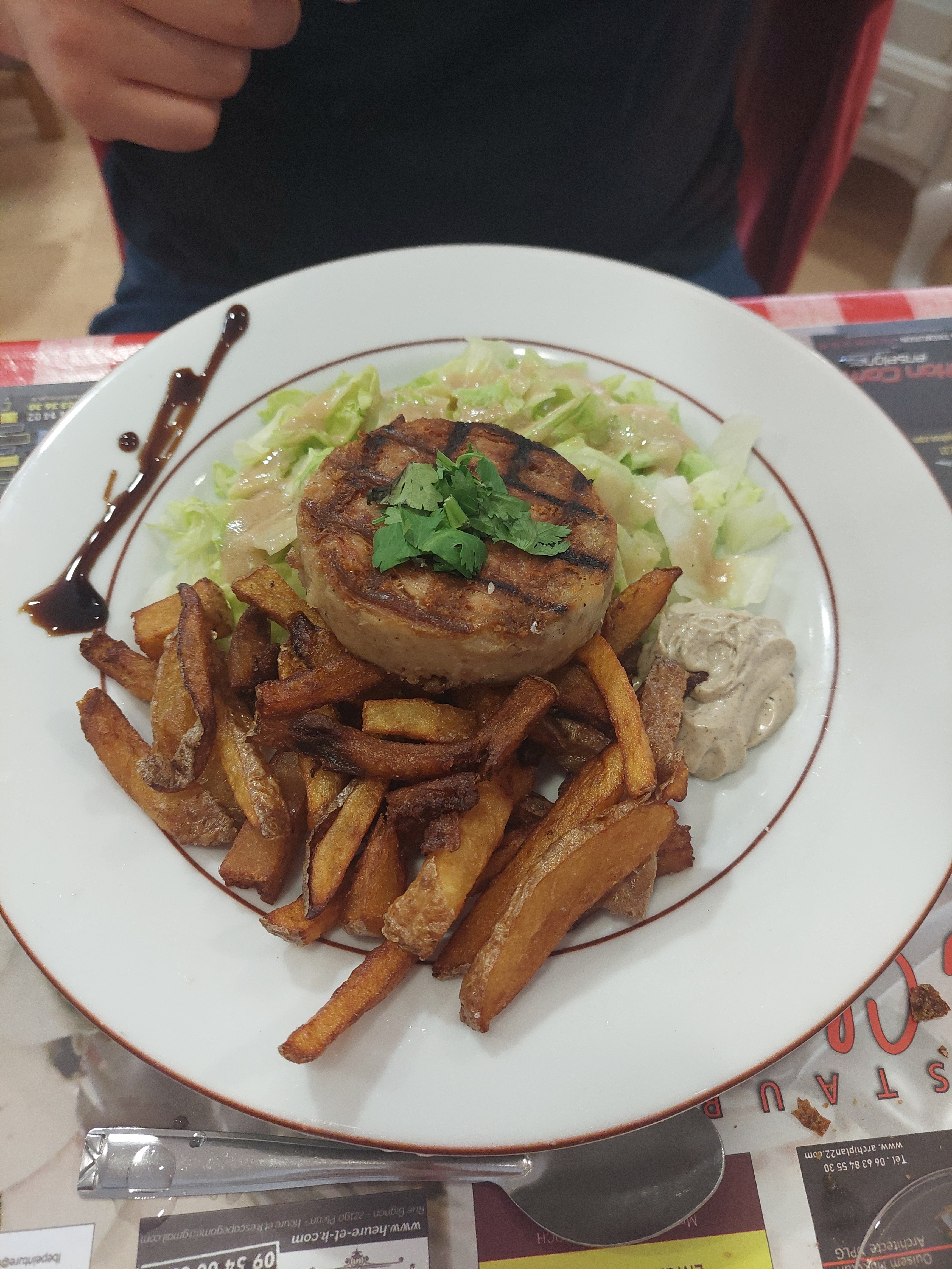 Accueil très agréable, assiettes copieuses et viande rouge tendre avec une cuisson parfaite accompagné de frites maison très bonnes Prix plus qu'abordable, et petit plus pour l'acceptation de notre chien