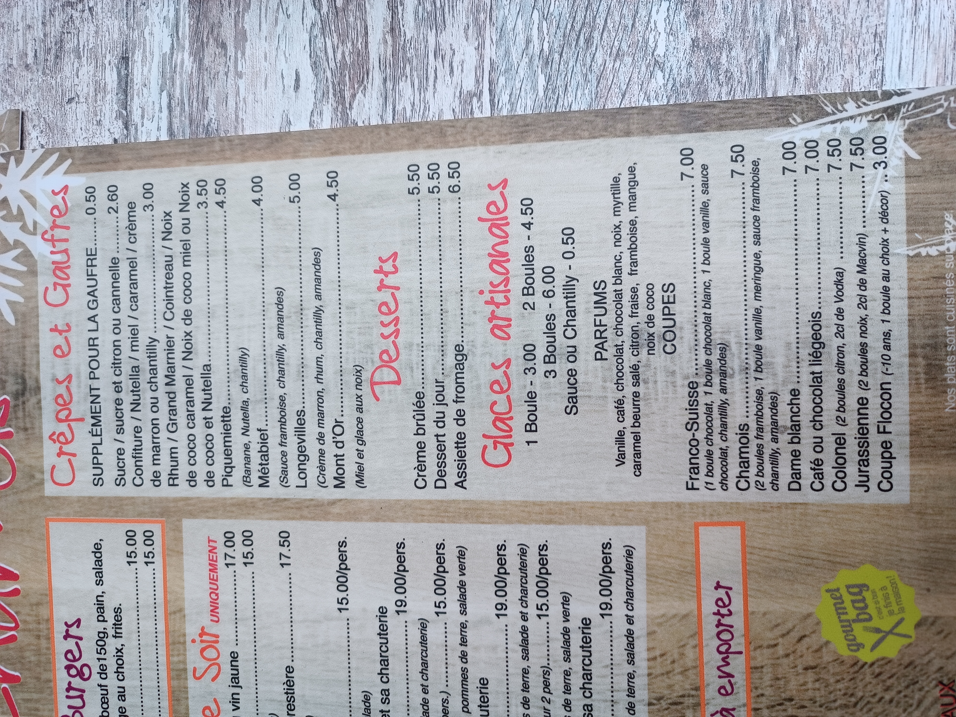 Bon restaurant au pied des pistes à Metabief :) L’intérieur est un peu petit en revanche, car même à 11h40 il est déjà complet, donc faudra très probablement manger dehors. Les plats sont simples mais bons, les prix sont corrects. Après le ski vous pourrez manger de bonnes crêpes ici ! Nous sommes restés un week-end à Metabief, et nous avons mangé 4 fois ici 😂 Je recommande ! Ps: j’ai testé la morbiflette, c’était délicieux :)