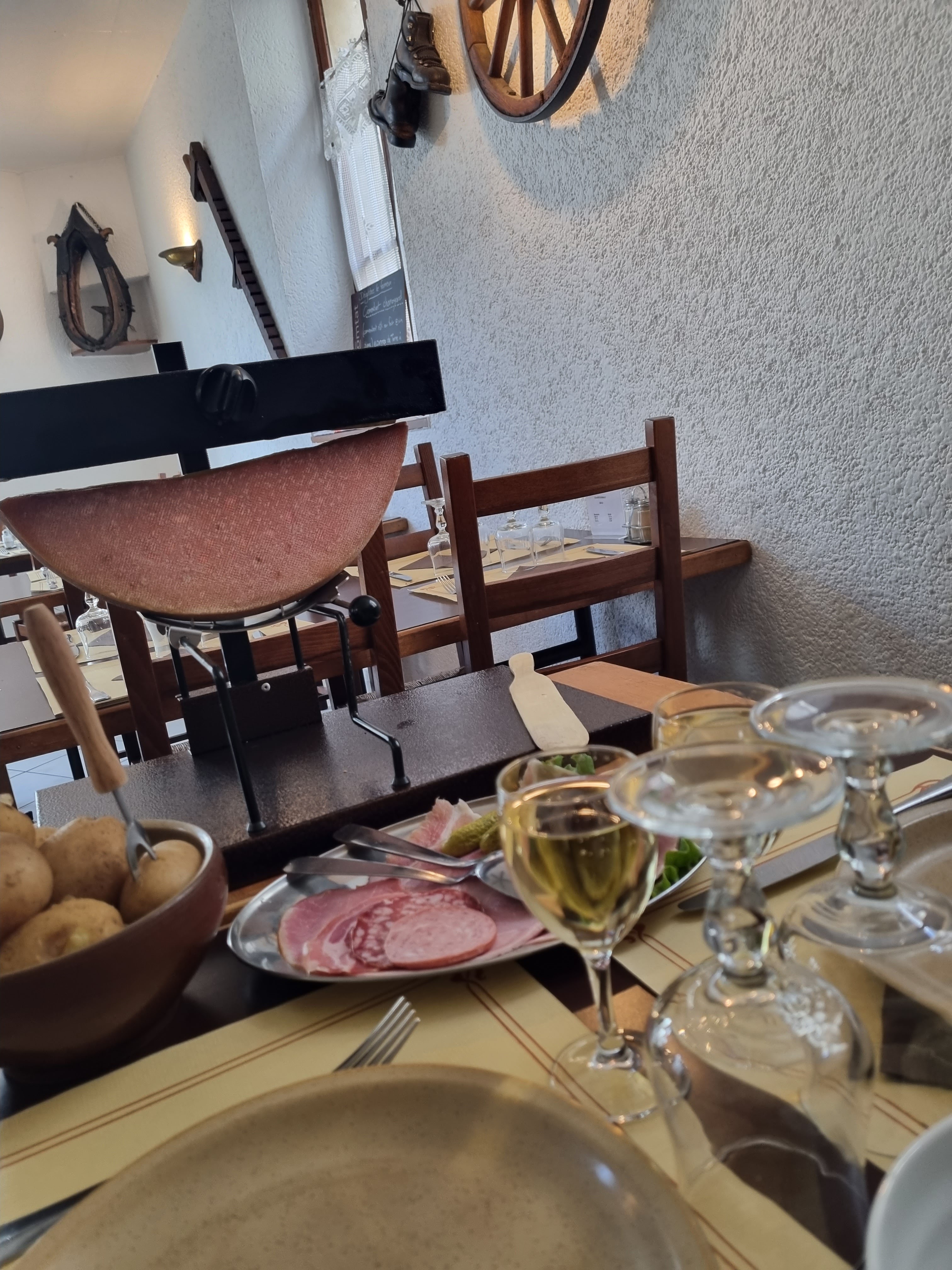 Super repas. Déco rustique on se croirait à la montagne ! demi meule de raclette, avec charcuterie et pomme de terre ainsi que de la salade a 2 😲 C'etait super bon on reviendra !