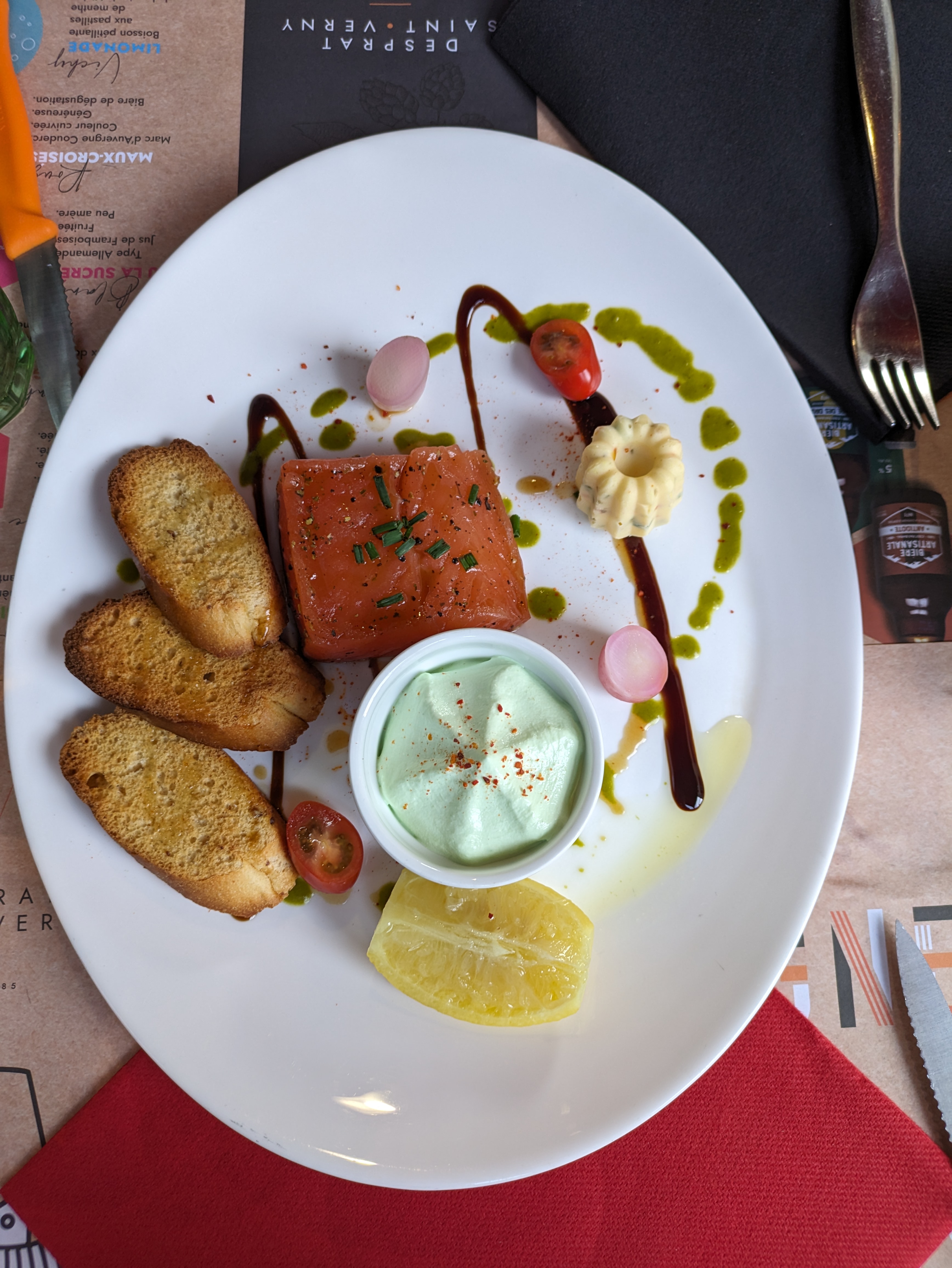 Quelle belle découverte ! Tout est bien : l'accueil cordial, la serveuse très dispo et sympa, les menus offrent un choix certes un peu limité mais de qualité. En entrée, le sashimi de longe de thon était à tomber par terre suivi d'une côte de veau aux herbes savoureuse puis la crème brulée extra. Que du bonheur ! Et, en plus très bon rapport qualité/prix. Quand je retournerai à Aurillac, je sais où j'irai manger !!