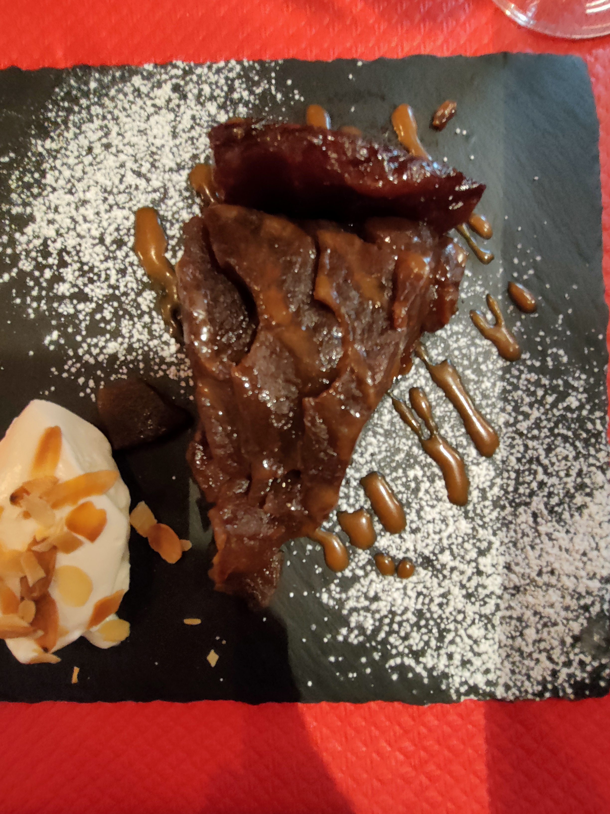 Un belle endroit pour y manger dans la tradition Le patron et les serveurs sont aux top à nos petits soins Très réactif Voici donc ce qui m’a régalé ce midi: Croustillant d’ andouillette et camembert aux pommes Moules marinières frites avec un petit supplément de crème Un mousse au chocolat (faite maison au vraie blanc d’œuf)