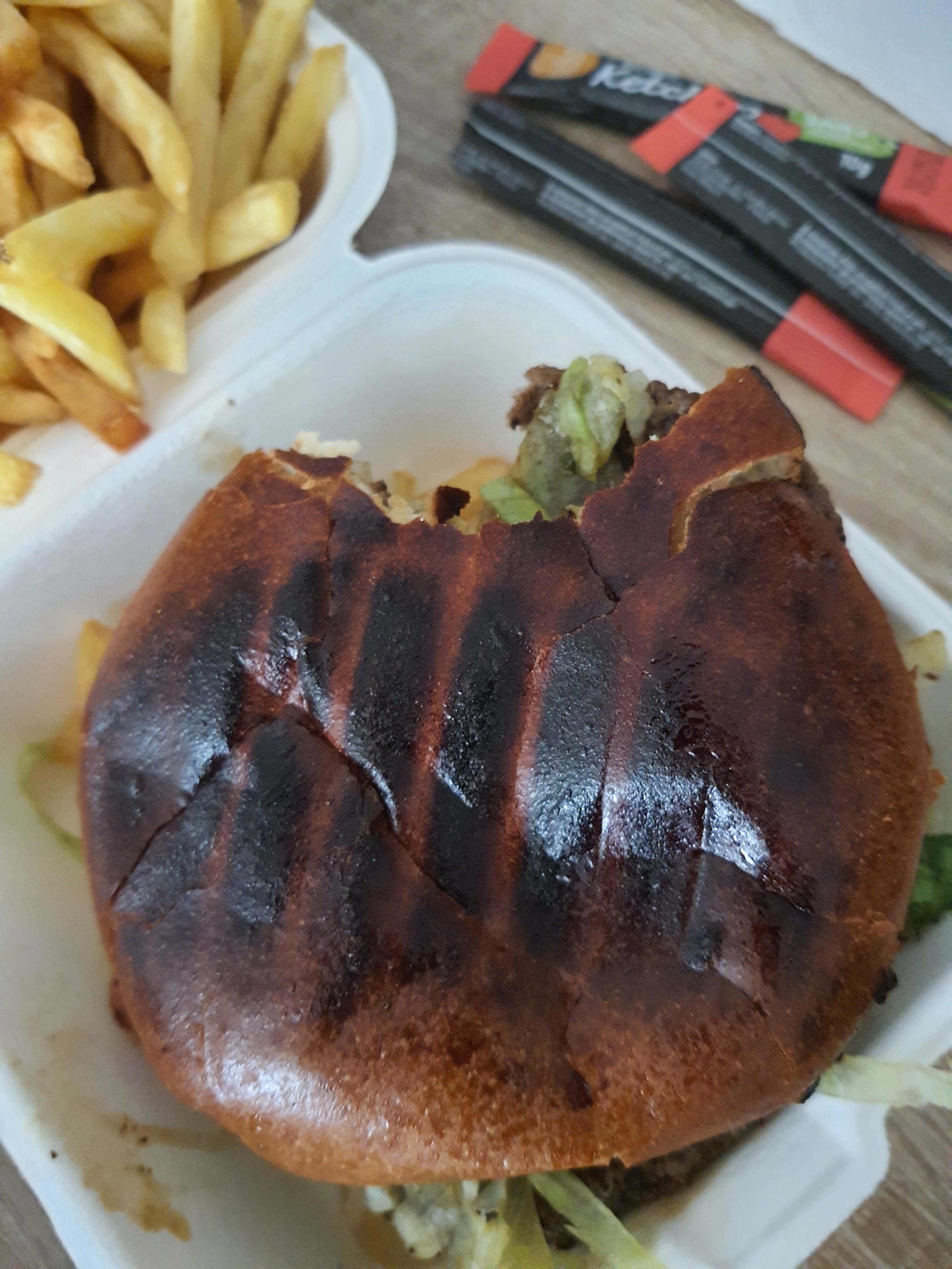 Bon burgers avec une livraison rapide, seul manque un choix un peu moins répétitif et un peu plus large. Grooooosse quantité de frite dans leurs menus, de quoi nourrir votre famille sans problèmes. Ils sont bien à l'écoute sur leur page Instagram et propose un burger du mois qui fini par ne changer que tous les trimestres. Donc, pour conclure je recommande pour les grosses faim de gens qui ne cherche pas à changer trop souvent de choix.