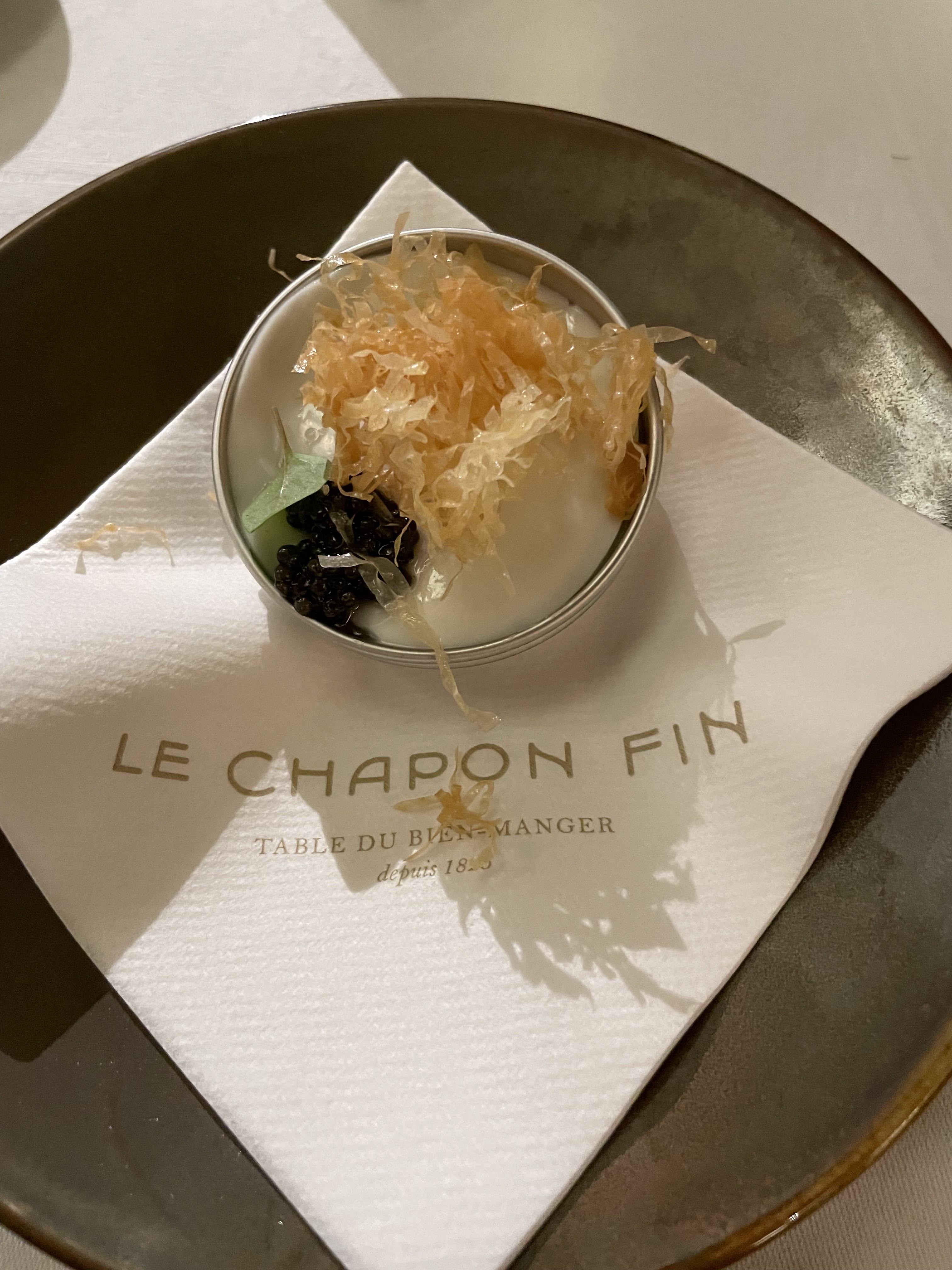 Repas du Midi au Chapon Fin pour notre anniversaire de mariage. Notre première fois dans ce restaurant. Très contents. Cuisine très travaillée tant au niveau du produit que de la présentation de l'assiette. bravo au chef et aussi aux équipes en salle. Au petit soin pour nous Très beau moment