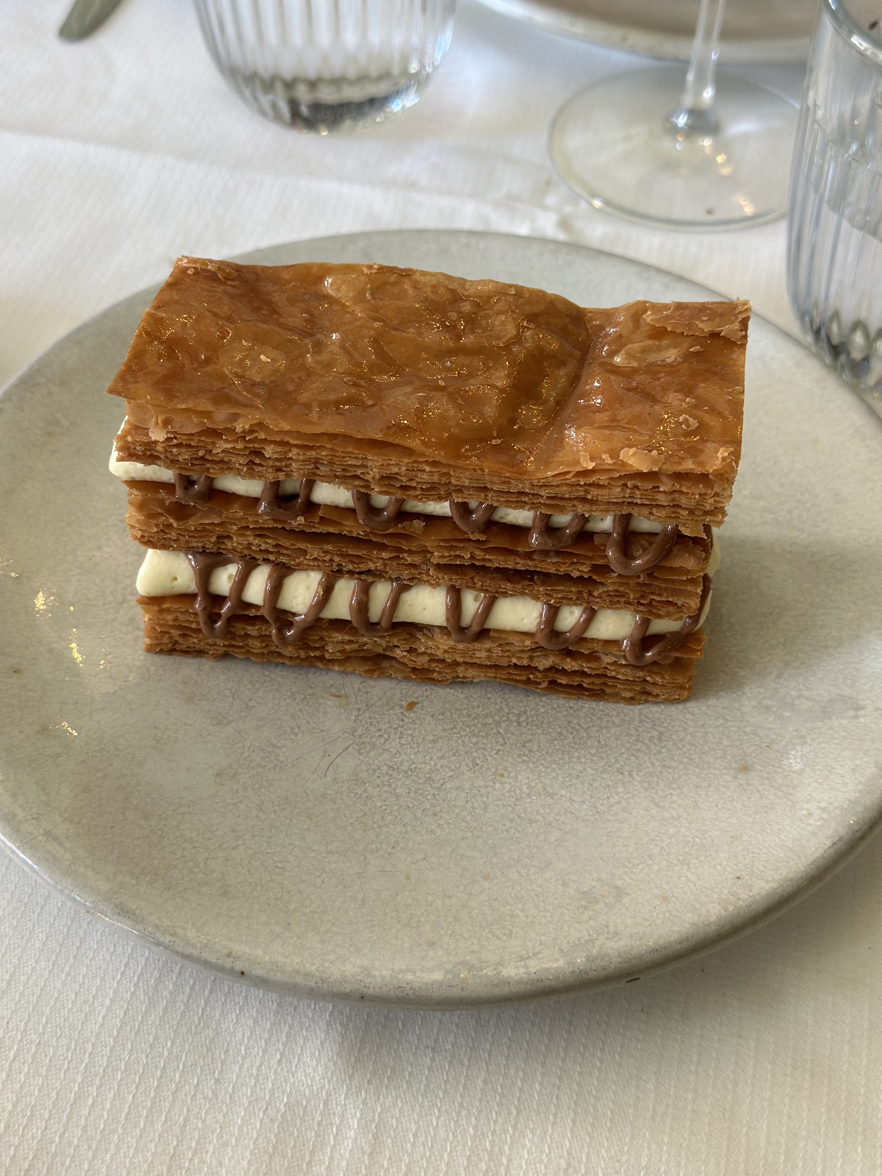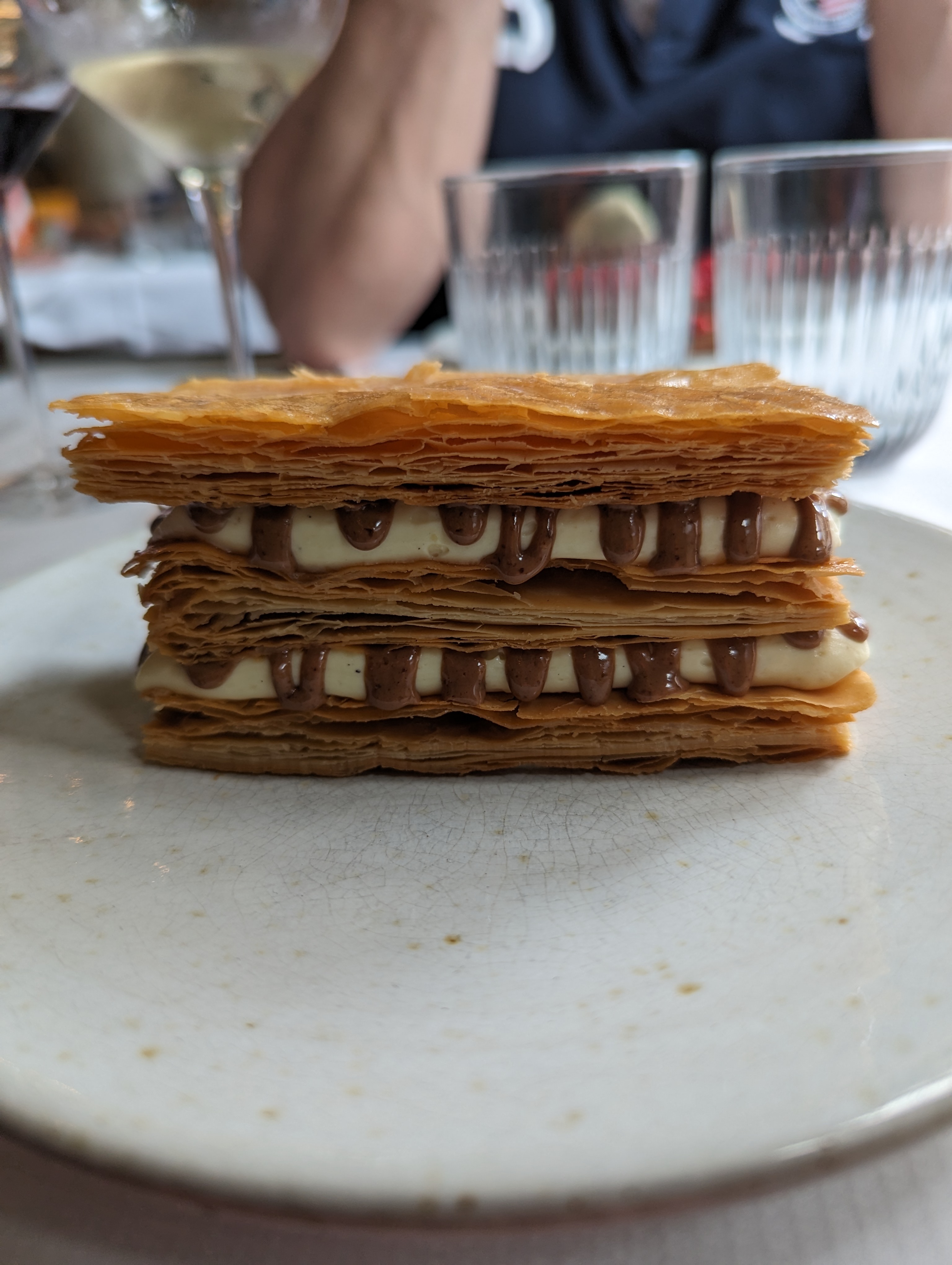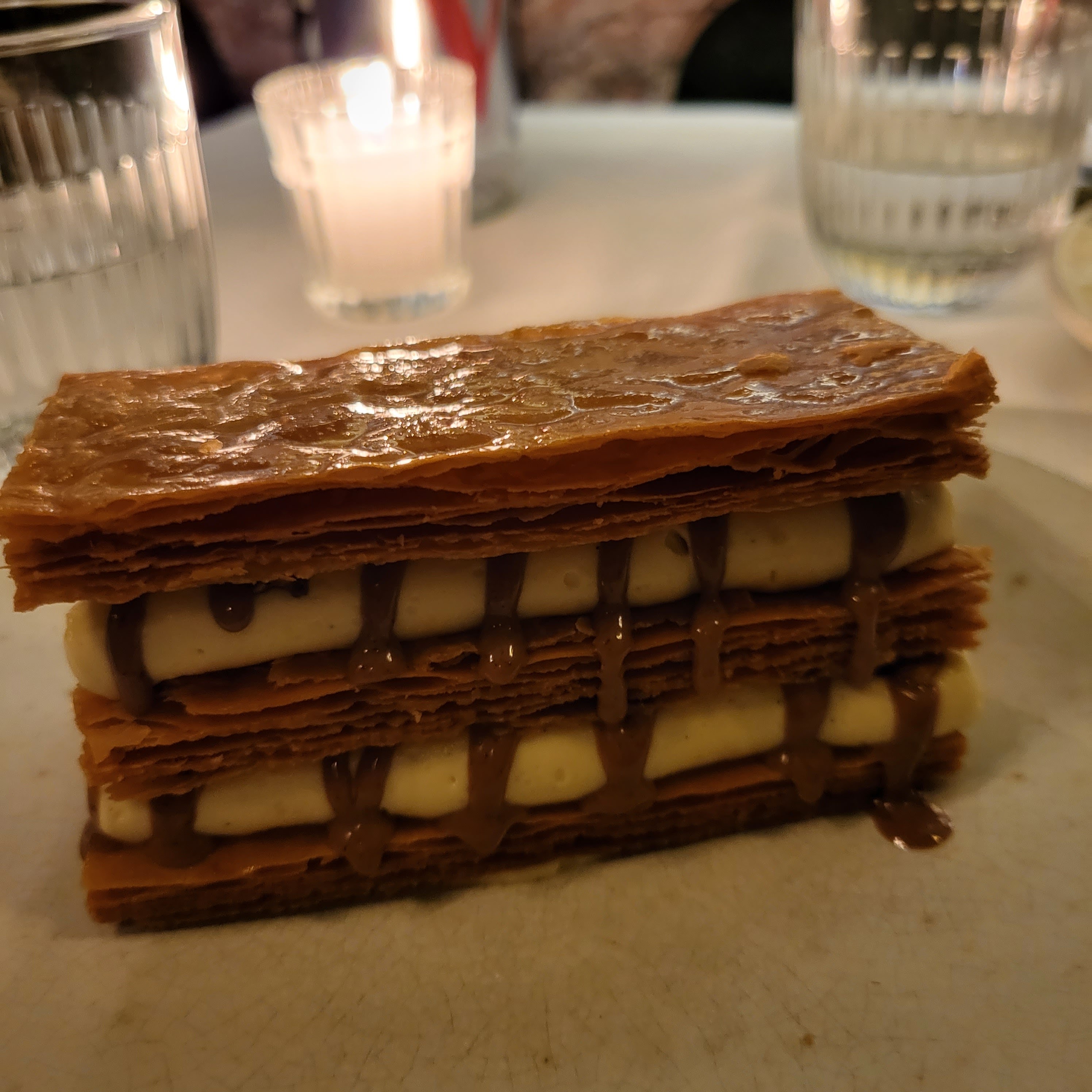 L’entrée est sympa, le plat joue de bœuf avec sa purée est excellente vraiment. Grosse déception au niveau du dessert le millefeuille la pâte trop cuite, très déçus Prix un peu trop élevé