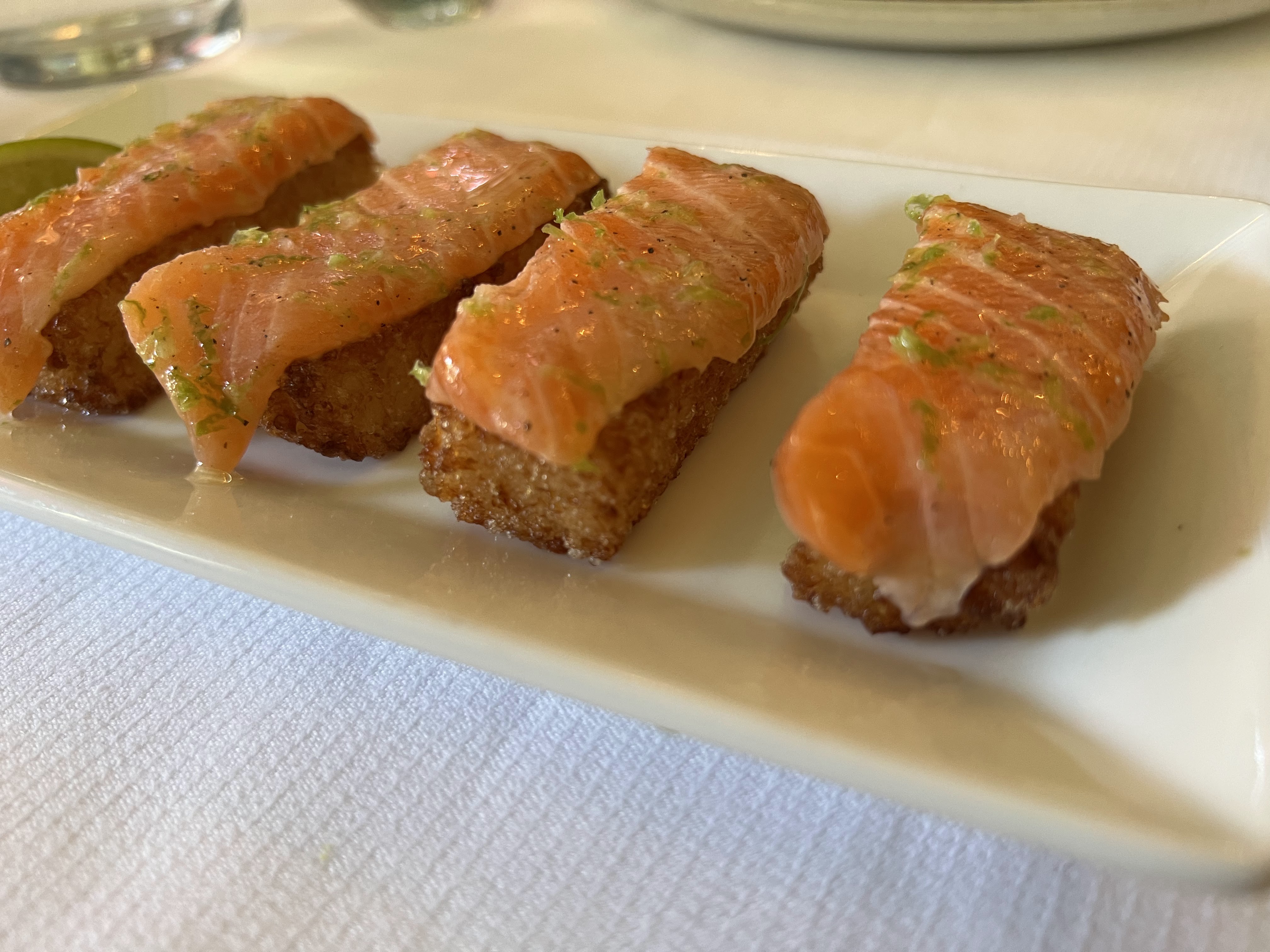 Une bonne expérience globalement. Les plats étaient savoureux bien que simples, j’ai adoré l’ambiance et la musique. J’ai été un peu déçue par le mille feuilles mais les crispy sushis et le bar en croute de sel étaient très bons. Petit bémol pour l’hôtesse qui est venu nous encaisser et à pris la liberté de rajouté 4€ de pourboire sur mon addition alors que je lui avais dit de me facturer « le reste ». C’était le soir et le restaurant était nettement vidé car proche de la fermeture - je doute donc qu’il s’agissait du bruit. J’avais déjà prévu mon pourboire en espèces. J’ai trouvé ça irrespectueux et pas très classe. J’ai fait le choix de ne rien dire mais j’aurais nettement préféré être encaissée par notre gentil serveur.