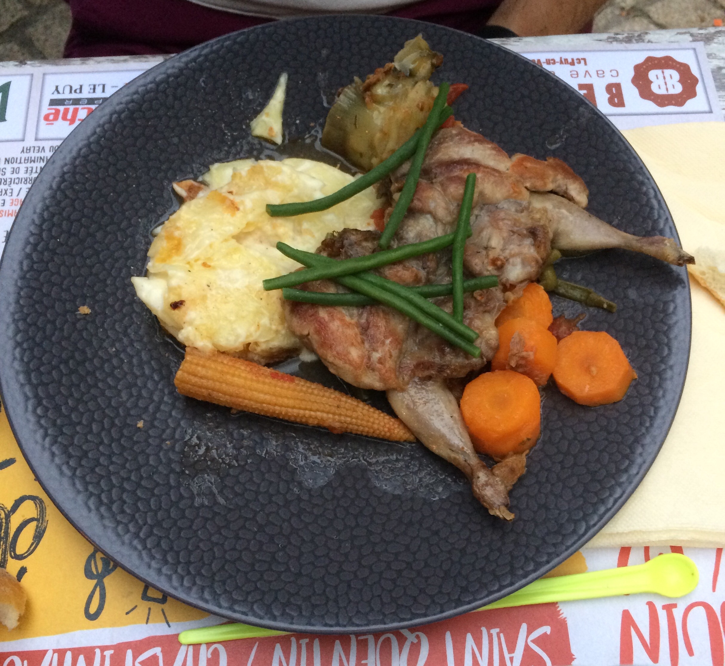 À quelques kilomètres du Puy en Velay dans un petit village typique et calme, la patronne vous accueille chaleureusement dans un cadre simple. La terrasse offre une vue sur la vallée. Le patron n'est pas loin en cuisine et propose un menu du soir à 28€ avec 3entrées, 2 plat et 3 desserts au choix. Donc pas de doute sur le fraîcheur de la proposition. En photo, dos de cabillaud aux petits légumes et caille désossée avec son accompagnement. Très bons, légers, pas gras. Très bien adaptés à la chaleur ambiante . À la fin du repas le chef est venu nous saluer. En semaine le midi il sert un menu ouvrier à 13€ et restaure les 50 enfants de l'école communale dans sa salle au 1er étage.