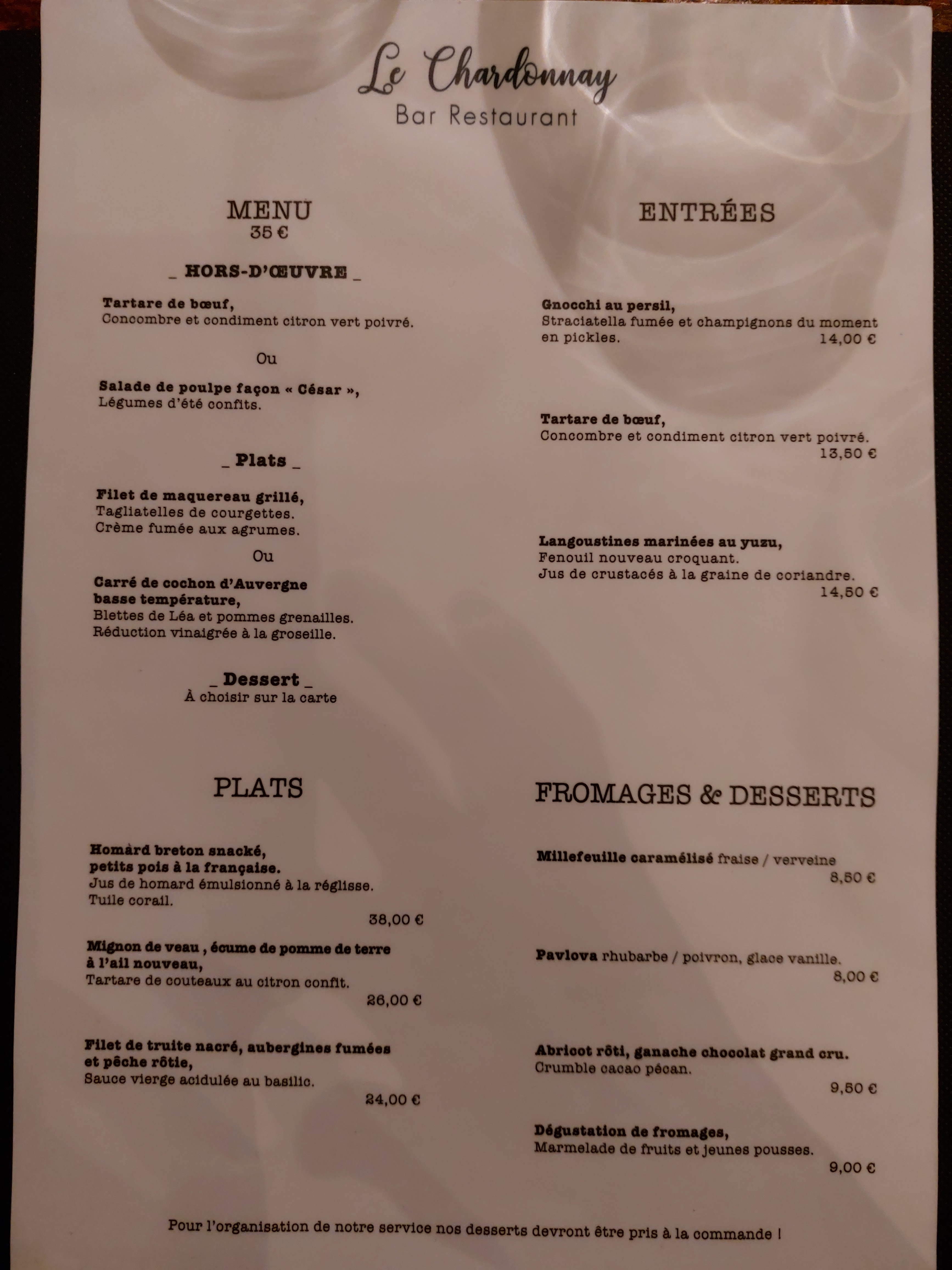 Le chardonnay est un bel endroit , cosy , sobre et tendance . Au niveau du service , le personnel Est très professionnel ,tant au niveau de l accueil que sur les conseils avisés sur le choix des plats de la carte ou les références des vins . Côté assiette d'ailleurs aucune fausse note de l entrée au dessert . C est tres bon , frais, Avec des bons produits . Bref établissement à découvrir ou à redécouvrir !