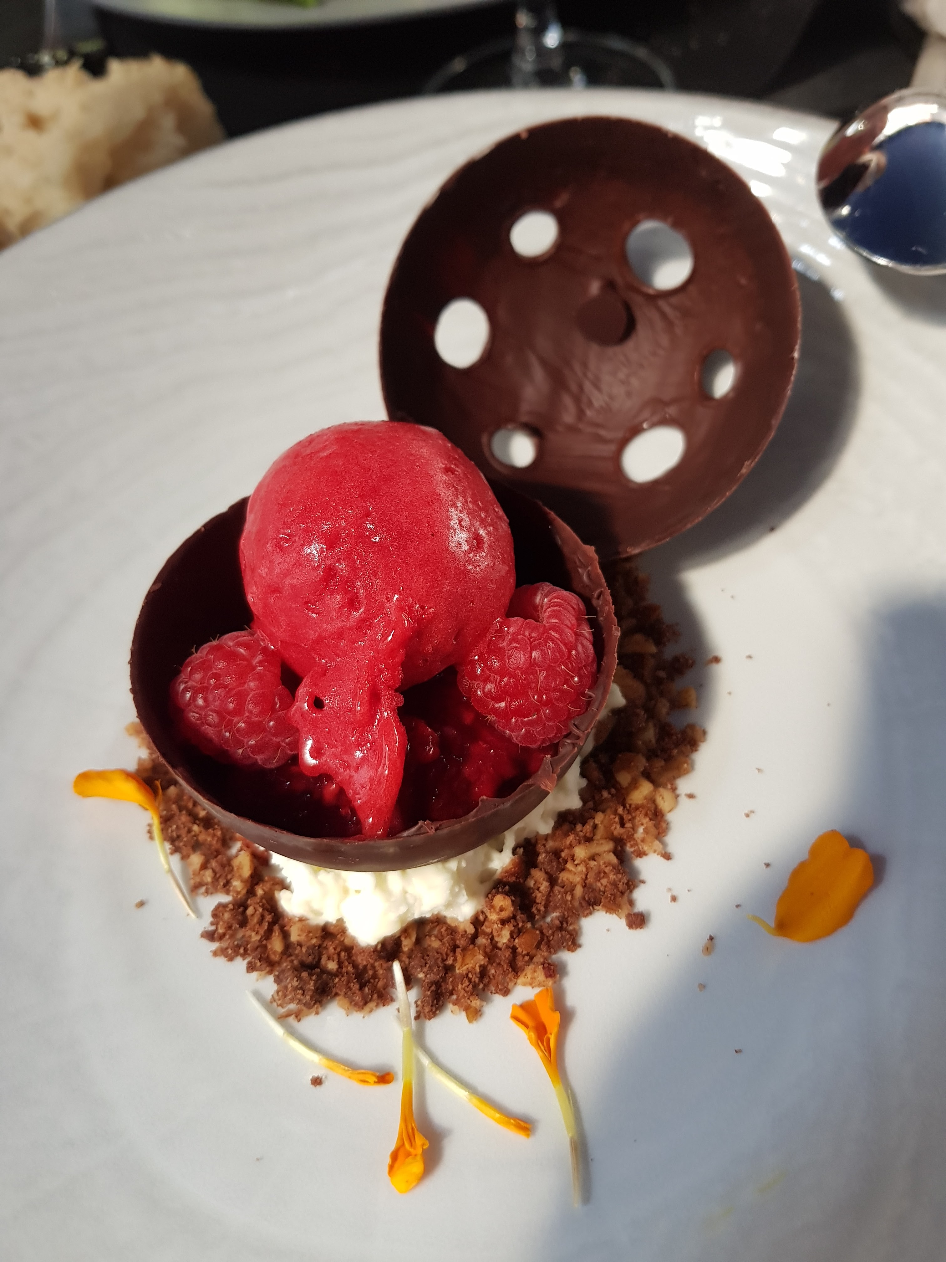 Un peu déçue par l entrée et le plat ( poisson un peu juste en cuisson) . Profiterole praliné avec coulis de chocolat très bien par contre.