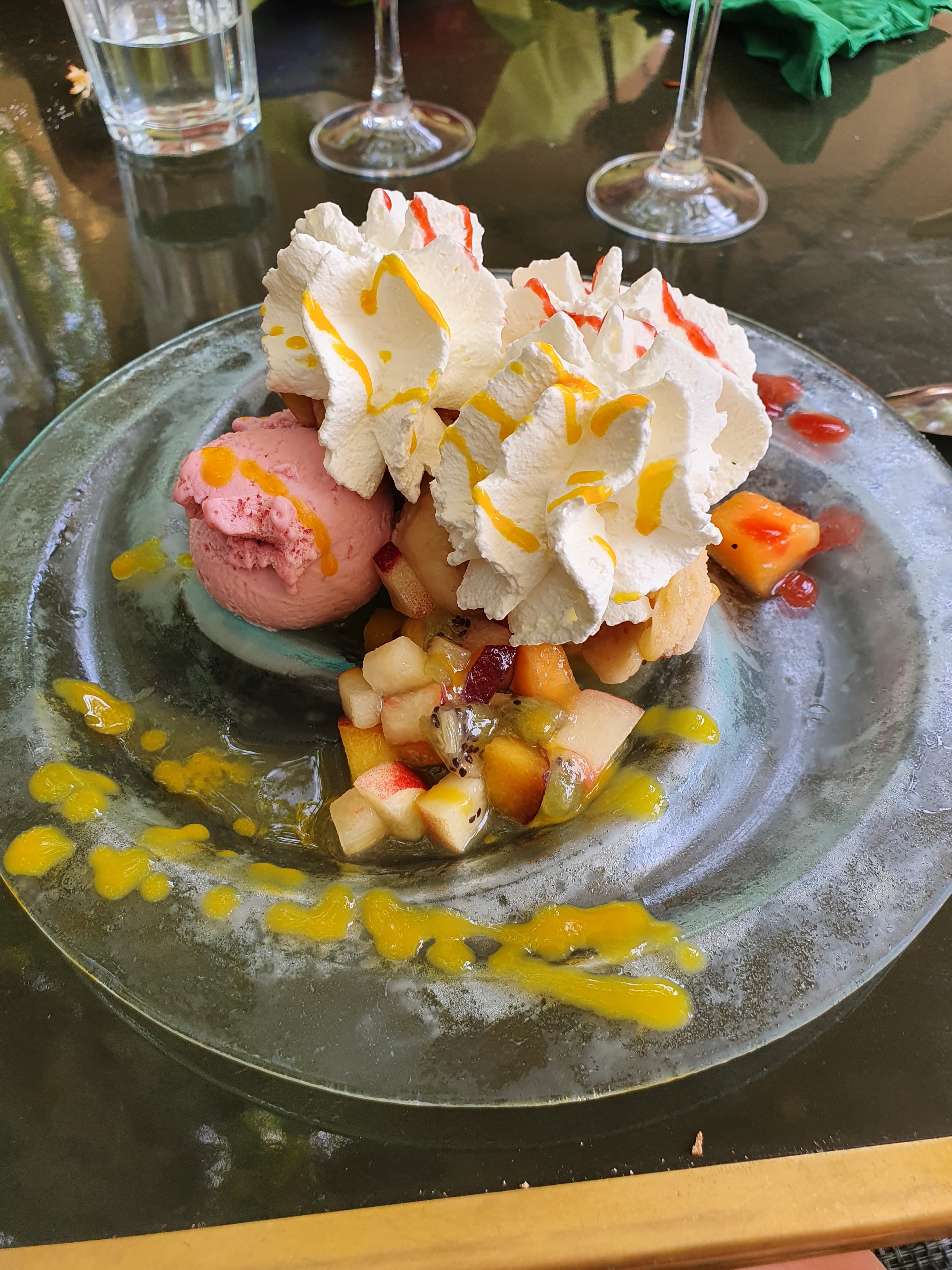 Glaces servies fondues et parfum chocolat très vieux de goût. Le personnel n'a pas proposé de changer les coupes fondues et à même insisté pour dire que c'était normal.