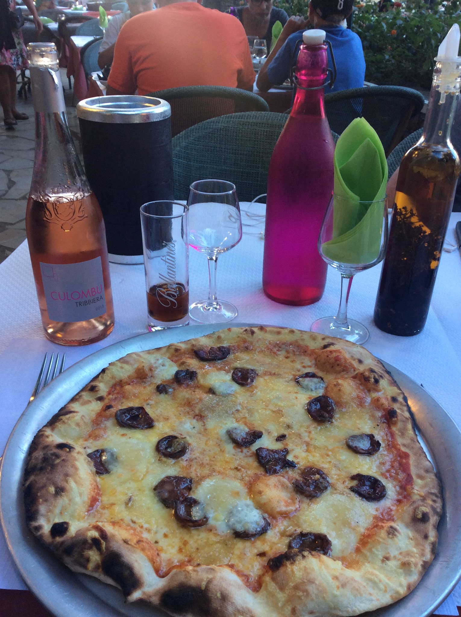 La pizza était légère et bonne. Cependant, afin de faire fuir les oiseaux qui nichent dans les arbres au-dessus des tables, les serveurs, qui parcourent la terrasse, sifflent régulièrement à vous percer un tympan. Nous étions assis à côté de la route et j'aurais encore mieux aimé entendre la sirène d'un véhicule pompier. Ça aurait été plus doux.