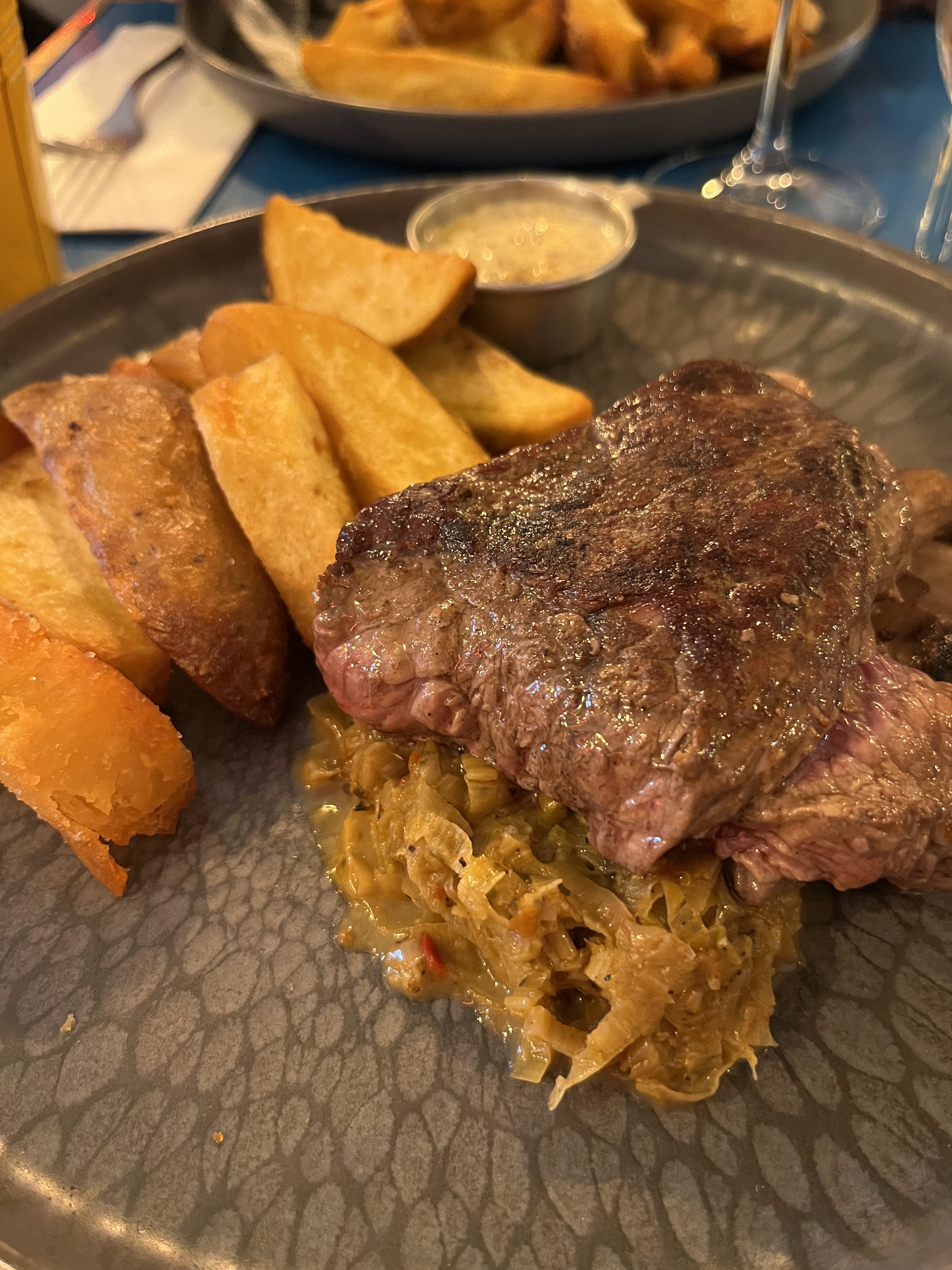 De bons cocktails lors de leur happy hour qui dure jusqu'à 22h. Pour manger, nous avons pris le croque à la truffe et mon ami a pris le steak et le chimichurri. Les deux étaient bons, une chose à noter est que le chimichurri était super épicé.