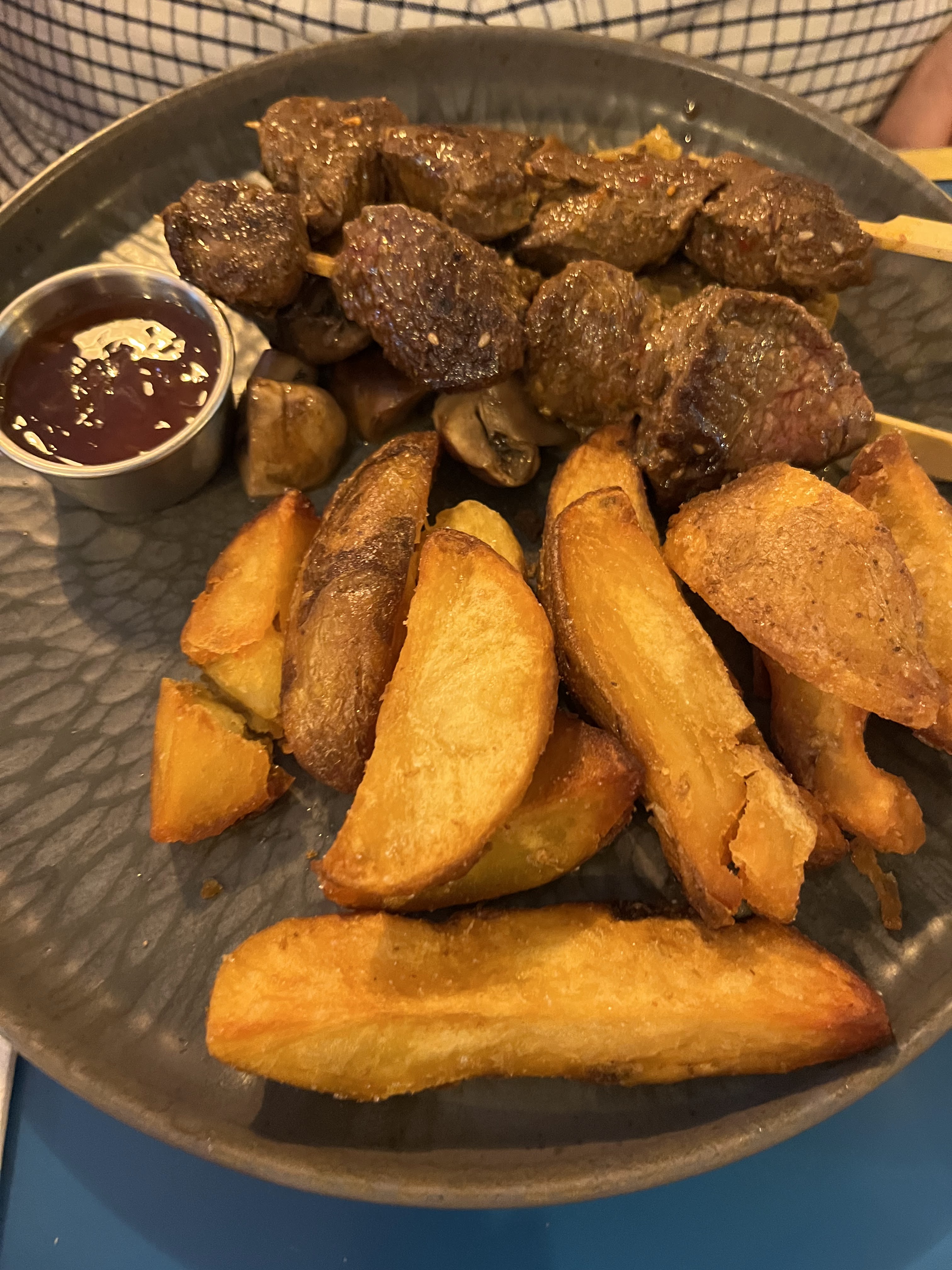 Nous avons visité cet endroit pour déjeuner en semaine. C'était très calme et il n'y avait que deux autres tables pendant notre séjour. Les salades étaient très bonnes avec beaucoup de sortes de légumes différents et une bonne vinaigrette, ce qui est une bonne option étant donné le peu d'options saines à Paris pour la consommation de légumes. Le steak était très dur et très mal cuit (bien que mieux que trop cuit). Les brochettes de bœuf spéciales étaient plus douces et meilleures. Du bon pain. Même si nous étions le seul client (au début), le personnel semblait un peu distrait par autre chose et avait oublié la commande de boissons. Il y avait aussi beaucoup de temps pour prendre les commandes.