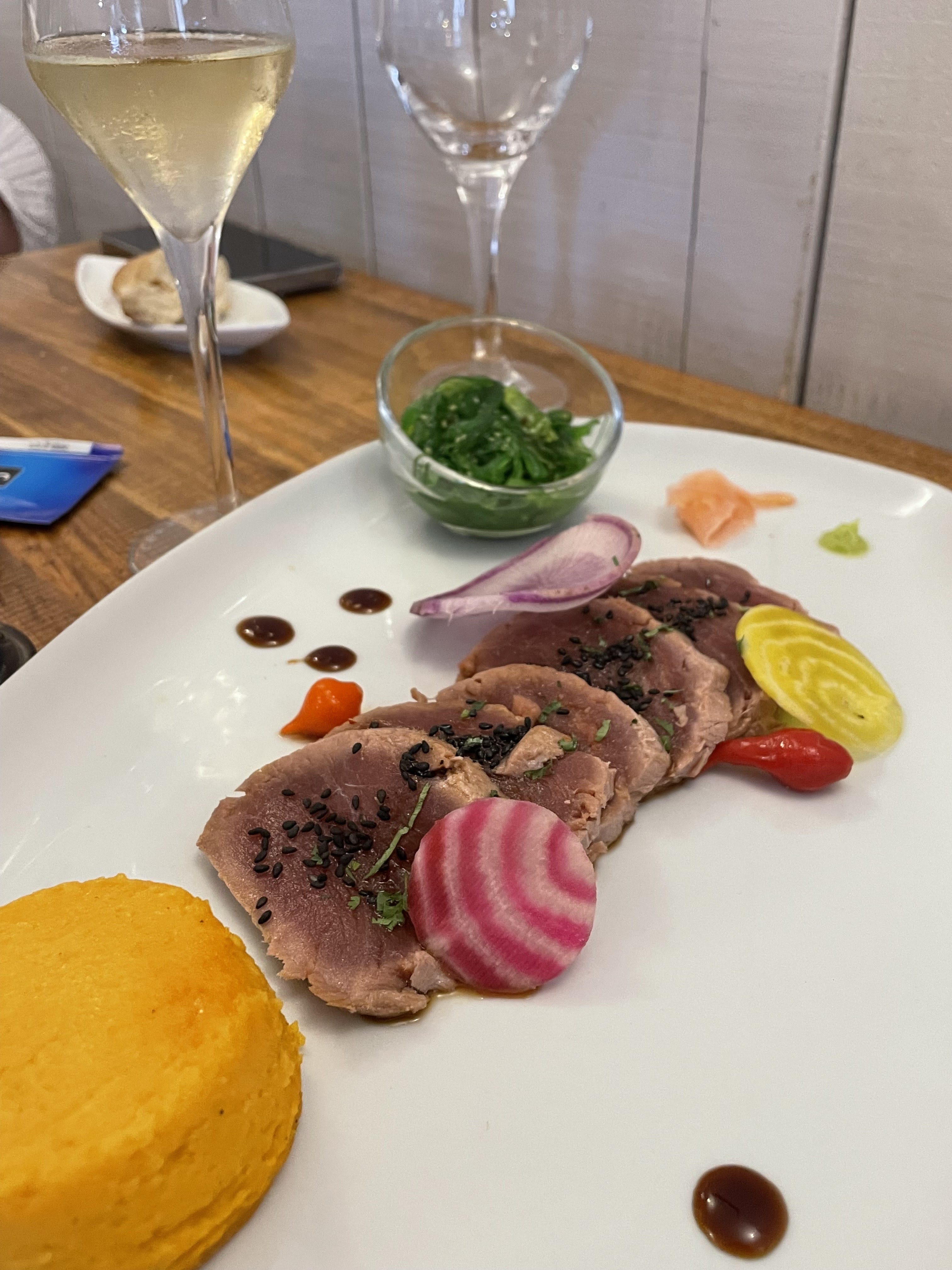 Langouste à la plancha juste parfaite, précédée par un cheviche de bar à la mangue et citron vert. Très convivial sur les chaises hautes en terrasse. Thé place to be pour finir les vacances aux Portes .