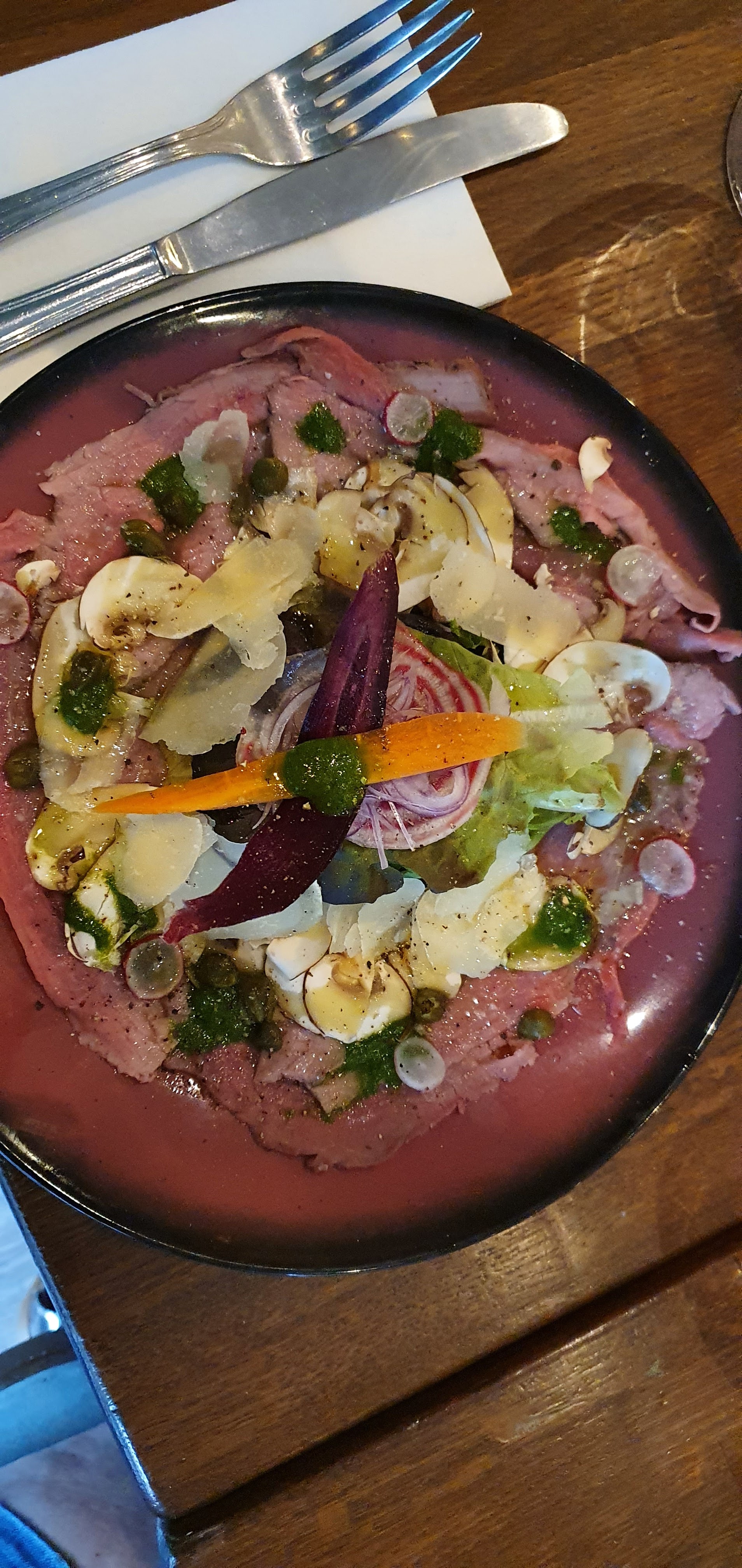 Un cadre intimiste, bande son jazz des années 30, plats bien réalisés et savoureux. Je recommande le vin en carafe (issu de bouteilles débouchées) ce qui permet de déguster un vin millésimé en petite quantité. Pour ceux qui aiment la viande... le carpaccio de bresaola parmesan excellemment présenté sur une belle assiette colorée ! Photos : rognon en persillade purée et cabillaud riz noir....
