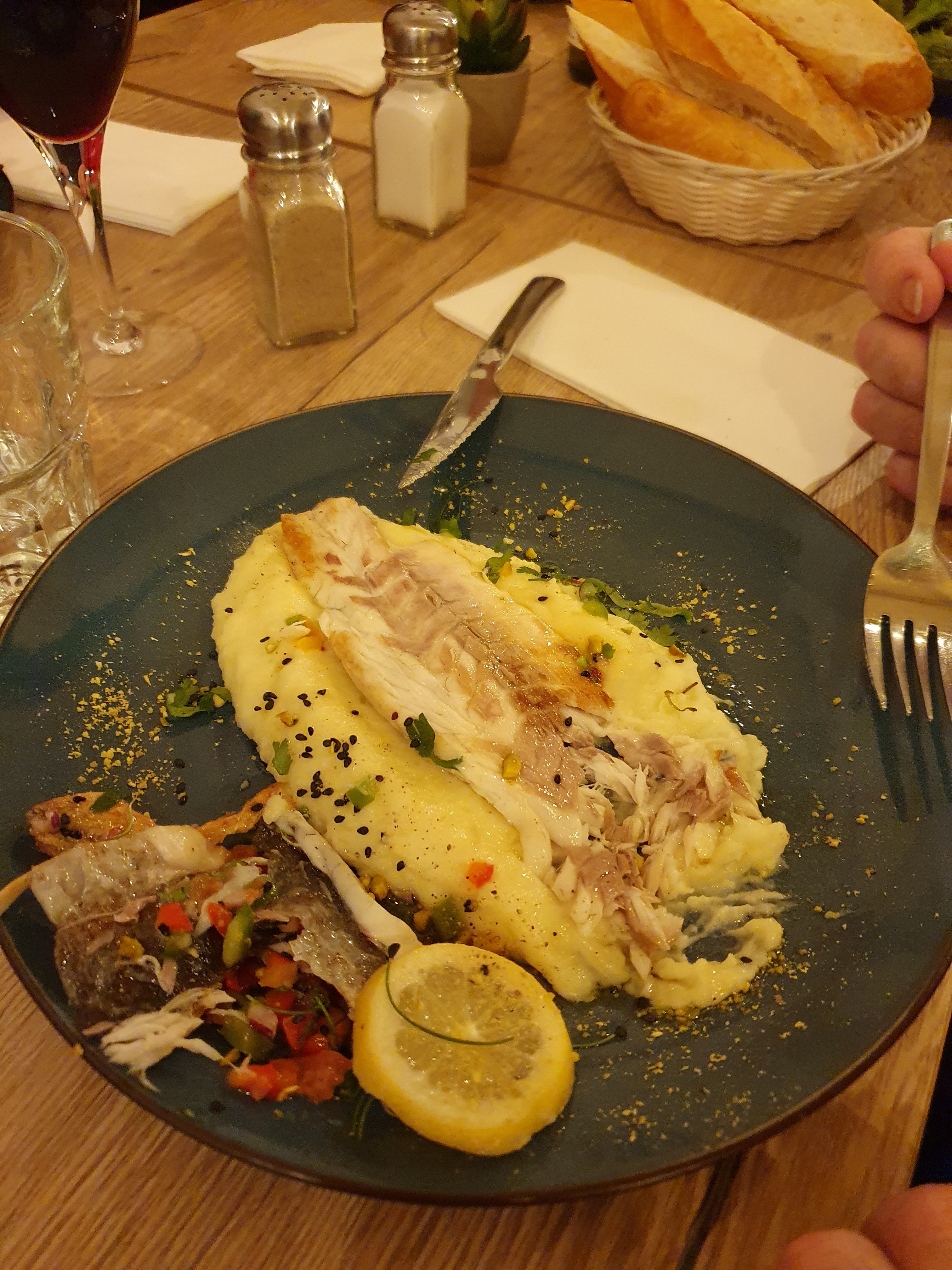 J’ai testé le filet de bar cette semaine pour la nouvelle carte ! Bien assaisonné et copieux. j’ai aussi pris un café gourmand, largement suffisant pour finir le repas sur une touche sucrée. Un grand bravo aussi pour la décoration, beaucoup de travaux on été réalisé ! A très vite