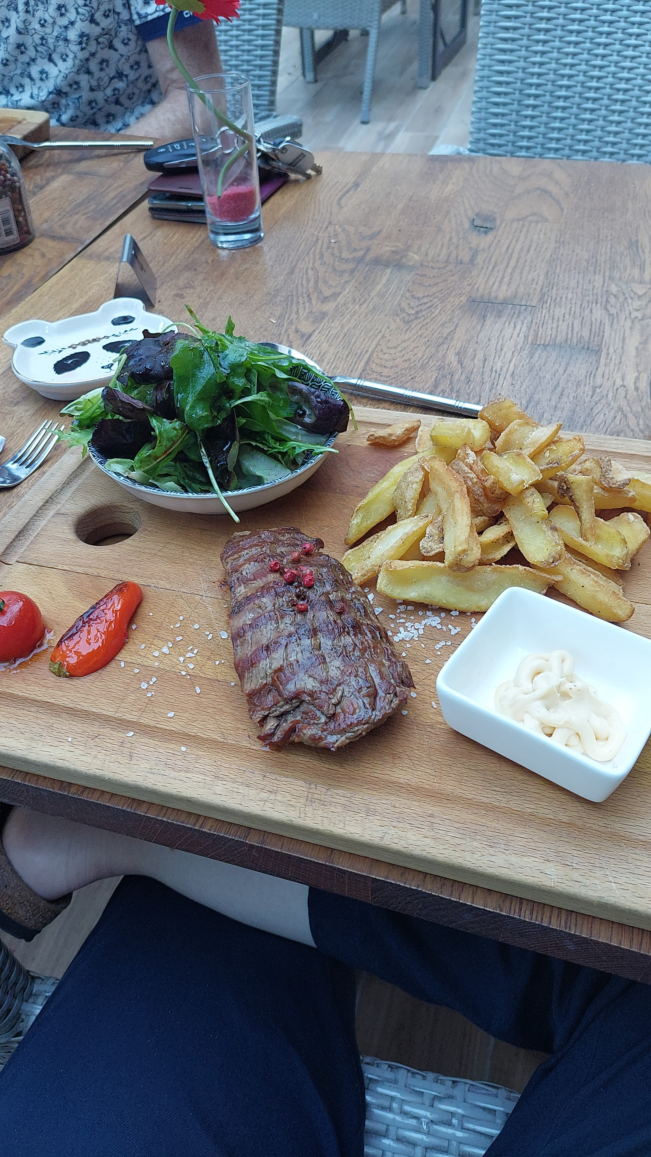 Le tataki de bœuf angus était TRÈS bon, vraiment, service ultra rapide une fois à table, et joli endroit. Seul bémol pour le temps d'attente pour être installés pour boire un verre avant le repas, bémol qui ne va pas à la réceptionniste/serveuse du soir qui était TRÈS sympathique, serviable et efficace, mais qui était malheureusement toute seule et a fait de son mieux pour réceptionner un car de touristes, ouvrir le restaurant, et gérer le bar, en même temps ! (vous devriez l'augmenter car elle est top !! Et aussi embaucher des extras car la pauvre a dû passer une soirée infernale tout en restant hyper souriante et agréable!). Heureusement un collègue pas en service a pu l'aider, lui aussi très sympathique :)