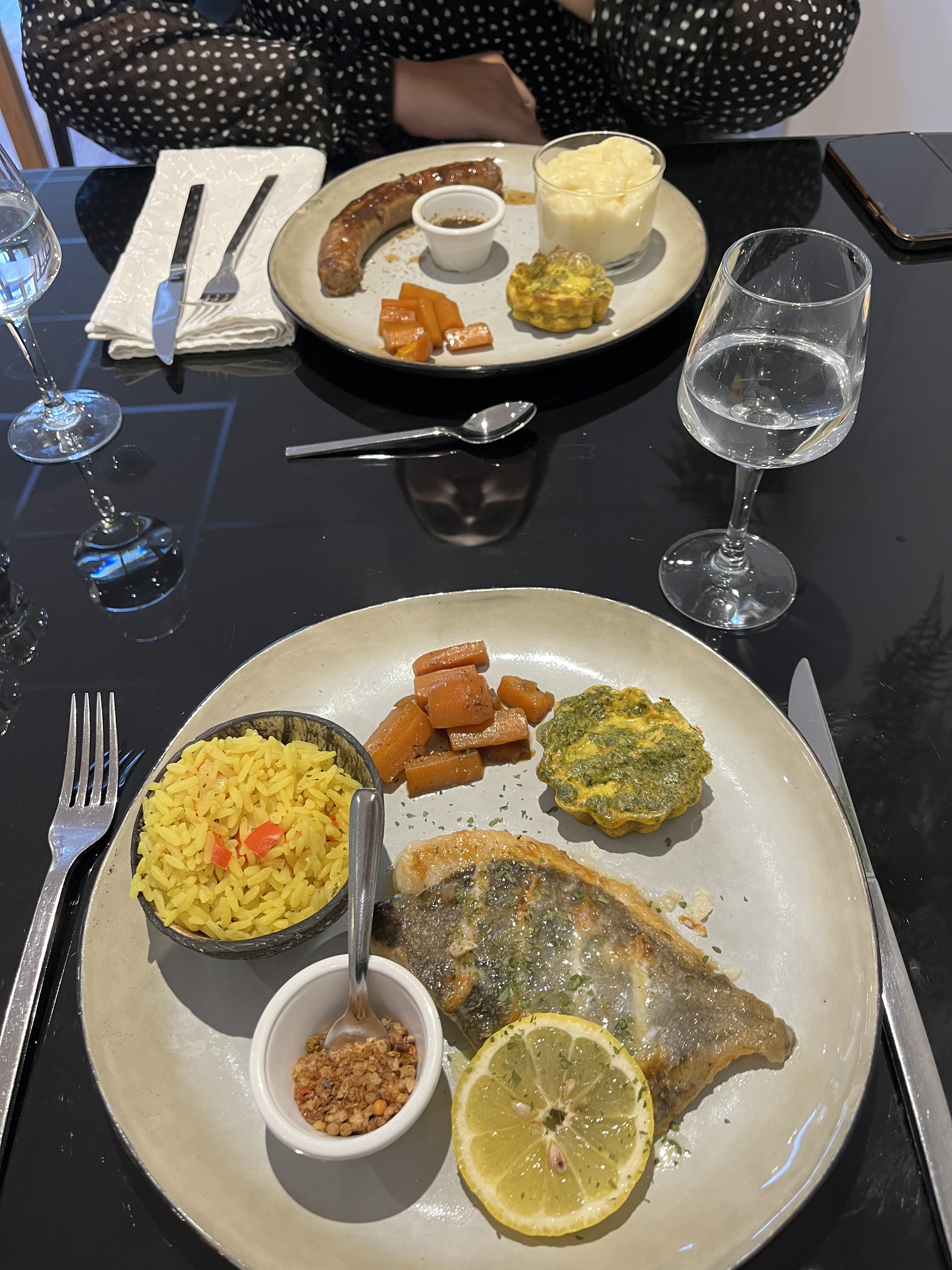 Merci pour ce repas,farçou et velouté de potiron très bon et bien preparé, pour suivre ombre chevalier, gratin de pommes terres, spaghetti de courgettes avec un léger goût de vanille, carottes vapeur au jus, cuisson du poisson parfaite accompagné d'un sel fou pour agrémenter le tout et enfin un café gourmand, tout ceci servi avec le sourire, bravo et merci pour ce bon moment