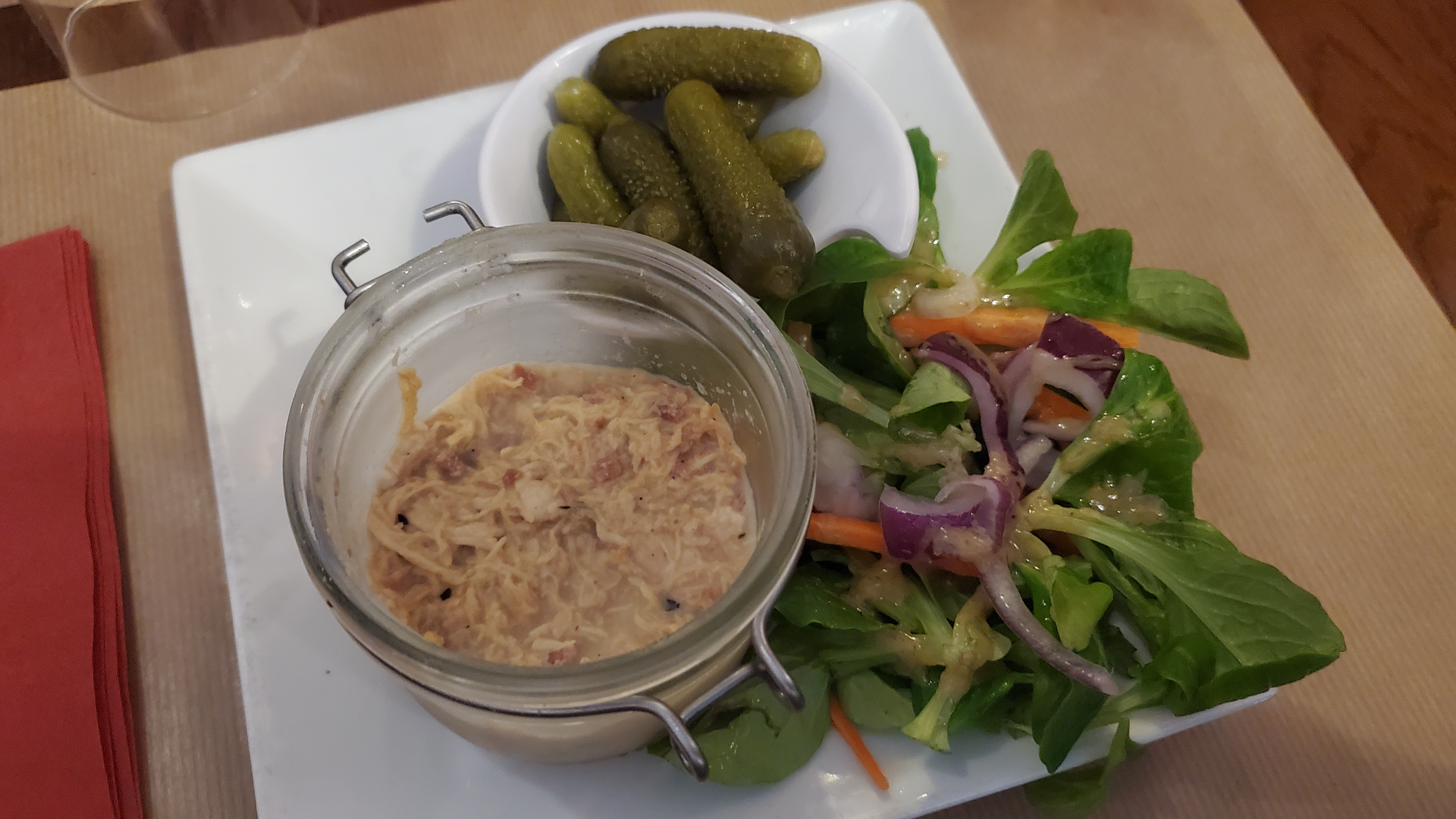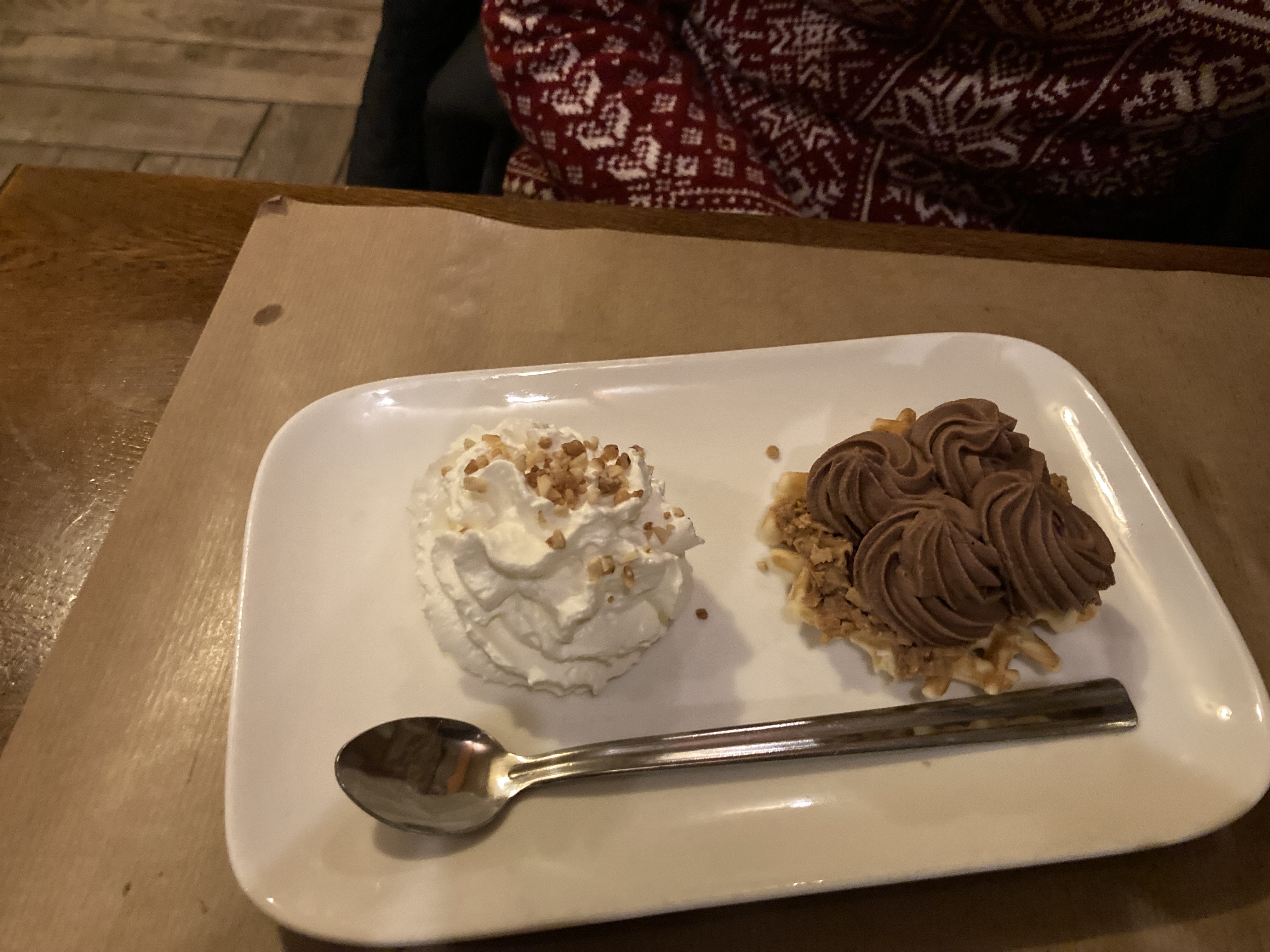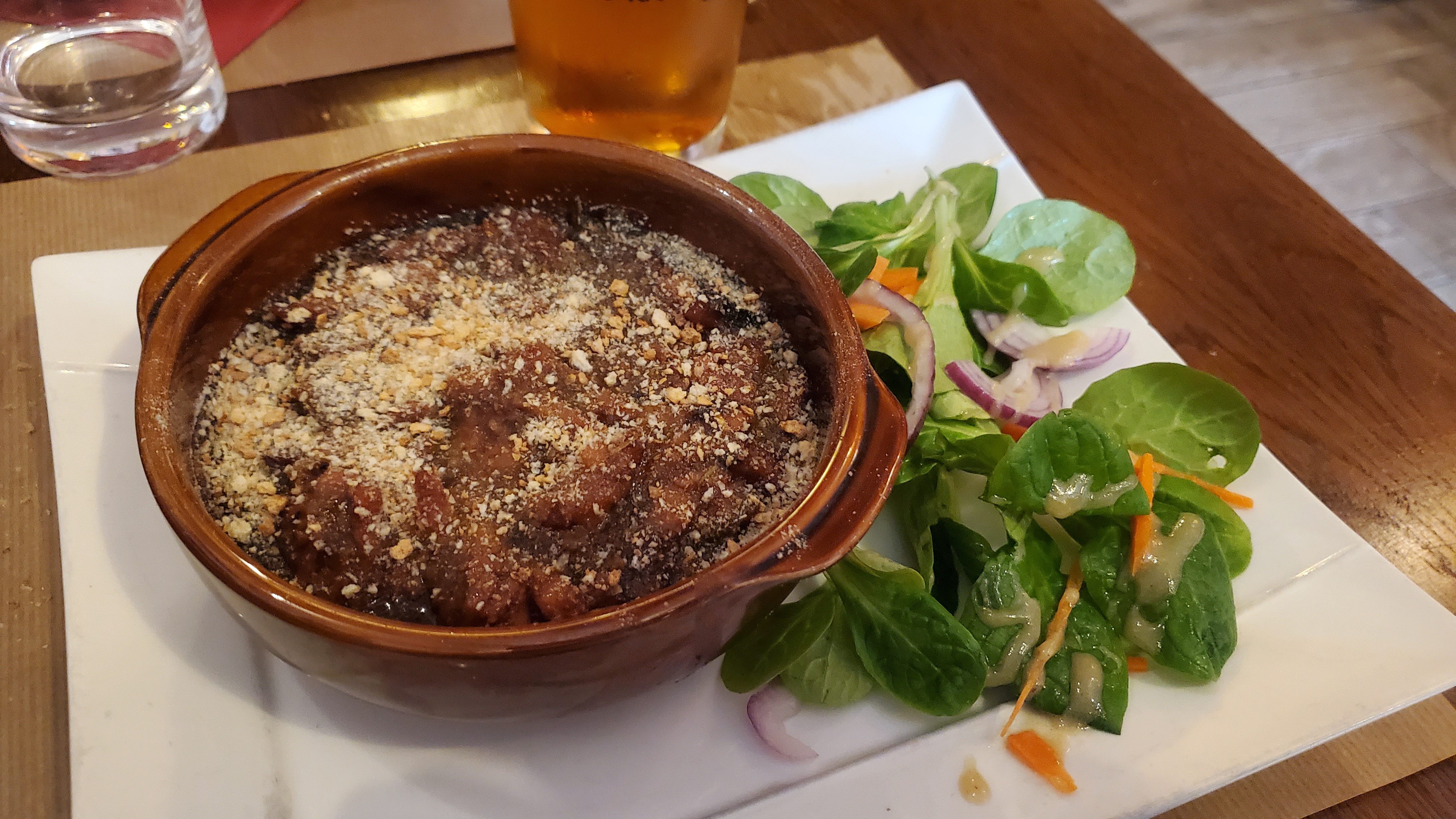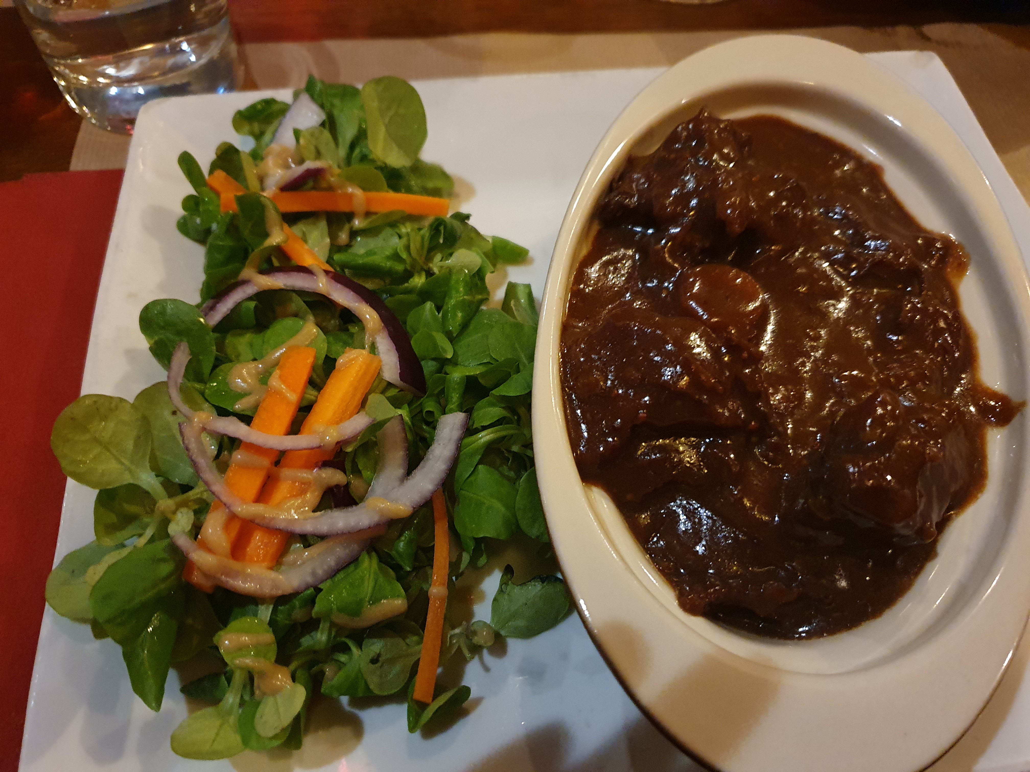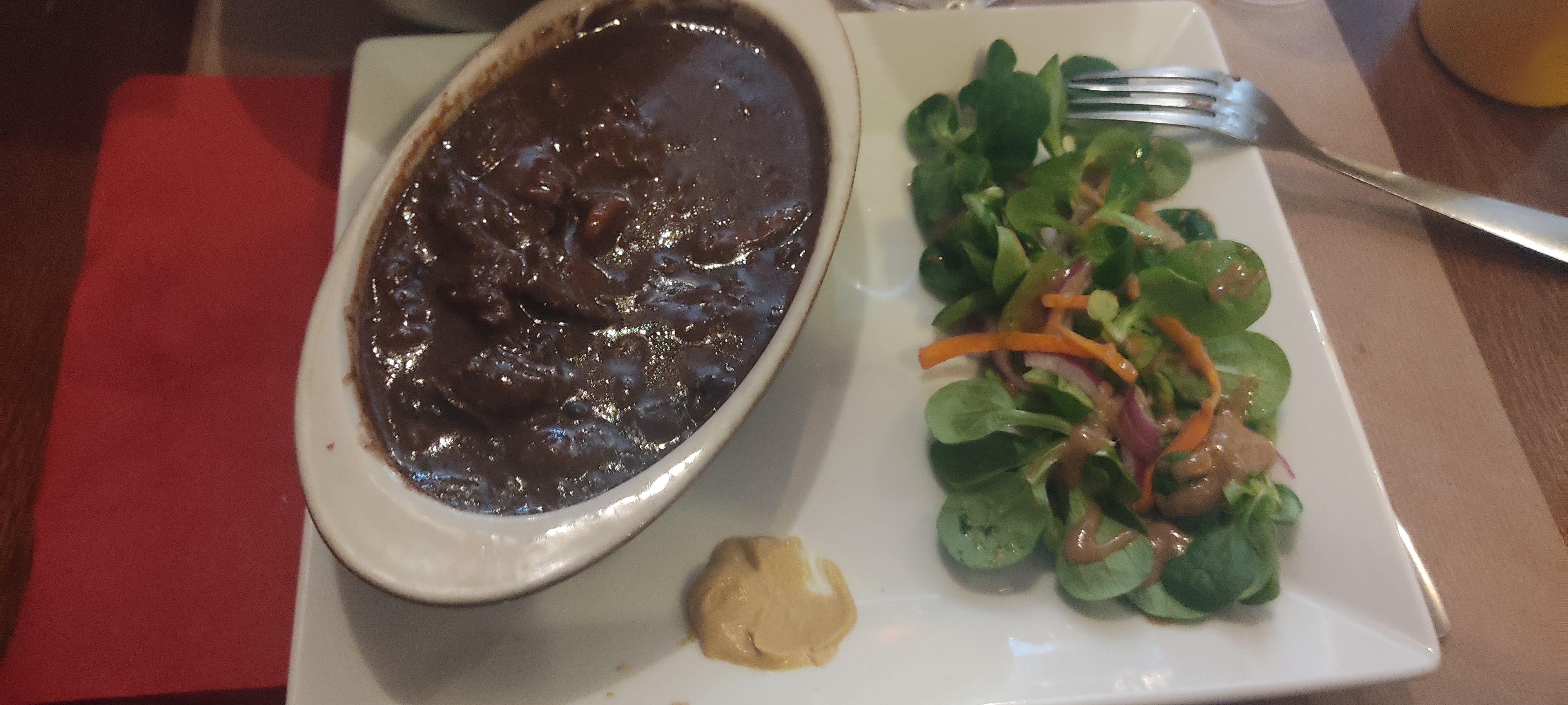 Repas du midi à 2. Nous avons pris la carbonnade et les joues de porc. Les joues manquaient légèrement de cuisson (encore un peu trop fermes). La viande de la carbonnade quant à elle était sèche ( un morceau plus gras serait probablement mieux adapté), la présence de baies de genévrier est dérangeante, on croque directement dedans sans les voir. Sinon, très bon accueil.
