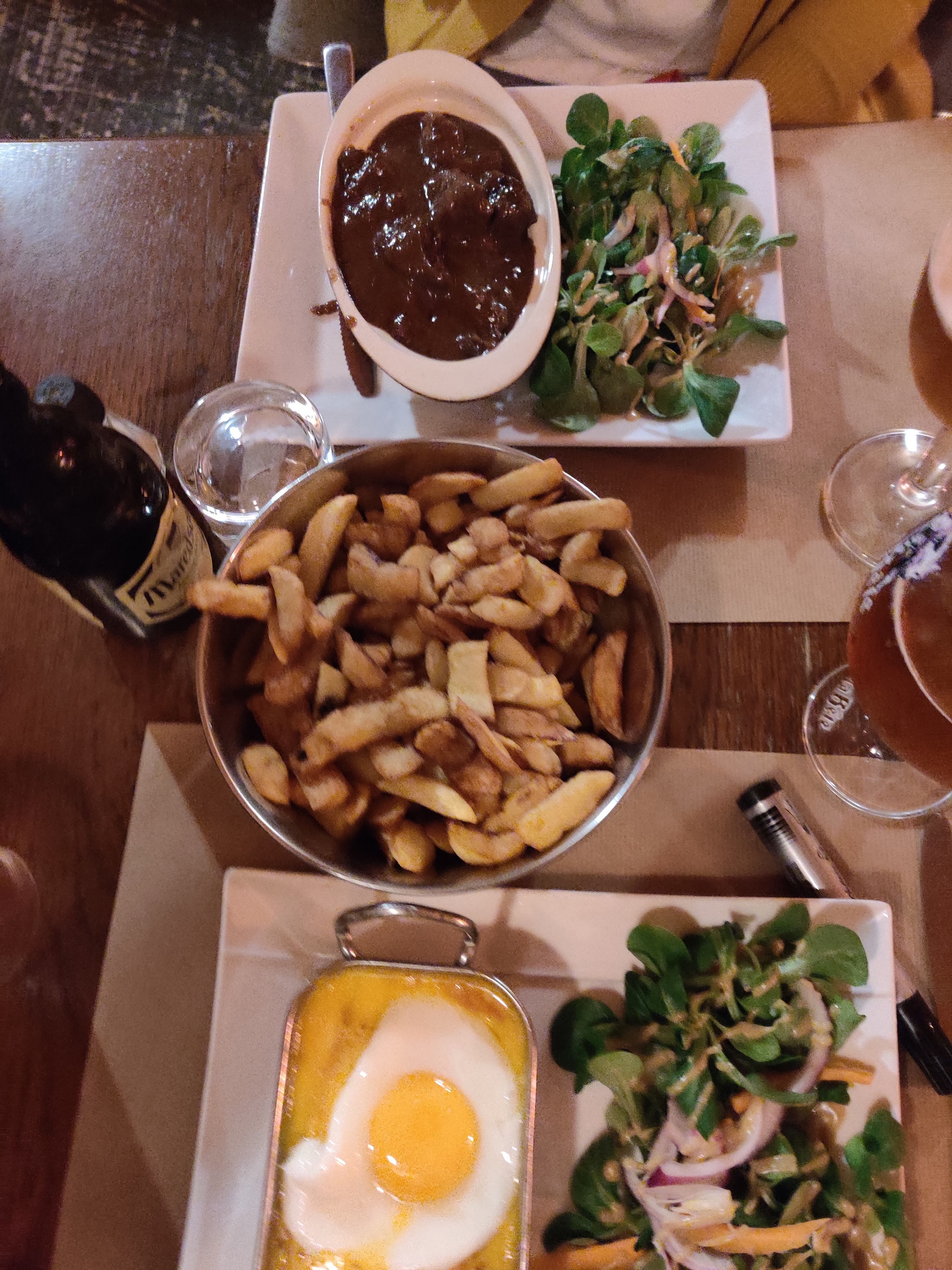Une attente seulement de 15 minutes. Un personnel très agréable. J’ai commandé une carbonate flamande, accompagnée d’une assiette de frites et d’une salade composée de radis, carottes oignons rouge sauce vinaigrette. Ce fût très bon, la salade et les frites étaient convenables. La viande ainsi que sa sauce étaient très bonnes. Un plat excellent pour se réchauffer en temps d'hiver.