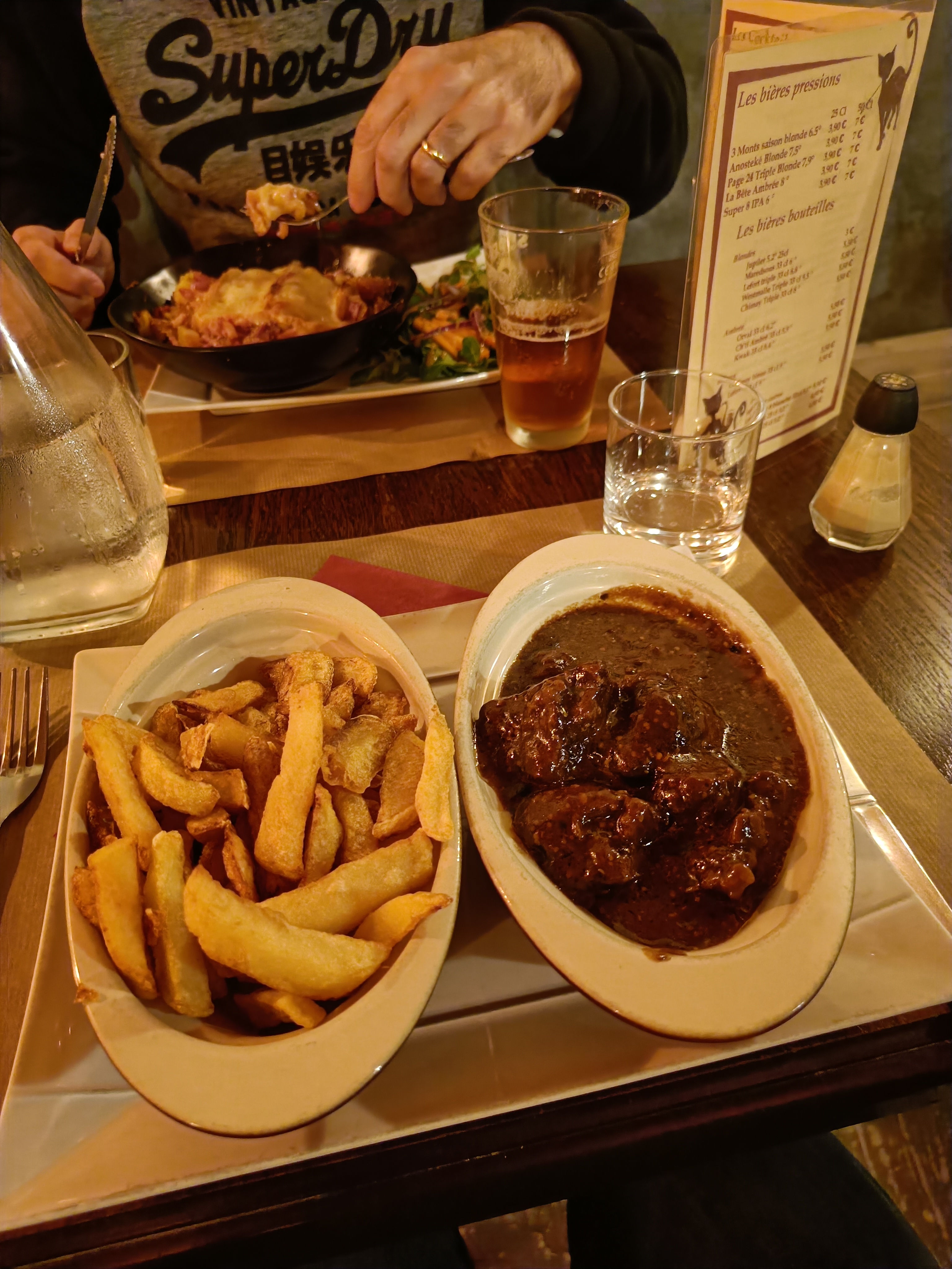 Carbonnade flamande excellente, service au ptit soin Prix honnete Je recommande fortement A deux doigts d’aller a Lille juste pour manger la