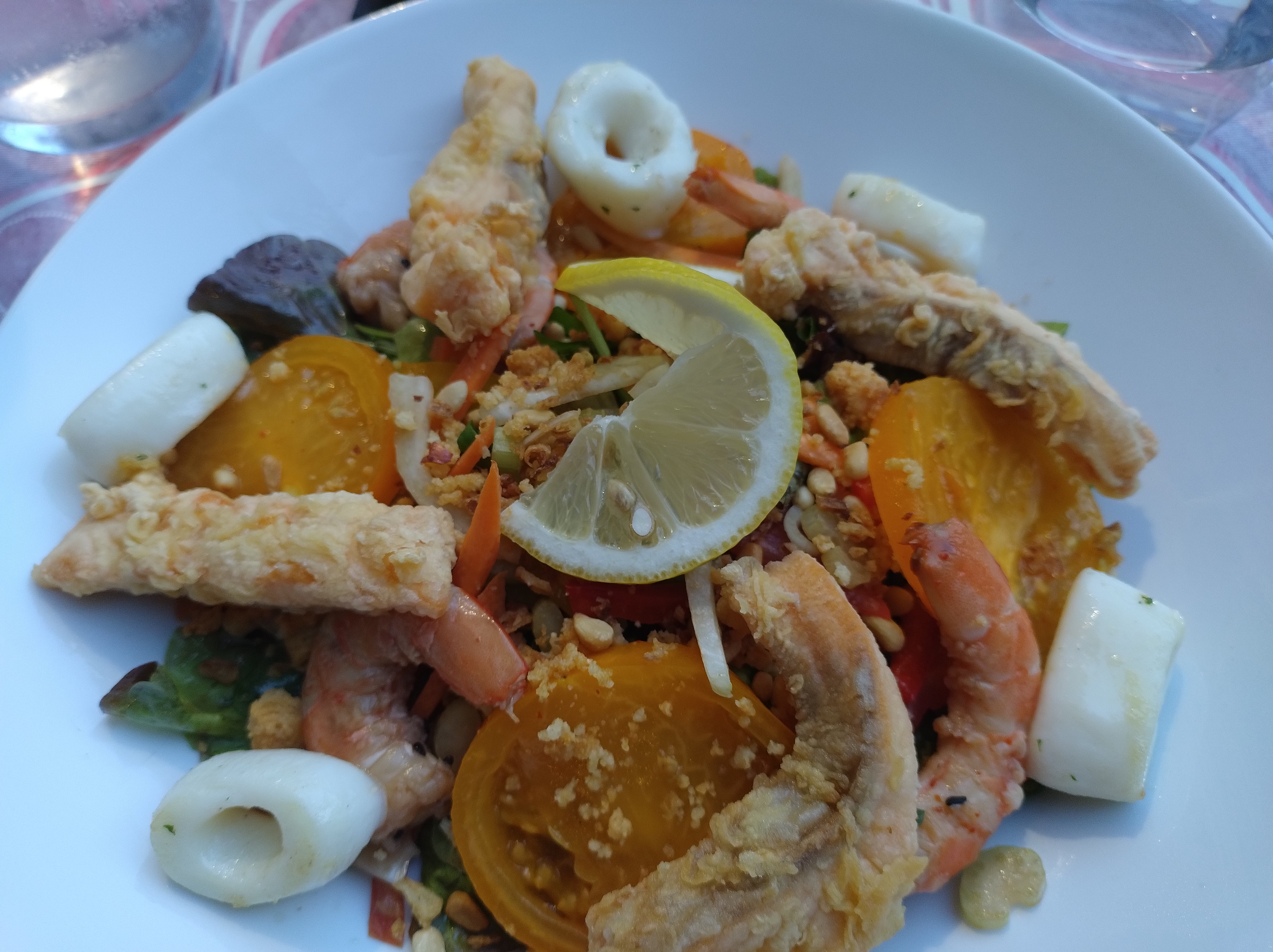 La salade du gros matou était excellente. Les légumes étaient croquants, goûteux et les poissons et crustacés savoureux. Le dessert était top.