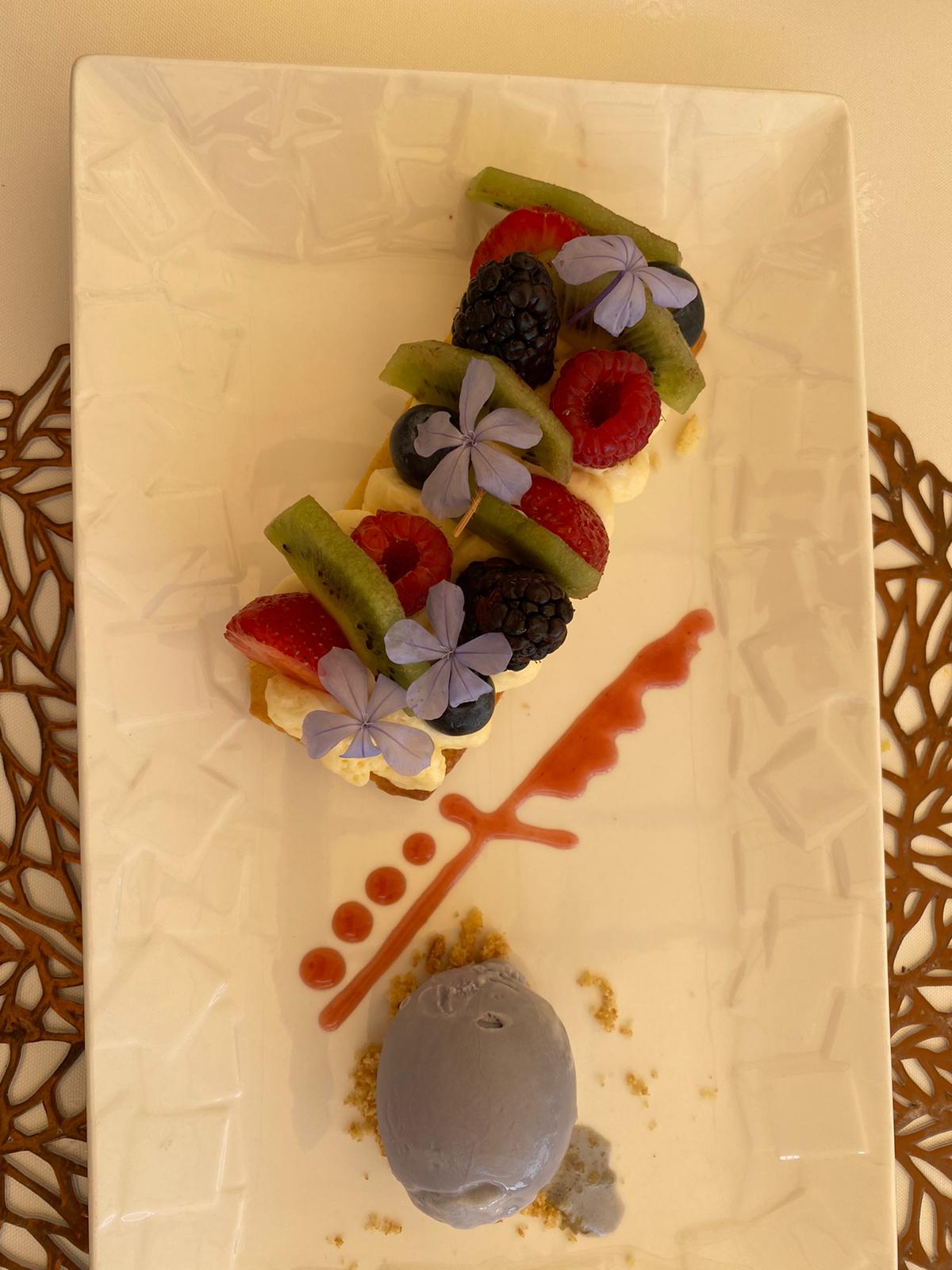 Moment agréable, service pro et sympathique, un bémol pour le dessert (mille feuille avec crème à la vanille bourbon ainsi que compotée de mure et mousse de chocolat) pas à la hauteur, par ailleurs espace bruyant car forte résonnance dans la salle de restaurant en terrasse couverte.