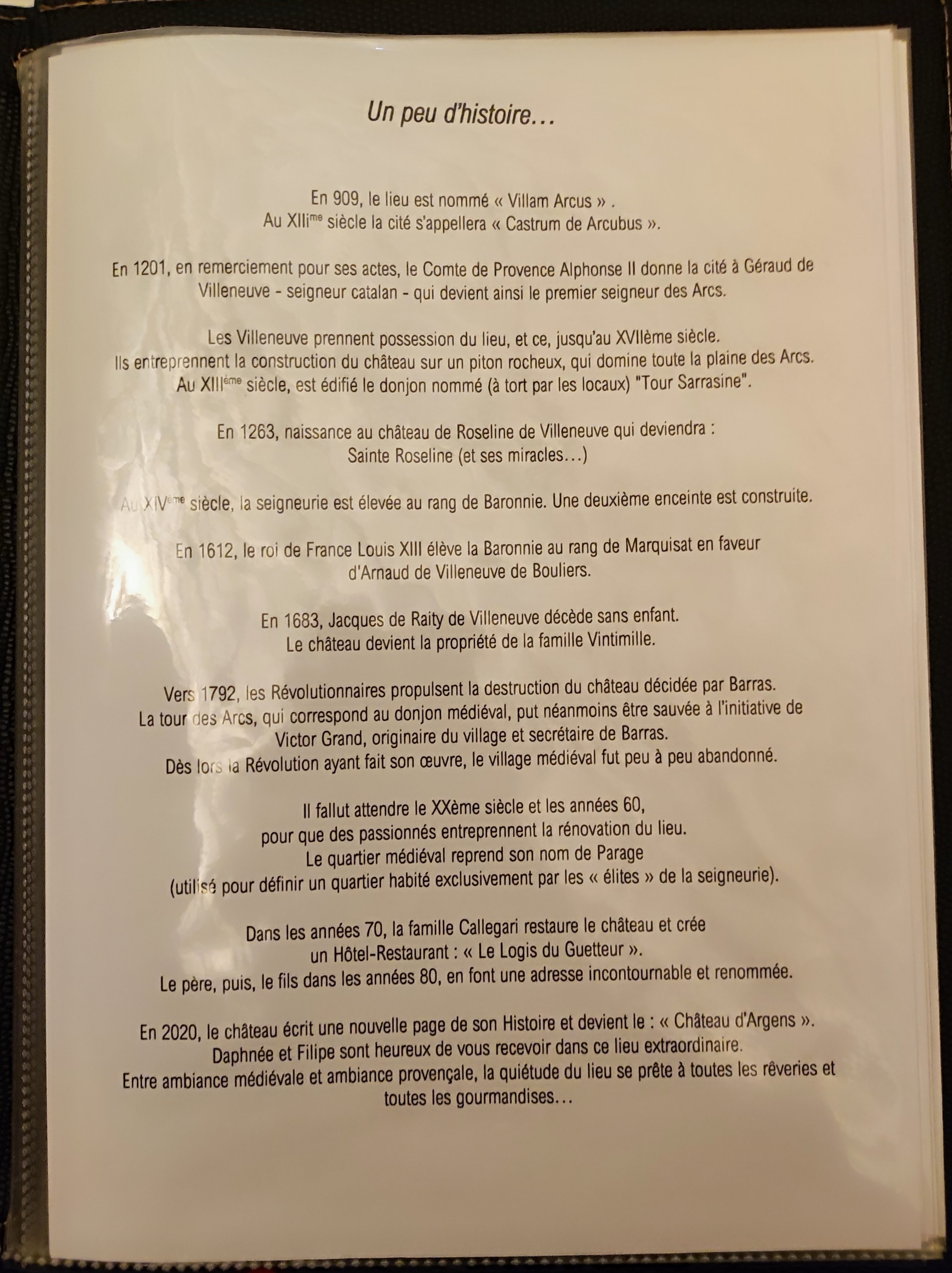 Une soirée d'anniversaire accompagnée d'une nuit au château d'Argens avec petit déjeuner le lendemain. Lieu calme et reposant, endroit magique, très beau château au sommet du village les Arcs sur Argens, offrant une vue plongeante sur le village et les environs. Déambuler dans les jolies petites ruelles médiévale au cœur du vieux village. Le restaurant vous offre un repas de grande qualité dans un dédale de salle sous les voûtes en pierre du château, le service est attentif. Un régal pour les papilles de l'entrée au dessert en 8 services en fonction du menu choisi. Les plats originaux, parfaitement cuisinés, comme le pigeon dans mon assiette (caille, poulpe,...), bravo ! Une nuit reposante dans une chambre calme, confortable et bien équipée (douche, toilette, TV, coffre fort,...) Merci.