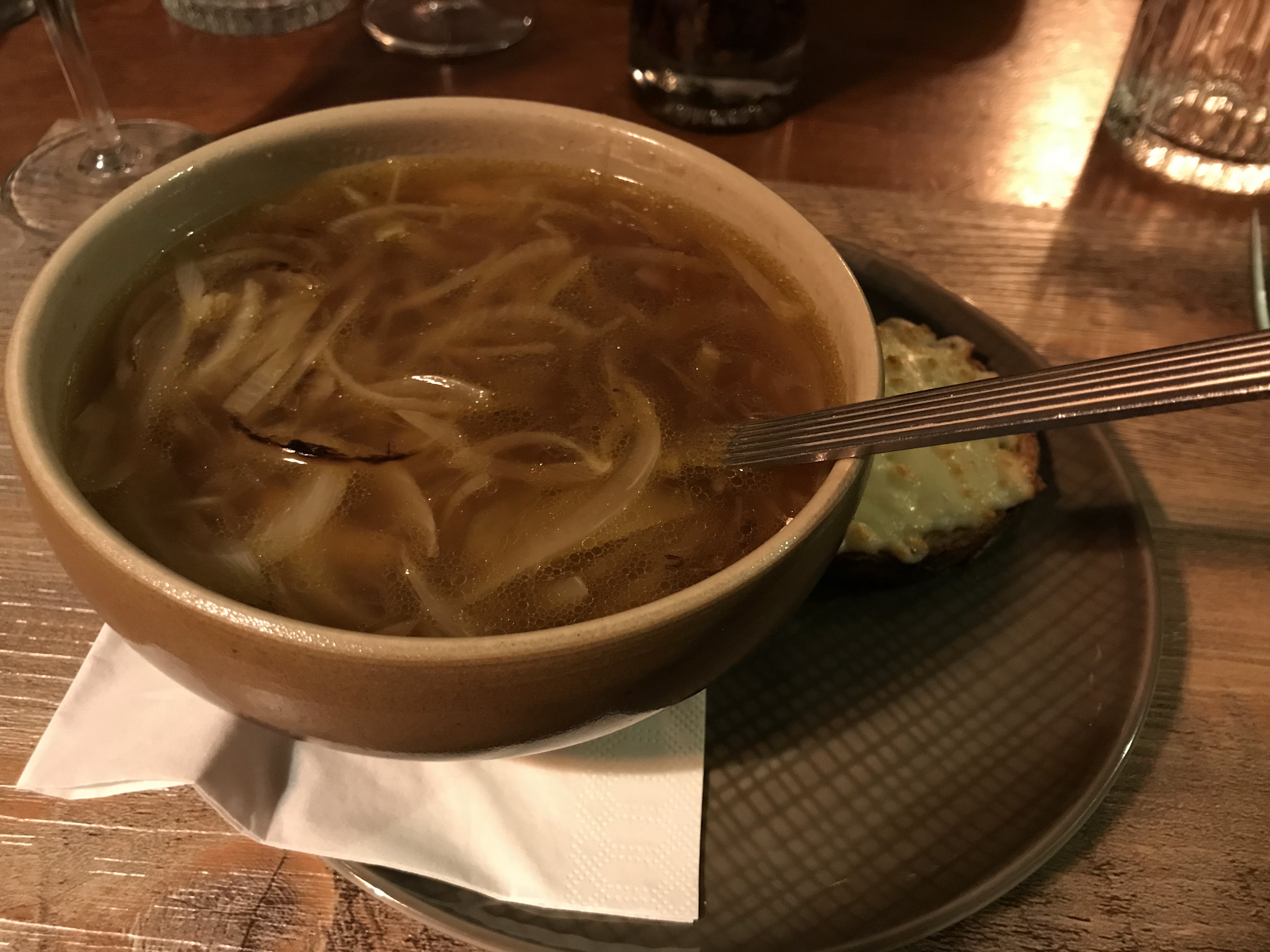 Restaurant à service très lent difficile à trouver et tout le restaurant sent mauvais, ils devraient ouvrir une fenêtre de temps en temps. La soupe à l'oignon était bonne mais je n'ai pas pu en profiter à cause de l'autre invité qui avait un barbecue à l'intérieur avec les fenêtres fermées, la fumée m'a donné la nausée.