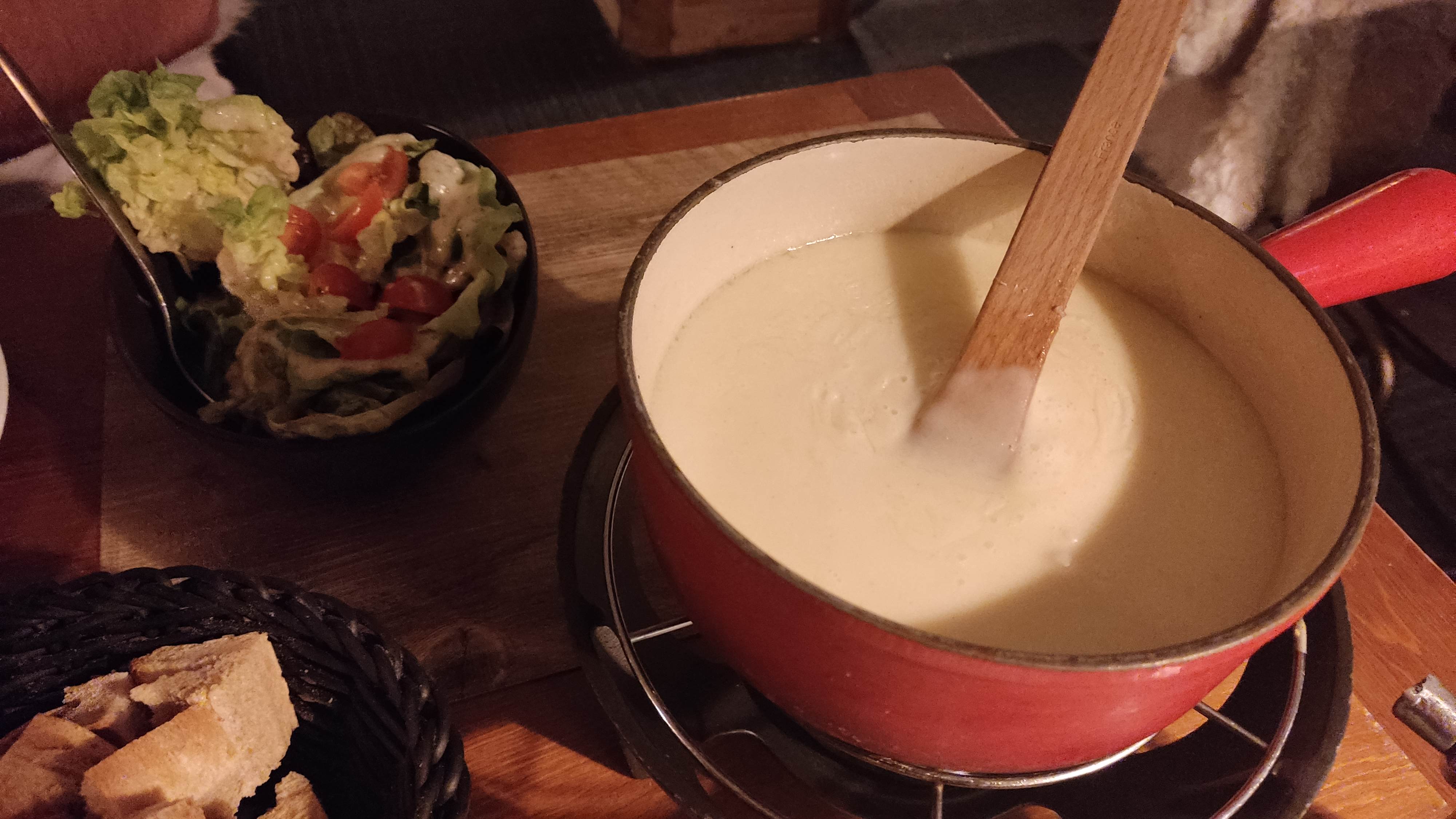 Un endroit très agréable. Mon mari et moi avons commandé la fondue classique pour deux personnes, nous avons tous les deux un gros ventre et nous avons horriblement mangé, c'était extrêmement savoureux, mais je n'ai pas mangé ailleurs, donc je ne peux pas la comparer. Le service était sympathique mais pas intrusif, très souriant malgré beaucoup de travail. L'ambiance est géniale, une atmosphère tellement familiale. Niveau prix env.