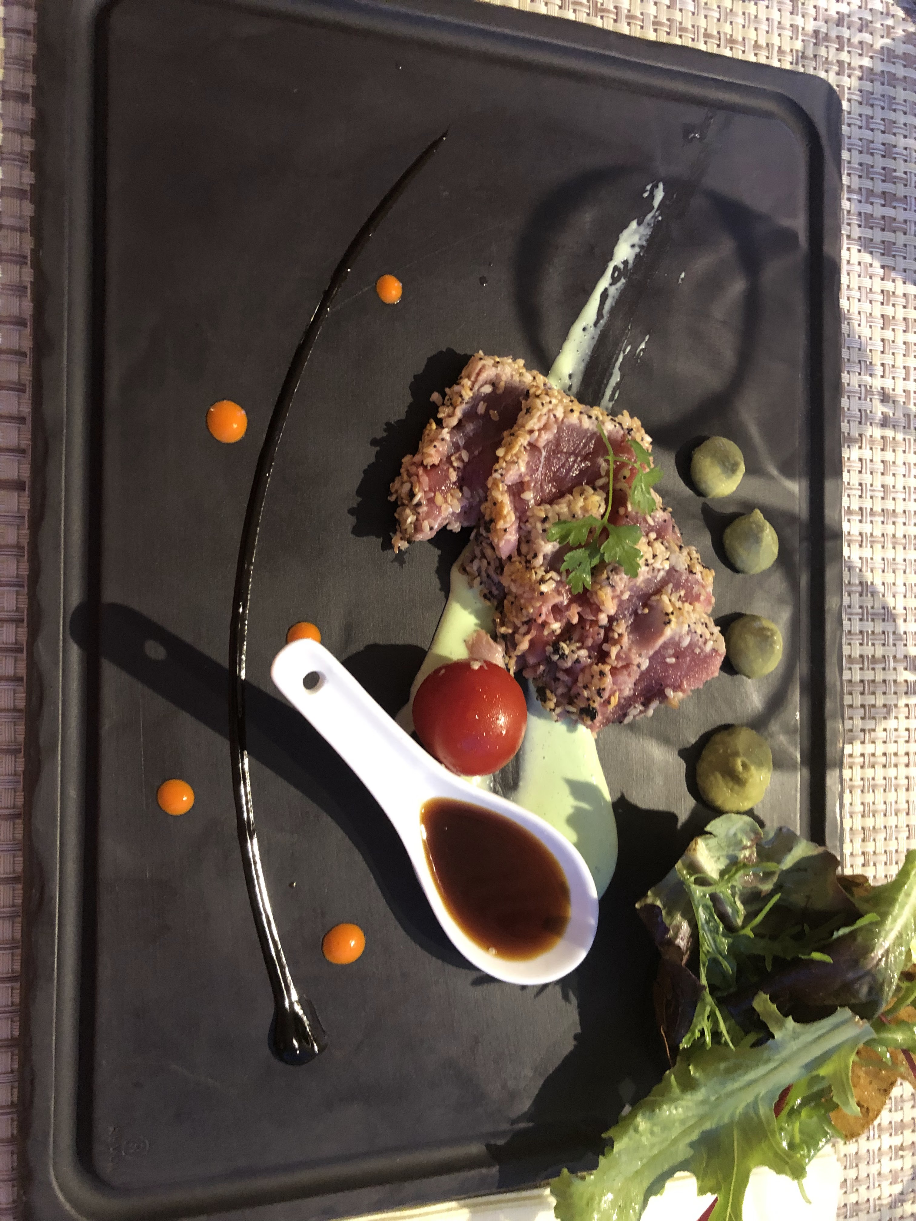 Parfait ! Tout était parfait : les produits frais, une cuisine soignée et un service au top avec une équipe aux petits soins. Nous avons testé hier le tataki de thon au sésame. Un délice. La seiche grillée était parfaite. Du coup, nous avons renouvelé l'expérience ce jour : bar en croûte de sel et langoustines flambées au cognac. D'extraordinaires saveurs, une présentation recherchée, que demander de plus ? Tout cela avec le cadre bucolique de la vue sur la plage. Quel dommage que nous soyons pas des locaux pour en faire notre cantine. Nous avons également apprécié le petit geste 🥂🥃 et la gentillesse du patron au moment de notre départ. Bonne continuation à toute l'équipe. A recommander ++++
