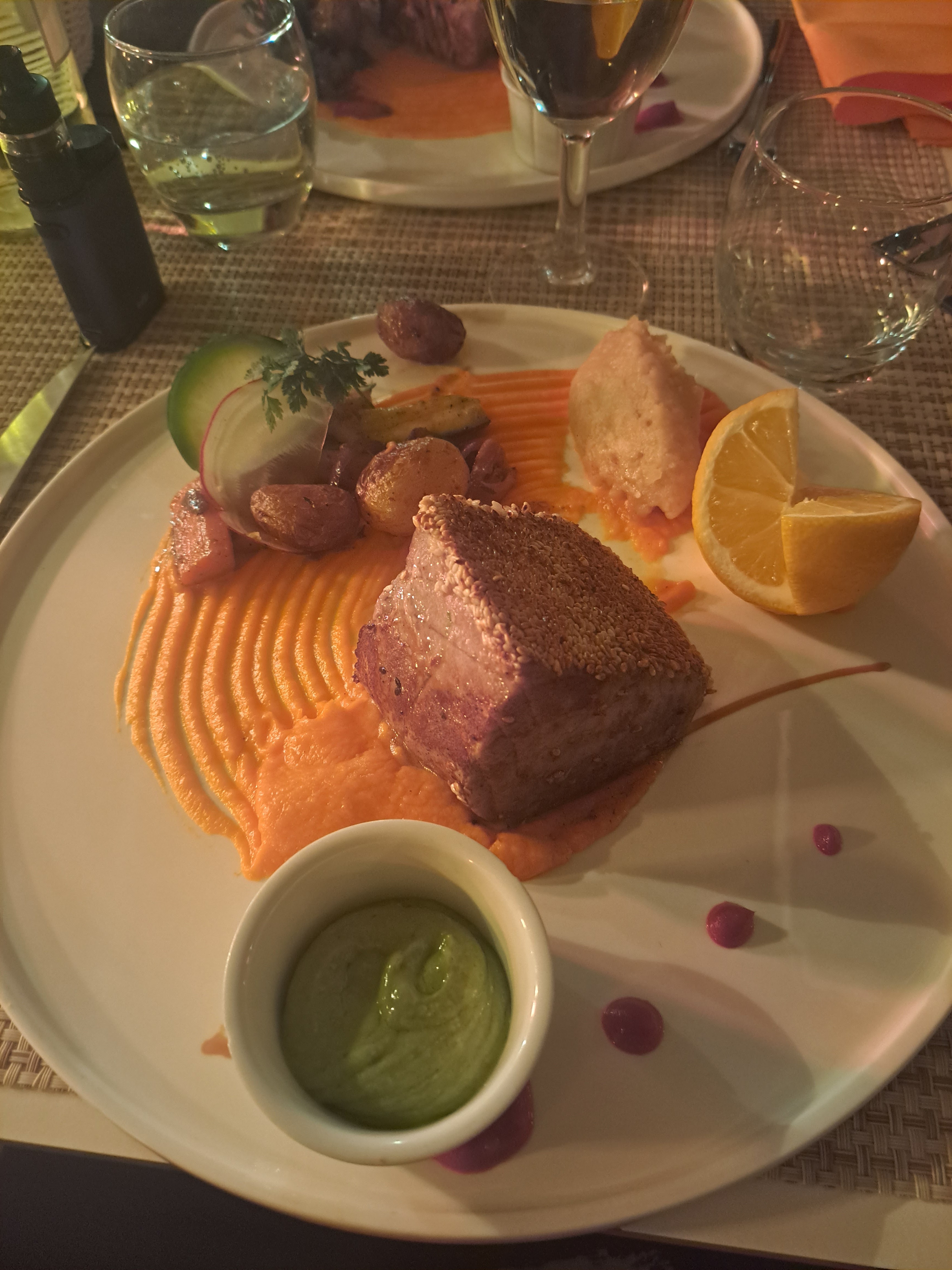 Succulent ! C’est un vrai délice , cuisine raffinée Ce restau a été une vrai belle expérience culinaire Le poisson est cuit à la plancha Servi avec des petits légumes bien assaisonnés: gingembre, carottes, courgettes, purée maison Menu enfant : steak de bœuf ou de thon avec frites maison Les portions sont copieuses Pain semble cuit sur place (très frais) Il faut vraiment y venir plutôt que de manger des les restau fast food du port ! Personnel agréable vraiment bravo ! C est la cuisine raffinée à la française