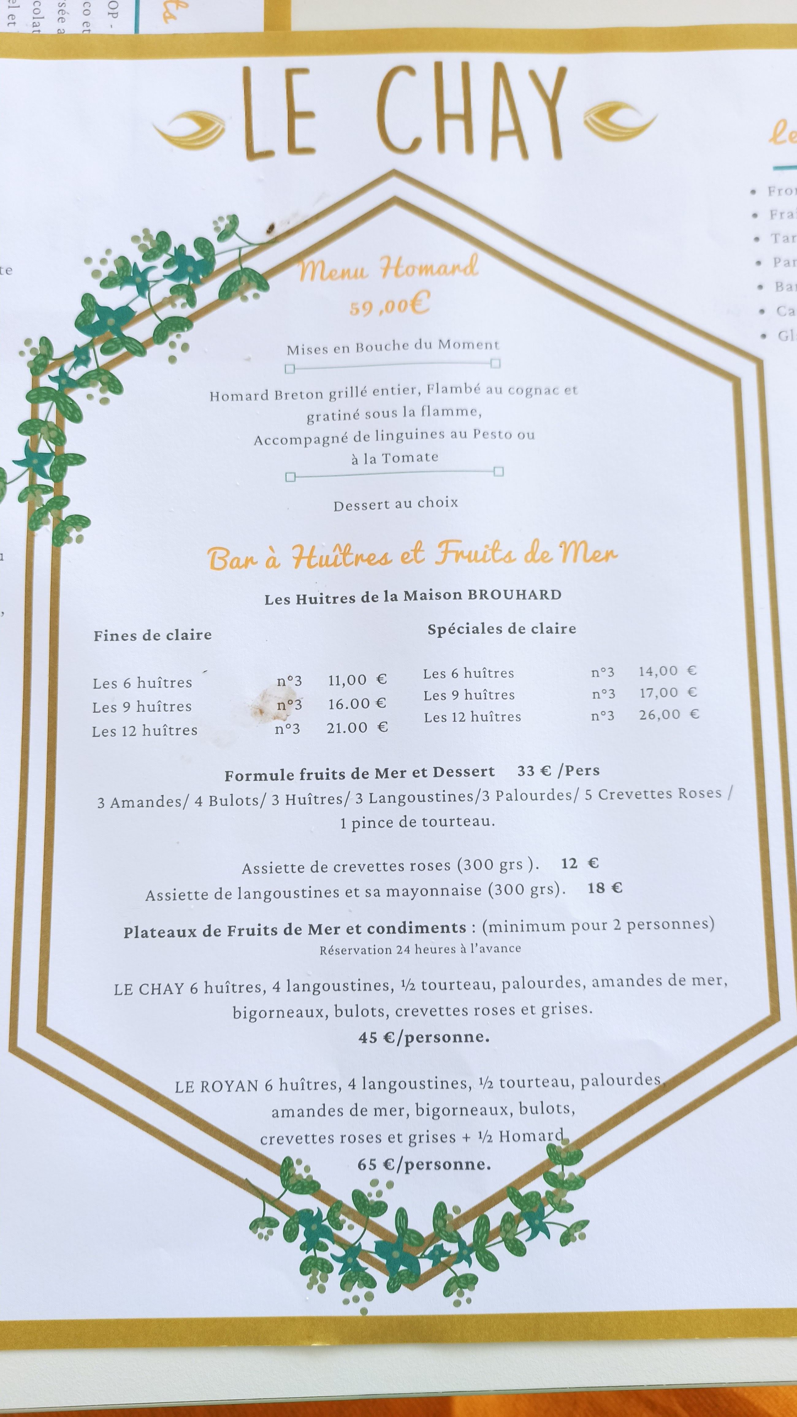 Nous apprécions beaucoup cet endroit qui bénéficie d une magnifique vue sur la plage du Chay. Le personnel est attentionné et très agréable. Les salades sont copieuses, le menu du jour très abordable, et vous pouvez vous régaler avec le menu homard... De quoi ravir tous les budgets !