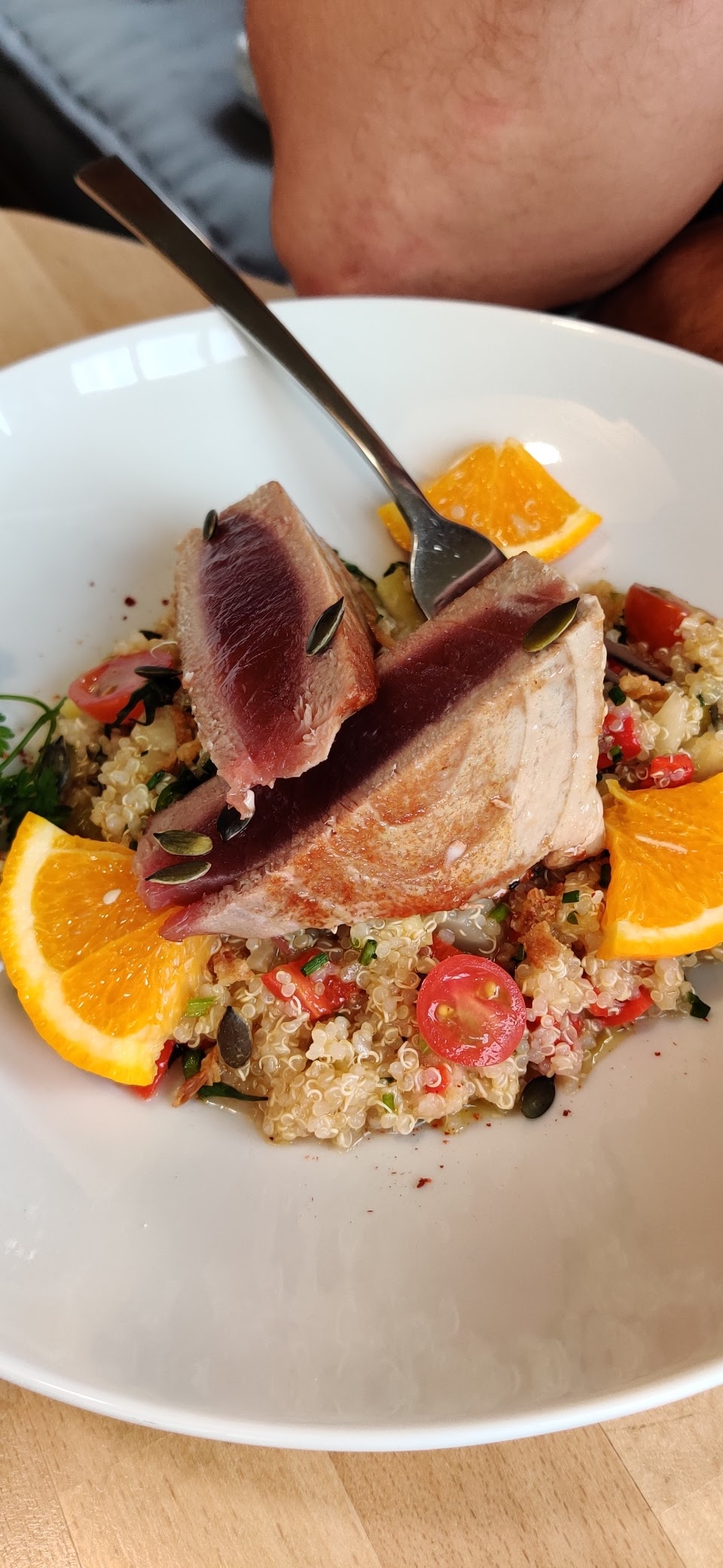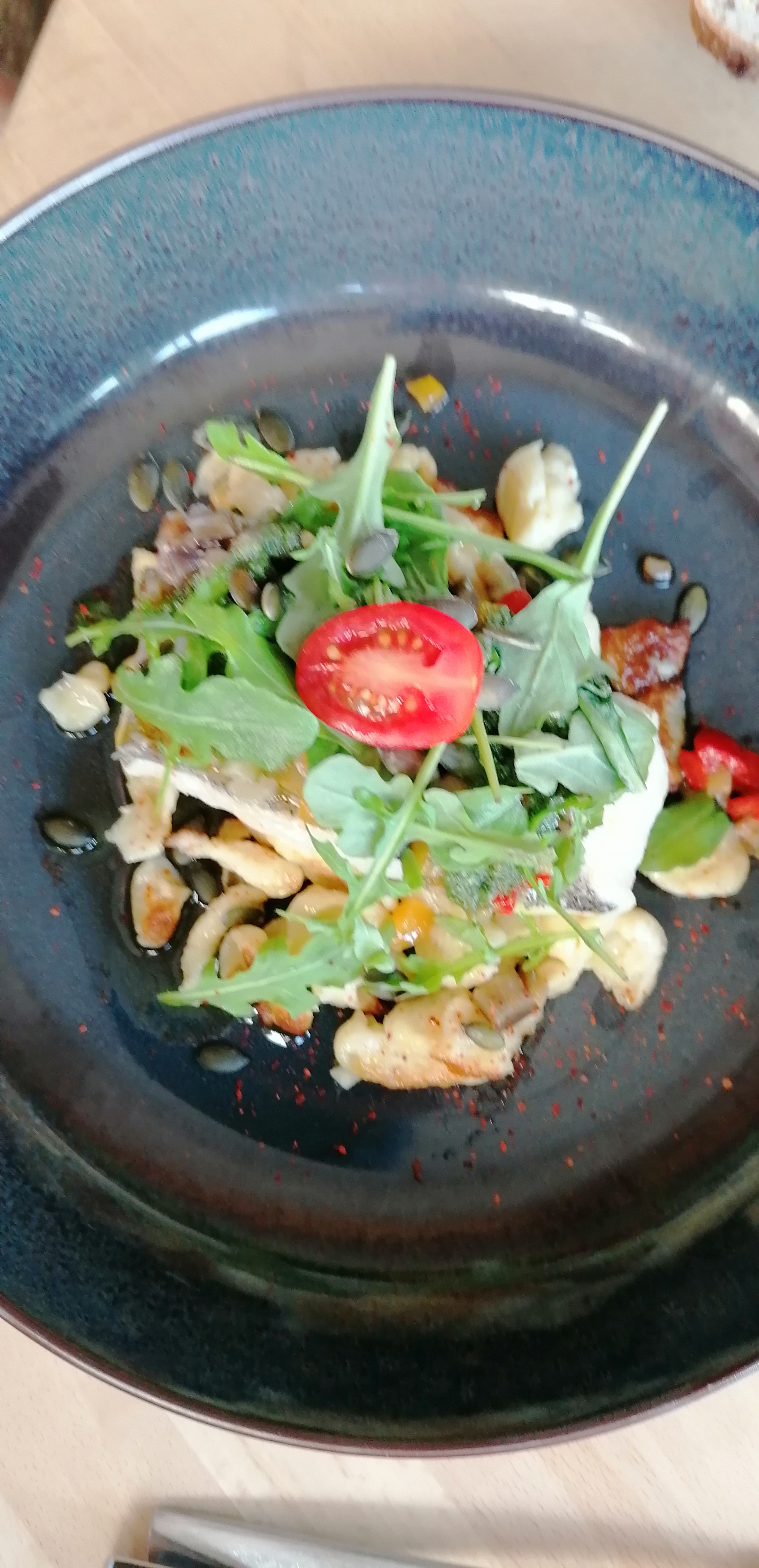 Belle découverte. Cadre soigné. Assiette gourmande. Seul petit point à améliorer : il serait peut etre judicieux de proposer une autre variété de pain pour les personnes intolerantes aux graines type pain de campagne. Il est dommage de se voir proposer du pain de mie à la place, ce n est pas en accord avec la qualité des plats proposés. Merci