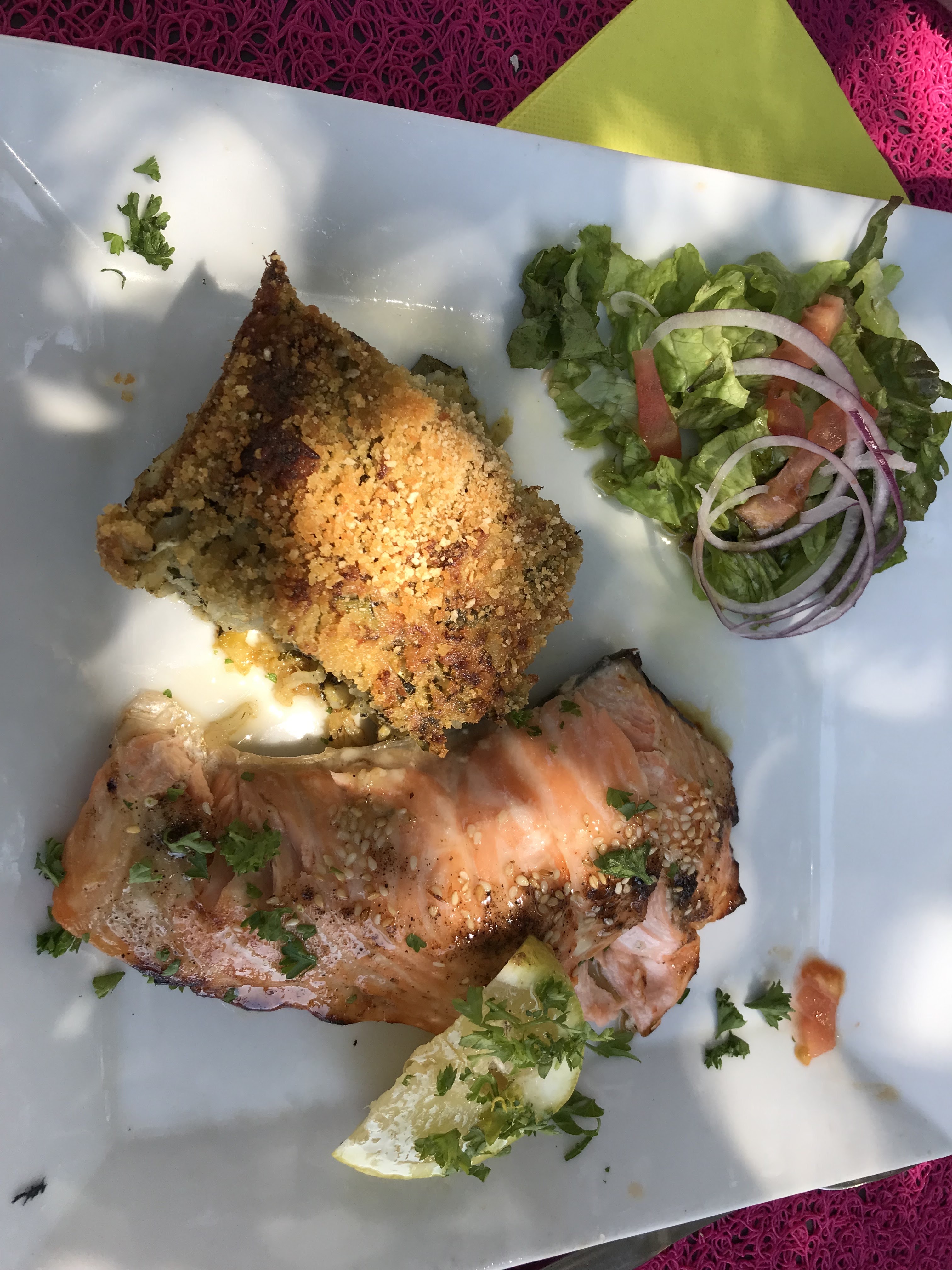 Personnel sympathique, et restaurant très bien situé. Cependant, nous avons été très gênés par les mouches, durant notre repas. La pizza n'était pas très bonne, trop salé. Le poisson servi sans citron, mais la cuisson allait. Le gratin de courgettes devait daté un peu. Et malheureusement, 1h après avoir mangé, je me suis sentie mal...