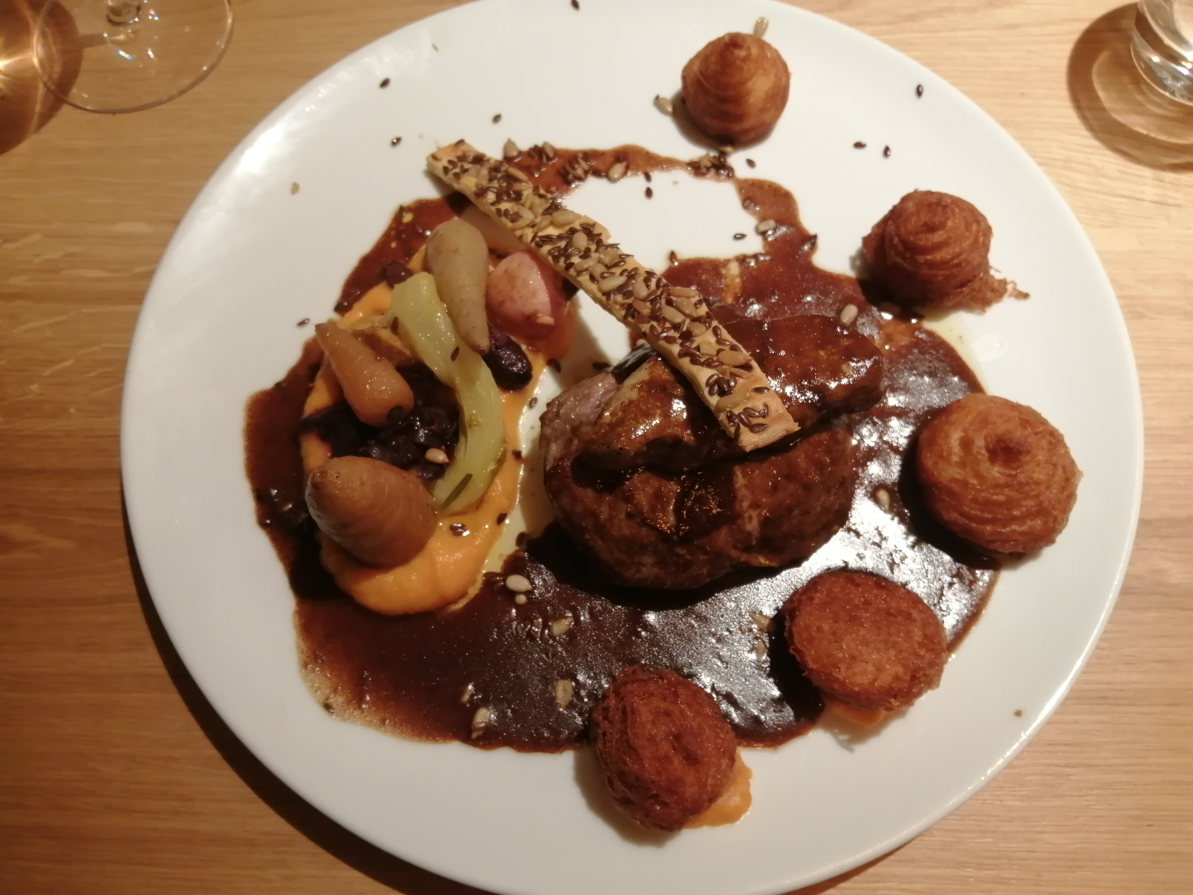 Délicieux mille feuïle passion indubitablement le clou du repas. Le veau cuisson basse température était parfait. Dommage pour la sauce foie gras baignée par le jus de cuisson des délicieux légumes. Maladresse du serveur qui a renversé mon eau sur la table et n as pas jugé nécessaire de l essuyer... Rien de bien grave et vite oublié. Avec la qualité des mets et bons conseils de la serveuse en choix des vins. On y retournera avec certitude.