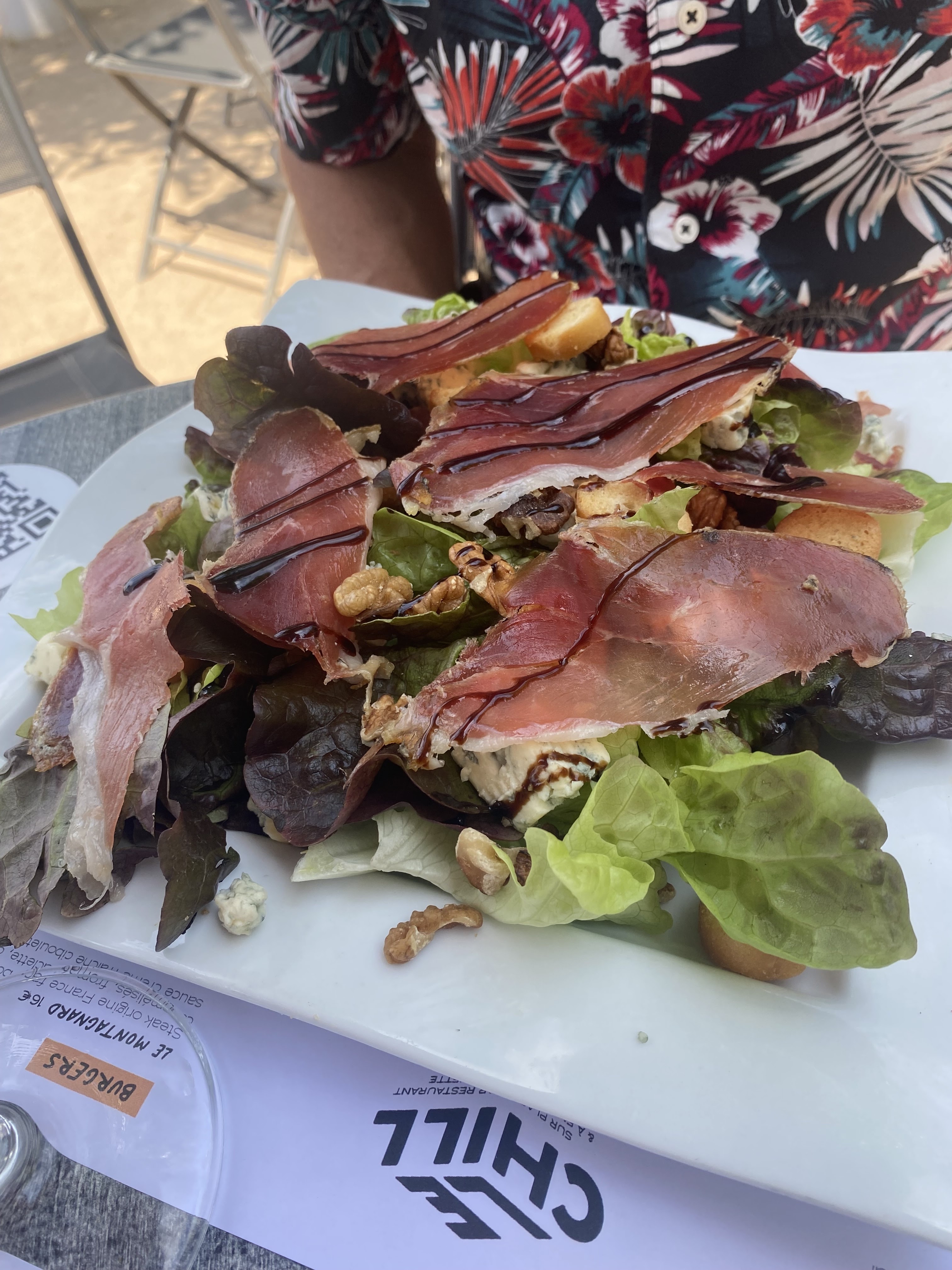 Alors pour le positif reconnaissons que nous sommes arrivées tard vers 14h et qu on a eu la gentillesse de nous accueillir. Verre de rosé parfait. Quant à l assiette je n avais encore jamais vu ça en fait ....du produit cheap....croutons industriels très bas de gamme. Idem pr le parmesan...petits carrés tous identiques. 4 ou 5 lamelles de magret de canard et hop. Le tout pr 16 euros. Je ne discute même pas le prix mais la salade en elle même....alors oui c est un endroit sympa mais pr la cuisine.......on repassera ou pas ....