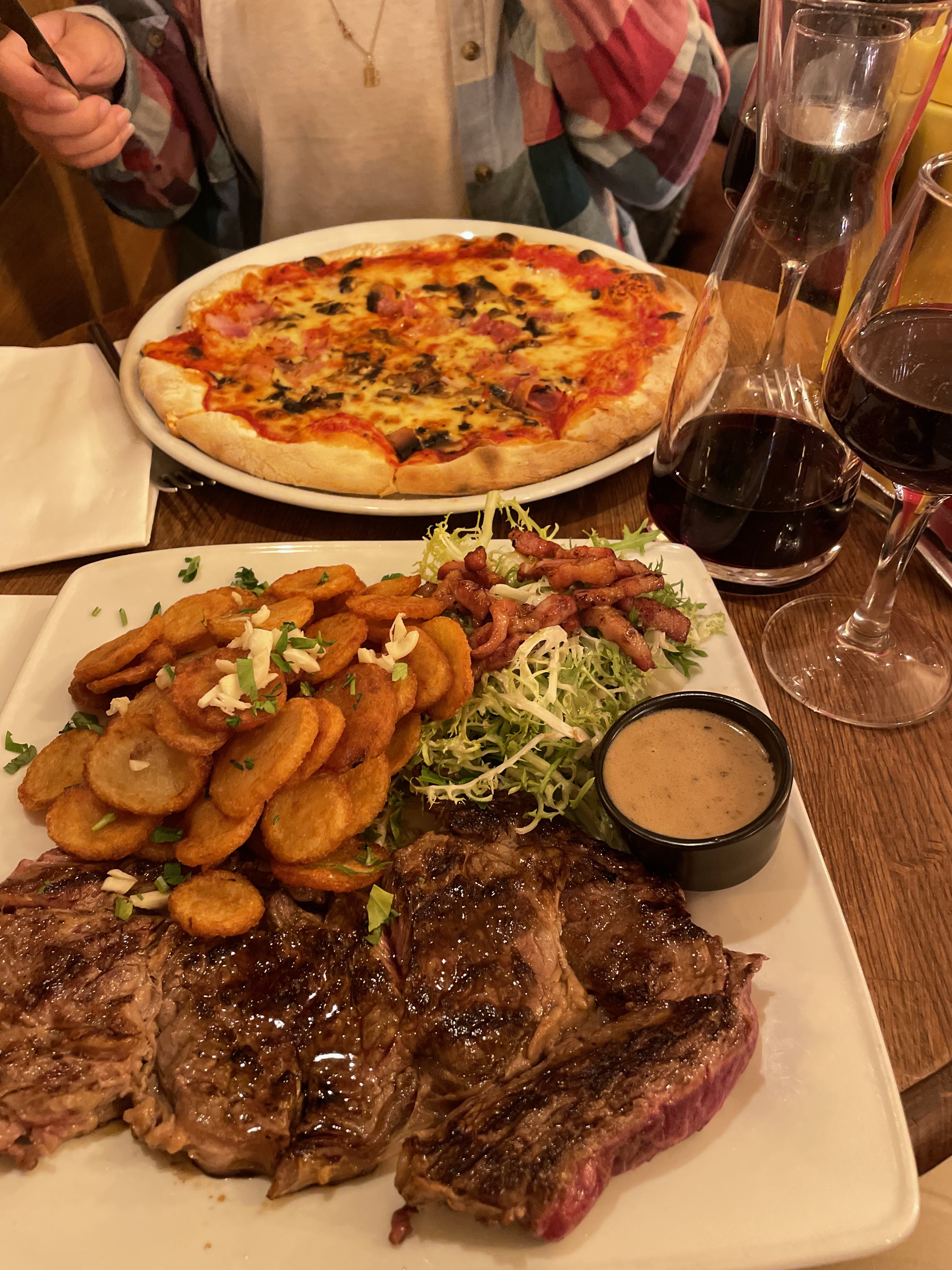 Arrêté pour un déjeuner tardif. Nous avons eu une soupe à l'oignon française et du camembert en entrée, du canard confit, du steak et de la pizza en plat principal. Toute la nourriture et les boissons étaient incroyables et le service était excellent. Je recommanderais certainement de venir ici. Nous avions 5 entrées et plats principaux, une bouteille de vin et 2 carafes et c'était 37 € par personne.