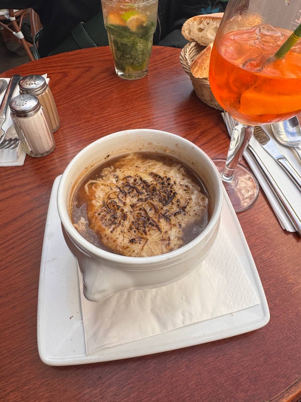 Nous avons chacun pris un café, suivi d'une soupe à l'oignon et d'une pizza. Rien d'exceptionnel, mais nous nous sommes retrouvés avec une intoxication alimentaire, peut-être due à un lait de soja trop vieux.