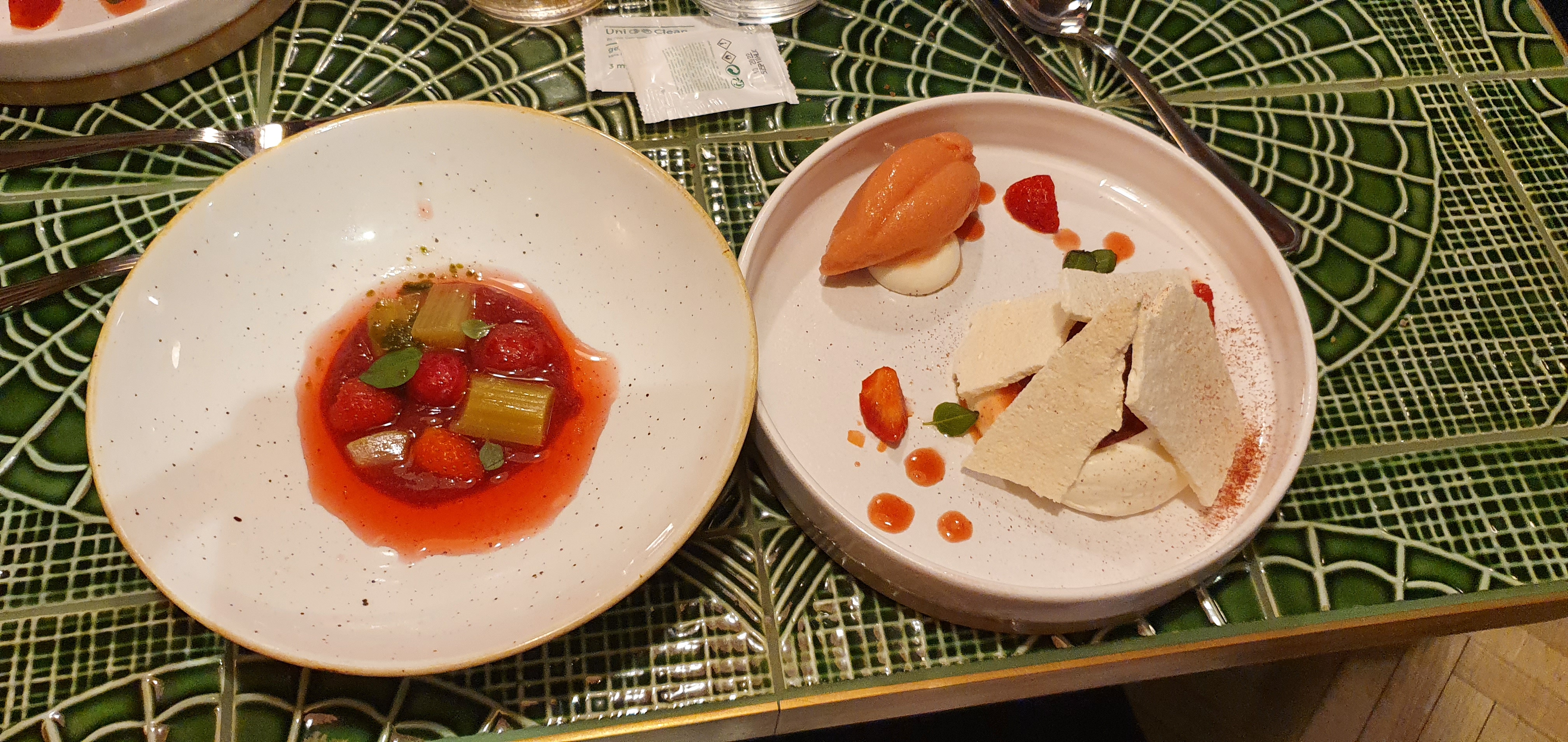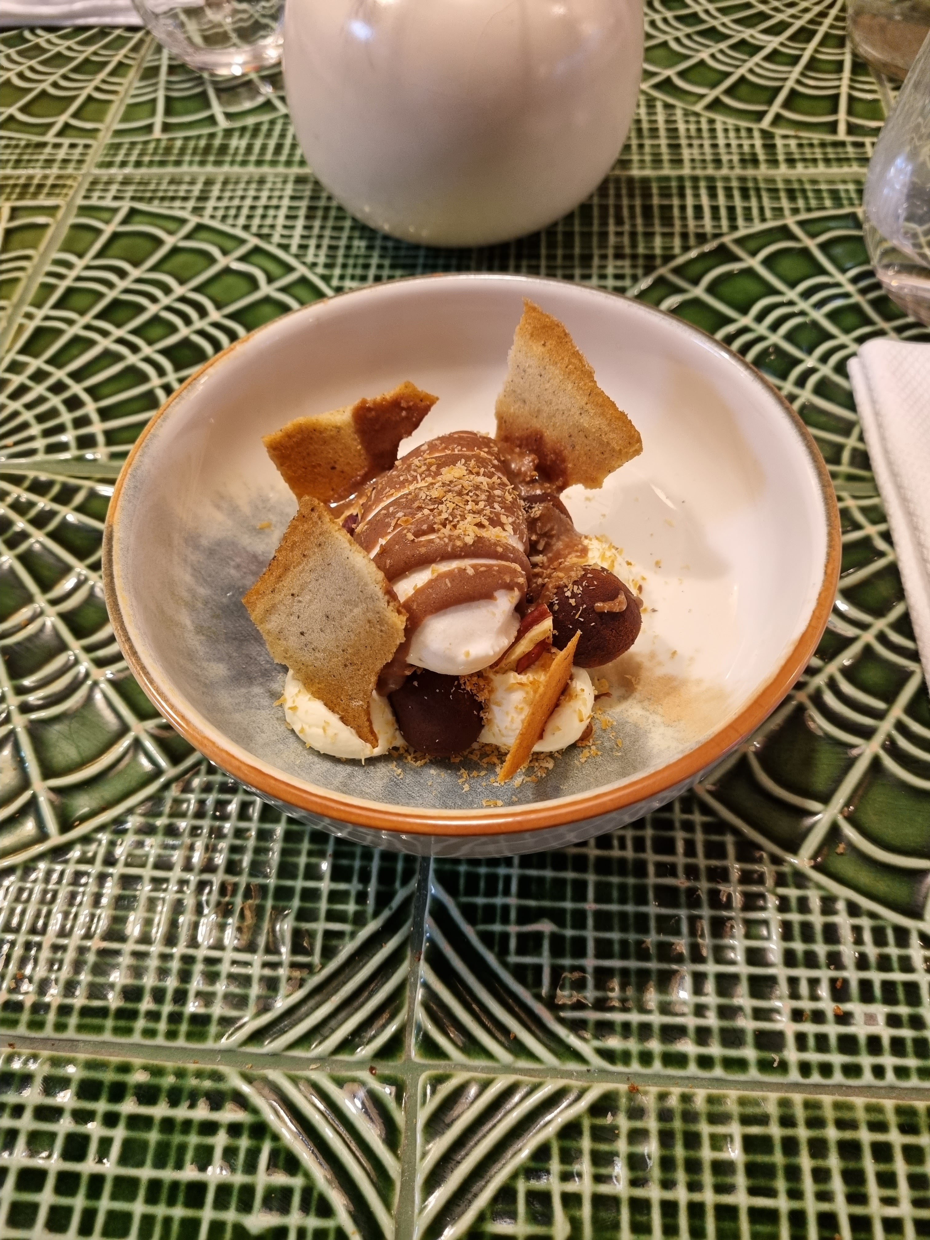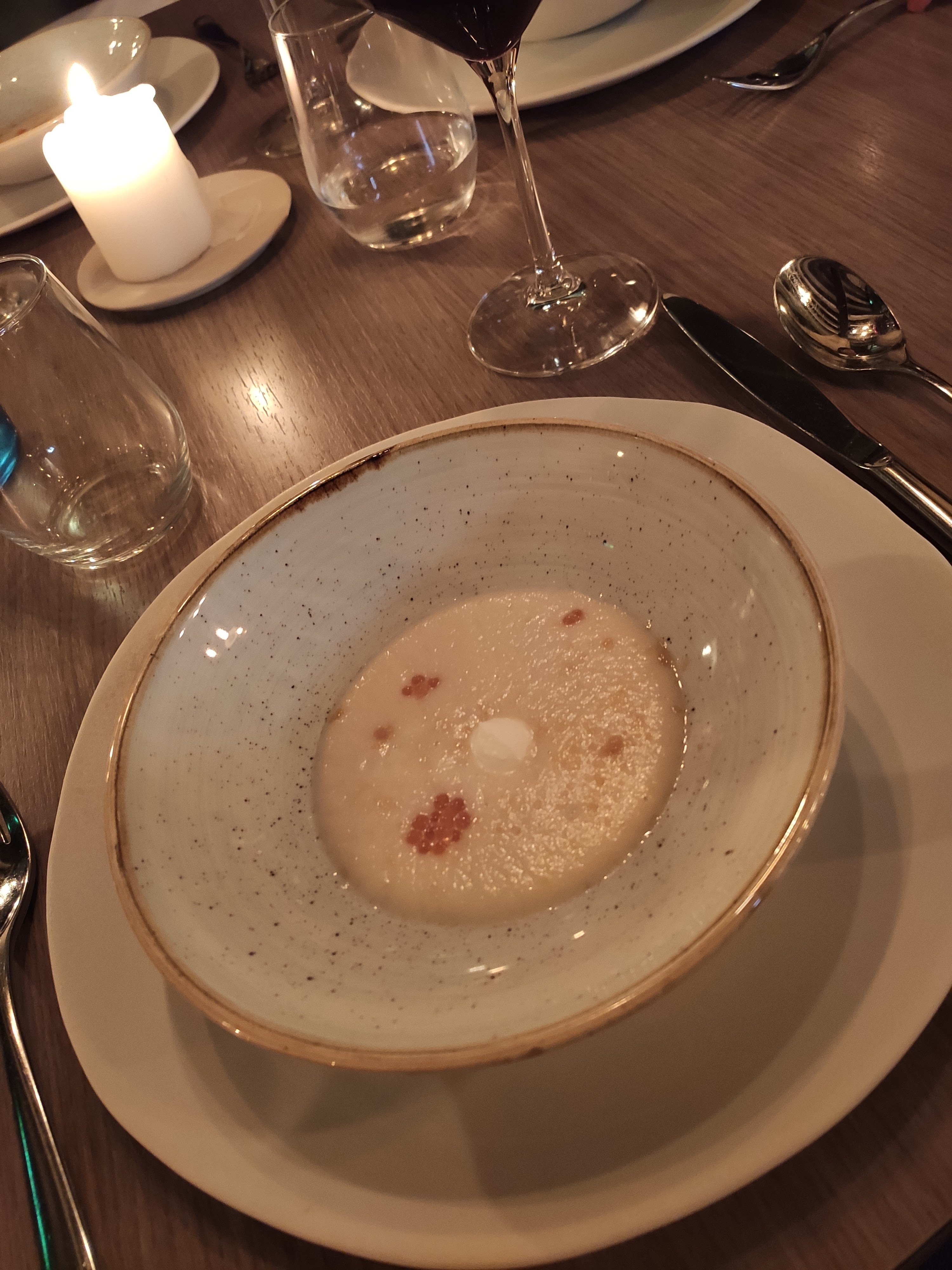 Dîner à la carte (5 plats 69€) pour deux sans alcool. Un bon début, mais le plat principal (poulet) était décevant. Une collation intéressante avec de la glace et du wassabi. Le deuxième apéritif est également intéressant : la patate douce. Le premier plat principal était du poisson dans une mousse aérienne. Bonne exécution, goût intéressant. Le deuxième plat principal est un morceau de poulet avec de la purée de pommes de terre. Eh bien, c'est très simple. En dessert, glace avec génoise, ganache et chocolat italien. Savoureux, mais pas étonnant. Il est possible que vous ne mangiez pas suffisamment. Pendant le dîner, ils ont proposé une sélection de fromages pour 19 €. Bouteille d'eau gazeuse 8€.