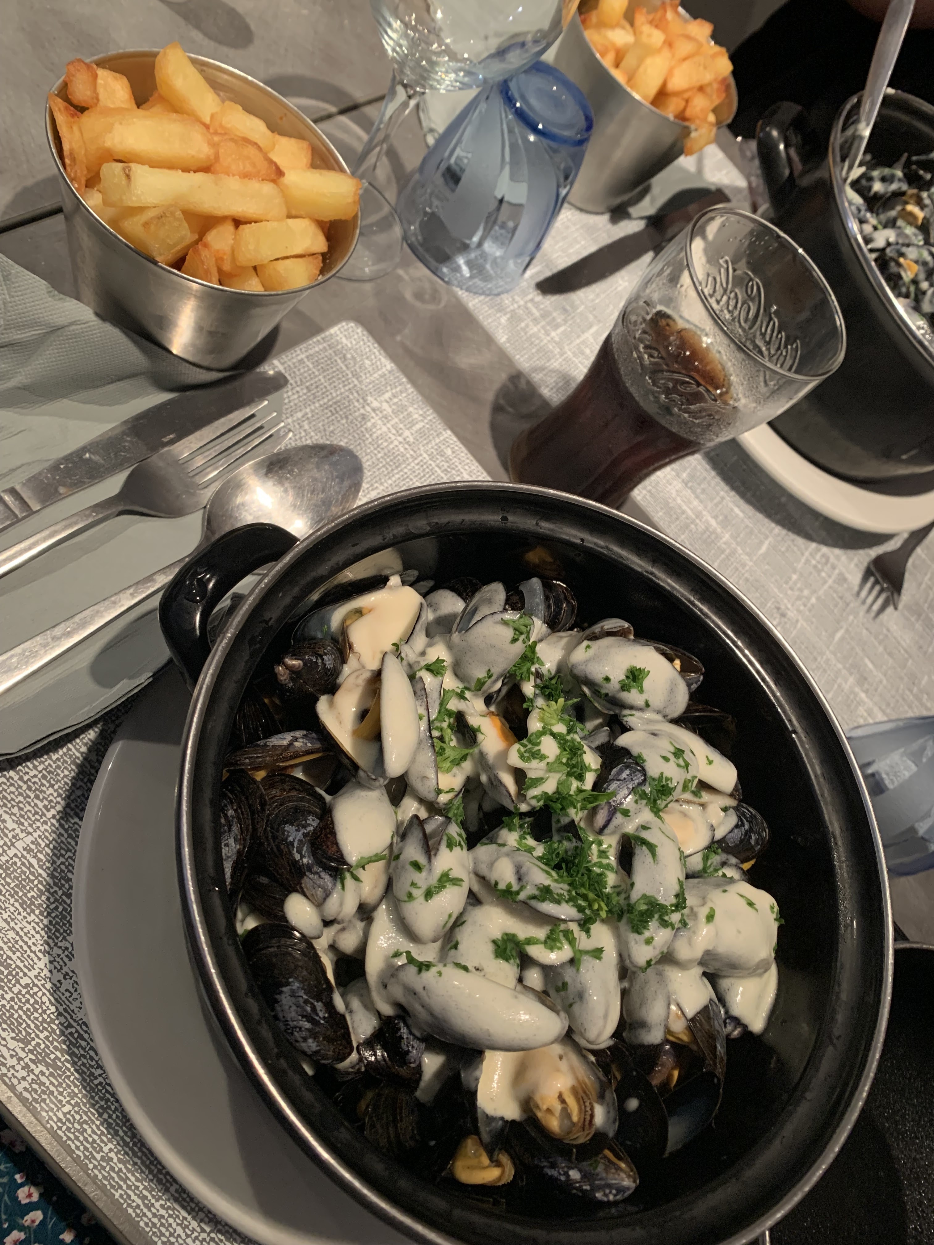 Service trop long. On demande pour avoir une petite portion de frites car bébé pleure, refusé. Pas de pain quand on en demande. Pour les moules, elles sont bonnes mais celles à la crème c'est pas une mouclade c'est de la crème déposée dessus. Pas top