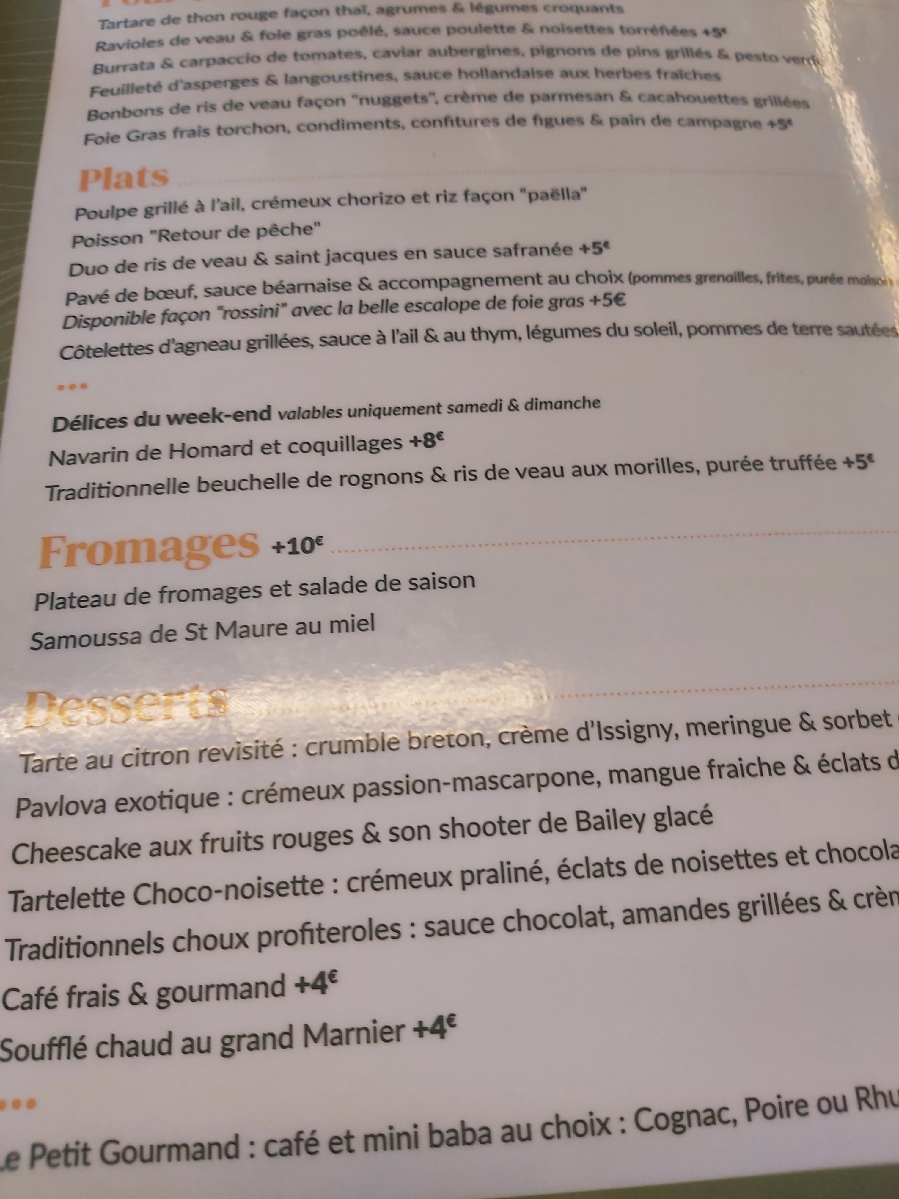 Bonne cuisine mais un peu classique. Rapport qualité prix moyen avec un menu pas trop cher mais de nombreux suppléments ! Vins moyens. Service rapide et efficace. Un peu bruyant un samedi midi avec un grand groupe.