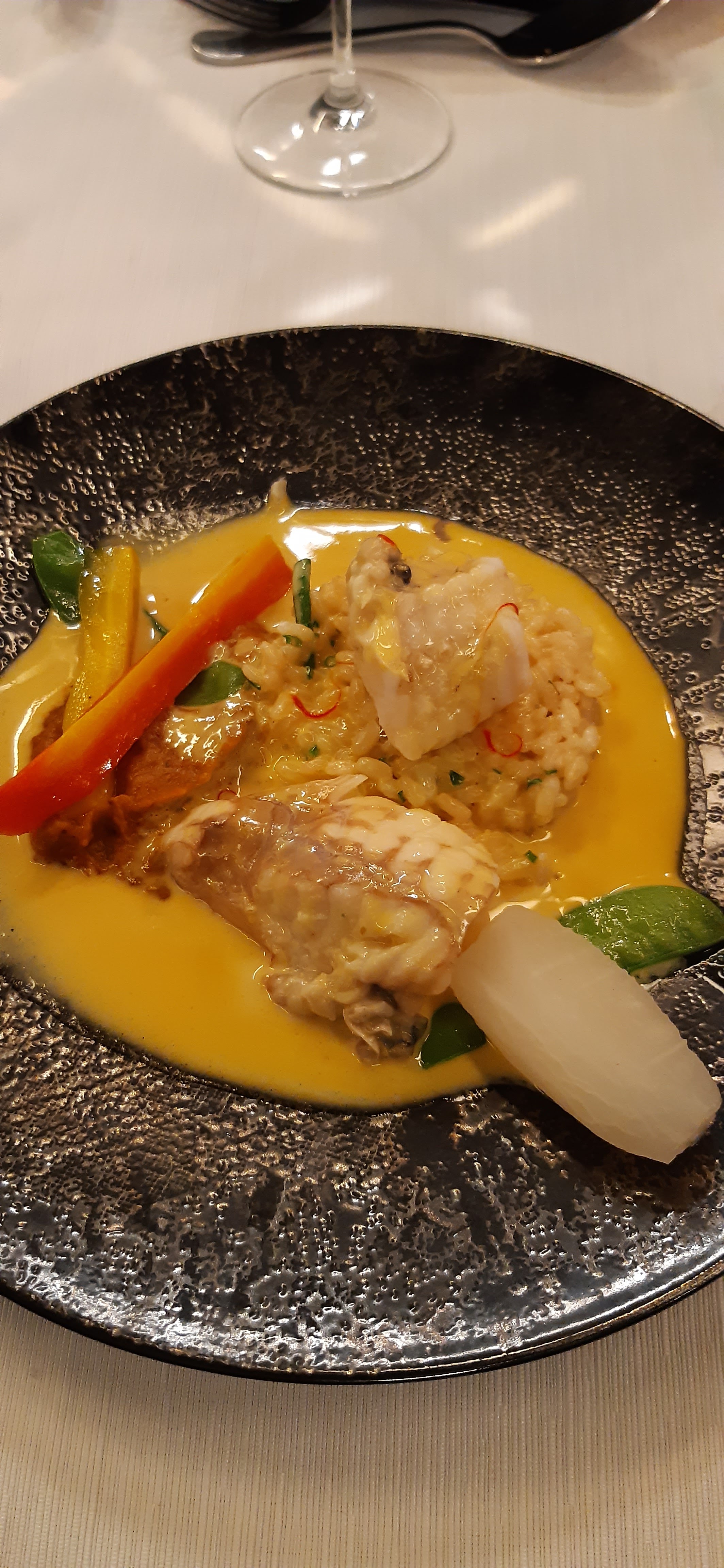 Restaurant plein de charme par le cadre et la présentation des plats. Menu tradition avec en entrée : - la salade tiède de foie gras: en effet le foie gras était chaud et je peux dire que je n'aime pas le foie gras poêlé même si je pense qu'il ets bien fait. Juste une question de texture. Pour le plat: - saumon fontaine, tagliattelles de légumes, crème de moule et risotto au safran: ce qui m'a deplu c'était la cuisson du saumon, mais hyper fondant ! La crème de moule était juste délicieuse. Le risotto au safran aussi. Un régal pour ce plat. Et en dessert... Mélange dans ma tête j'ai pris un baba au rhum en pensant avoir une banane flambée. Alors quand mon dessert est arrivé je pensais que c'était une revisite. Mais non, j'ai mangé pour la première fois un baba au rhum, et je n'ai pas aimé. Mais par contre la chantilly citron vert était super bonne ! Et oui désolée au serveur je n'ai pas aimé le dessert. Sinon il y avait juste une serveuse qui avait l'air pressée. Mais de ce que j'ai vu, le personnel est au petit soin s'il y a le moindre problème il essaie de trouver une solution. Photos: mon repas ainsi que celui de mon copain.