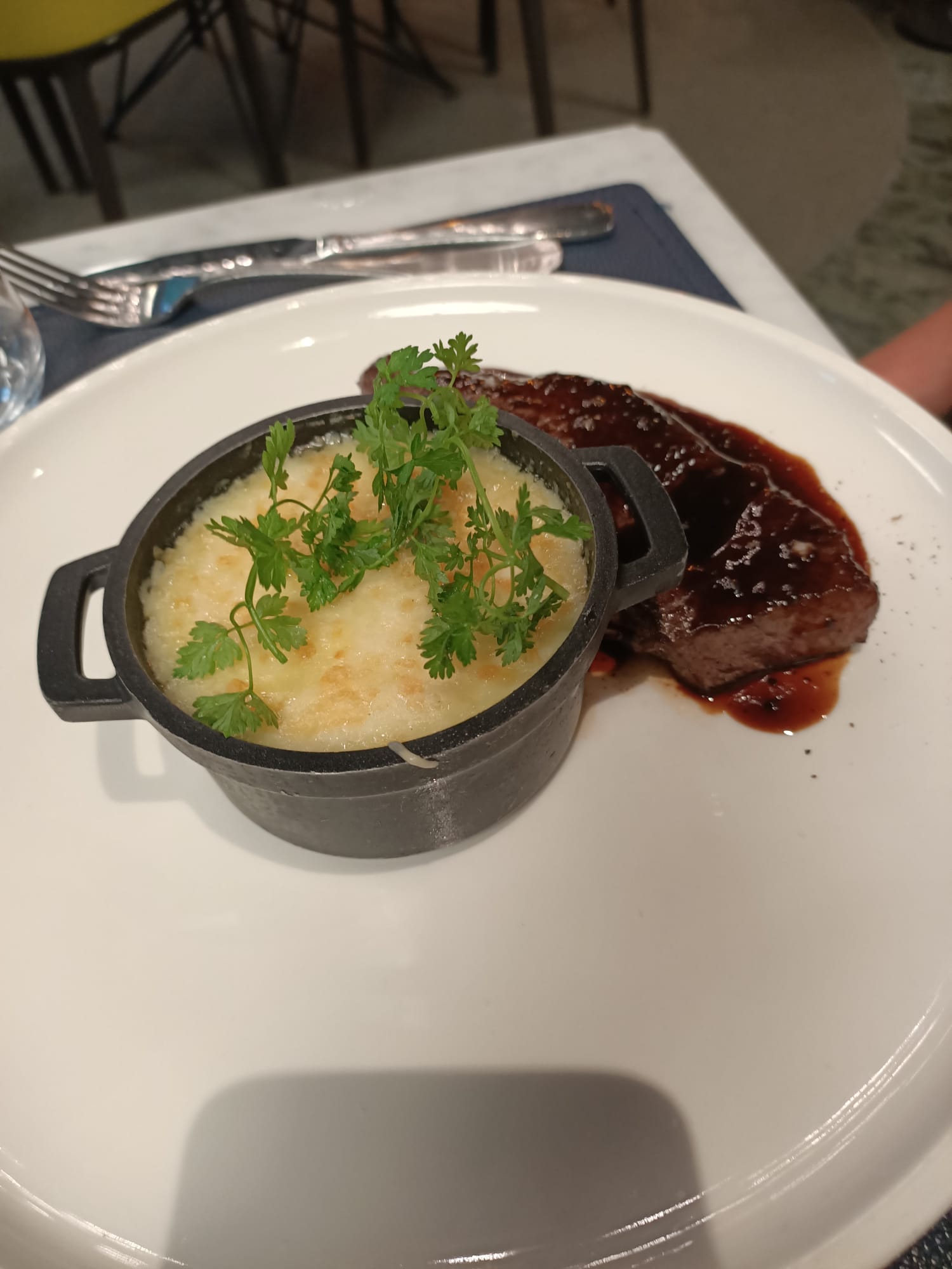 Bonjour, Ce restaurant possède un cadre très agréable et l’intérieur est très classe. Mais le service n’est pas à la hauteur de cet établissement ! Tout d’abord le serveur nous enlève les entrées alors que tout le monde n’as pas finit, sans dire un seul mot ou même un seul regard, ce qui ne se fait absolument pas. Ensuite, le plat arrive dans des délais très corrects mais dans l’assiette, la surprise ! Je commande une viande et je reçois une pièce de graisse sans le moindre morceau de viande, donc immangeable…Résultat des courses, rien de cette assiette n’est mangée à part le peu de purée présente. Décevant sachant que l’entrée était excellente.