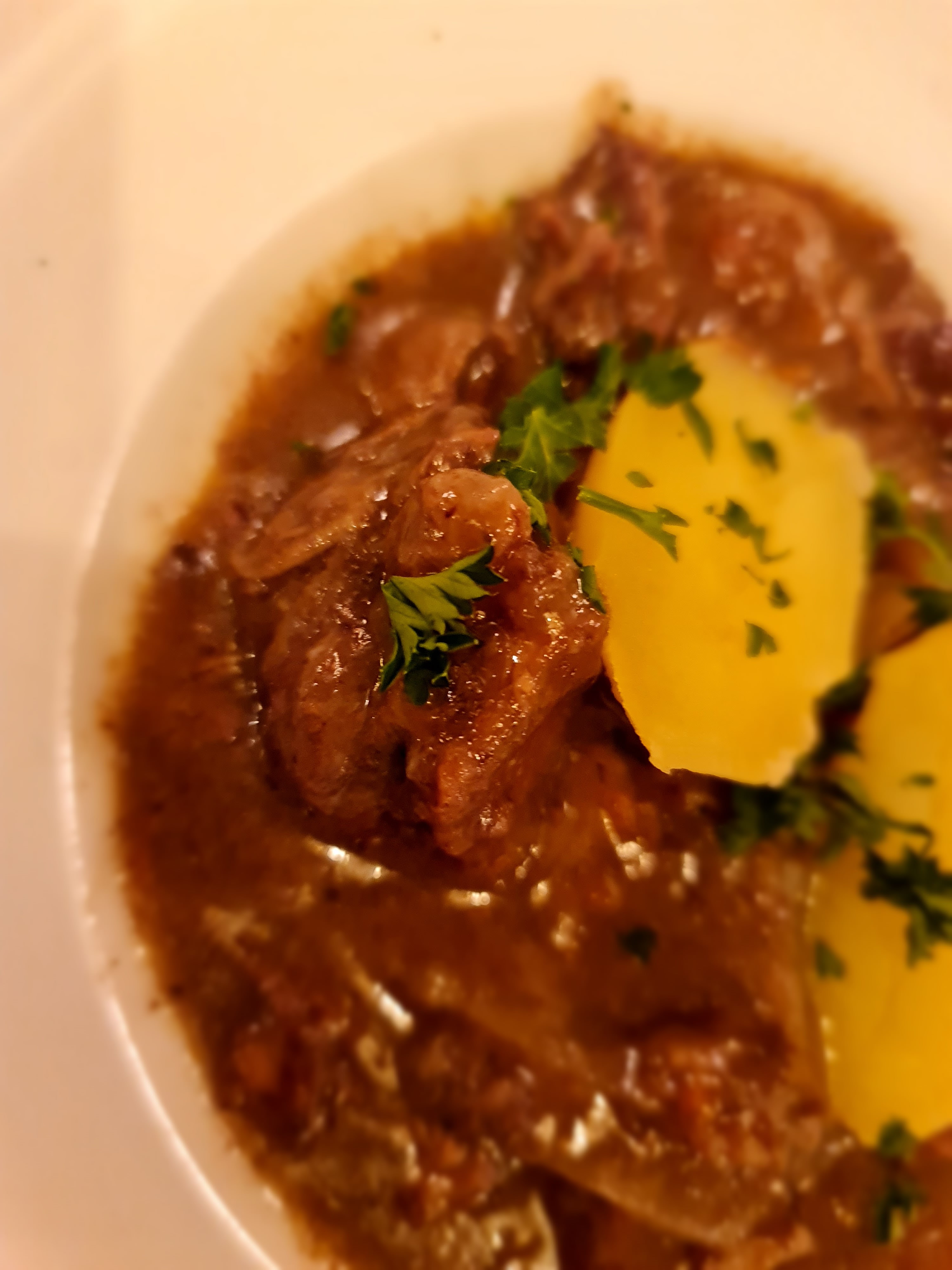 La soupe à l'oignon n'est pas du tout à la hauteur de ce à quoi on s'attend. Bouillon léger et oignons pas assez cuits. Bourguignon allait bien.