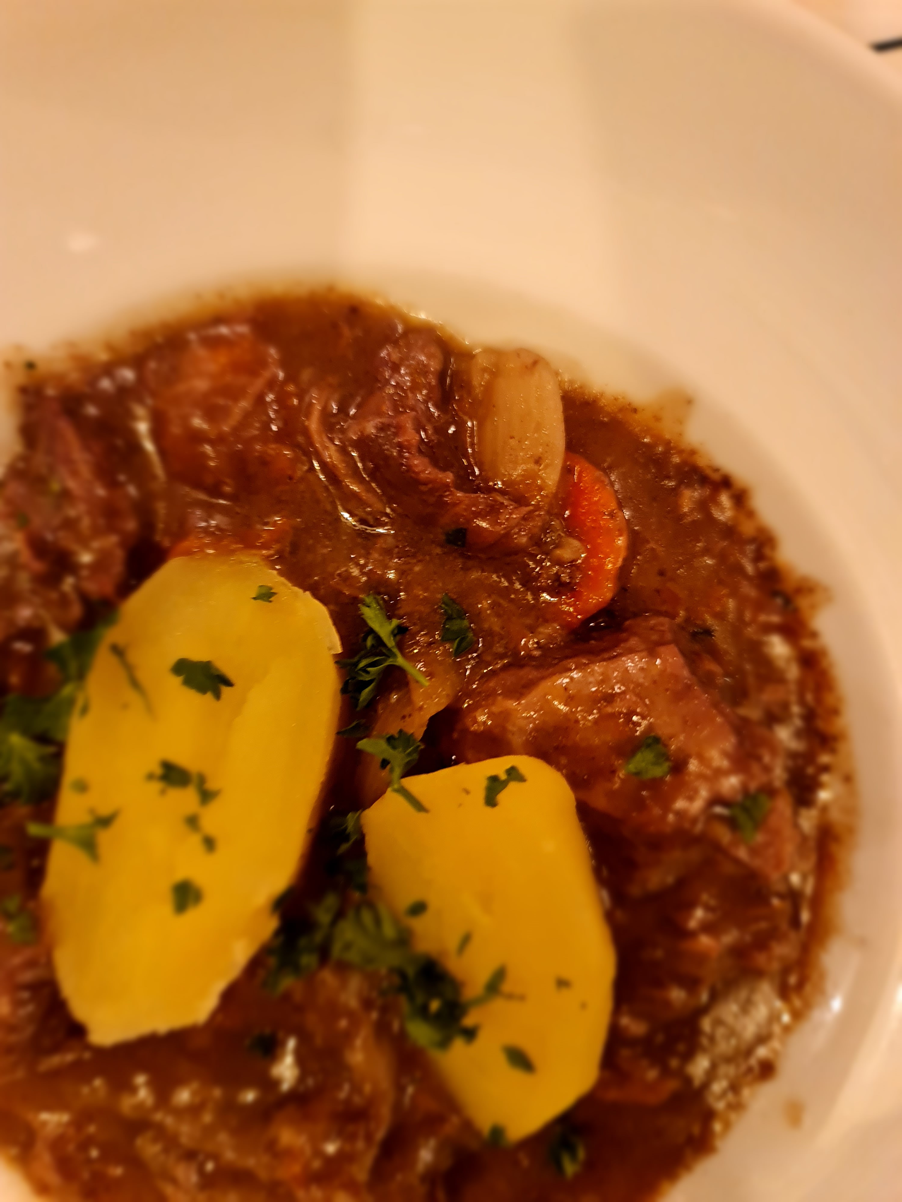 Les boissons étaient servies fraîches et le steak avec des frites était correct. Le Bouef Bourignon était une déception totale. Le Bouef était plein de graisse et de tendons - donc très mal préparé avant la cuisson et les pommes de terre cuites à la vapeur étaient vieilles et trop cuites. Ce n'était pas cuisiné de manière traditionnelle. C'était cuisiné sans amour.