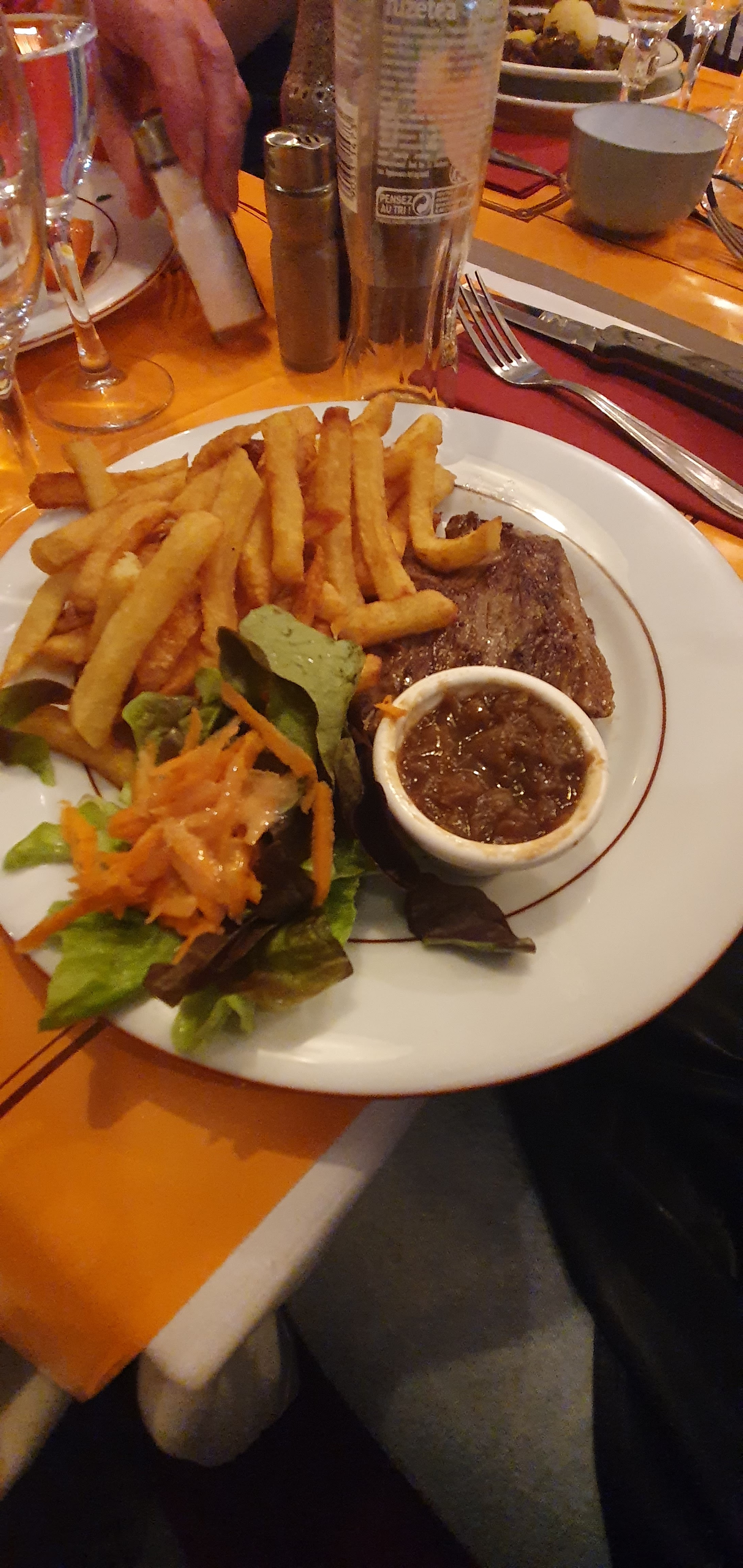 Je mets trois étoiles parce que la viande était bonne, mais le reste était décevant. J'ai conseillé aux personnes avec qui j'allais dîner ce restaurant en me basant sur les avis sur Internet. Une petite déception... L'endroit est sans charme, les tableaux au mur font même saigner les yeux; les serveurs font ce qu'ils peuvent car ils sont débordés. Tout le staff est très poli. La viande était bonne, légèrement en-dessous du bien cuit que j'avais demandé. Les accompagnements étaient oubliables, en particulier la salade. Une des personnes à ma table a demandé l'origine de la viande, et nous n'avons pu avoir de réponse. Nous avons commandé une bouteille de rouge qui ne doit satisfaire que les touristes. Les deux personnes avec moi ont commandé un baba au rhum en dessert, qui était plutôt un rhum au baba, vu la quantité d'alcool, qui aurait achevé un allemand. Note: nous étions assis au fond de la salle, sur une sorte de mezzanine. Il faut absolument éviter la table proche de l'escalier joignant les deux parties de la salle, car la chaise est au bord de l'escalier dans un endroit étriqué, c'est plutôt dangereux.
